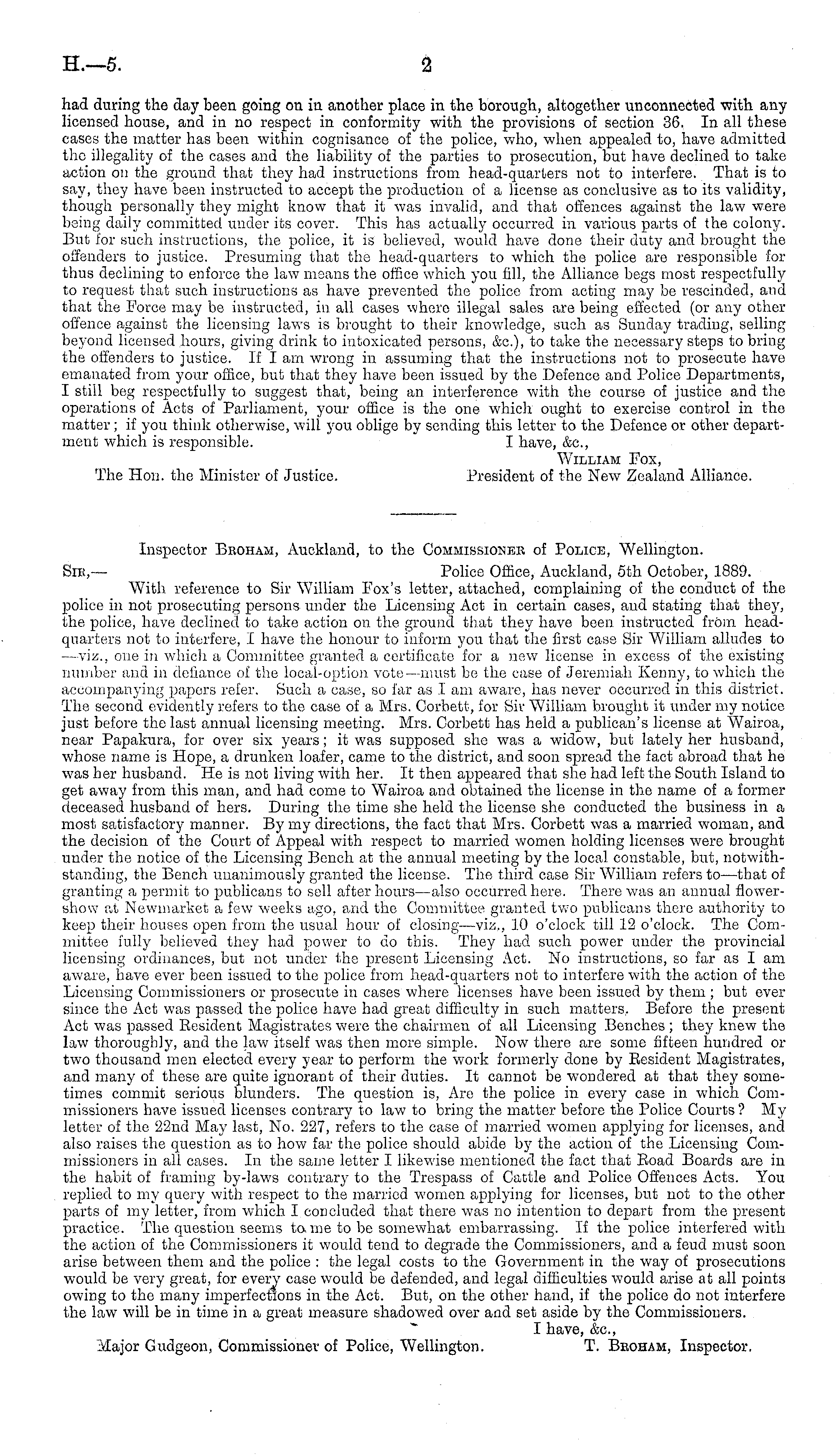 had during the day been going on in another place in the borough, altogether unconnected with anylicensed house, and in no respect in conformity with the provisions of section 36. In all these cases the matter has been within cognisance of the police, who, when appealed to, have admitted the illegality of the cases and the liability of the parties to prosecution, but have declined to take action on the ground that they had instructions from head-quarters not to interfere. That is to say, they have been instructed to accept the production of a license as conclusive as to its validity, though personally they might know that it was invalid, and that offences against the law were being daily committed under its cover. This has actually occurred in various parts of the colony. But for such instructions, the police, it is believed, would have done their duty and brought the offenders to justice. Presuming that the head-quarters to which the police are responsible for thus declining to enforce the law means the office which you fill, the Alliance begs most respectfully to request that such instructions as have prevented the police from acting may be rescinded, and that the Force may be instructed, in all cases where illegal sales are being effected (or any other offence against the licensing laws is brought to their knowledge, such as Sunday trading, selling beyond licensed hours, giving drink to intoxicated persons, &c), to take the necessary steps to bring the offenders to justice. If lam wrong in assuming that the instructions not to prosecute have emanated from your office, but that they have been issued by the Defence and Police Departments, I still beg respectfully to suggest that, being an interference with the course of justice and the operations of Acts of Parliament, your office is the one which ought to exercise control in the matter; if you think otherwise, will you oblige by sending this letter to the Defence or other department which is responsible. I have, &c, William Fox, The Hon. the Minister of Justice. President of the New Zealand Alliance.