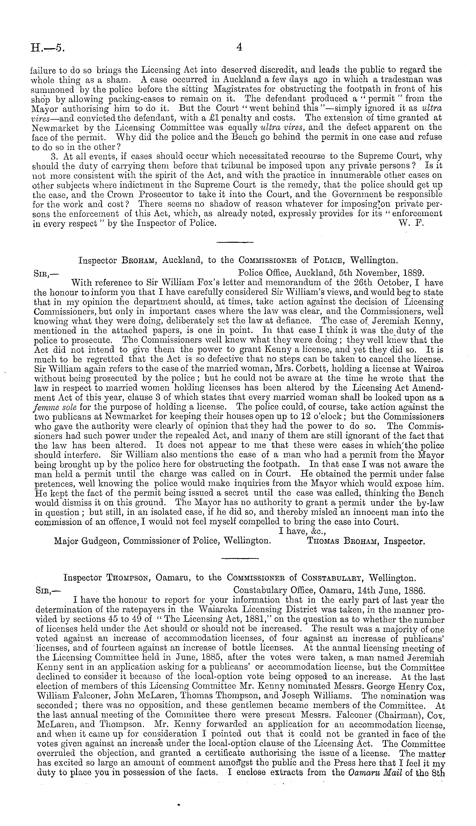 Inspector Thompson, Oamaru, to the Commissioner of Constabulary, Wellington. Sir, — Constabulary Office, Oamaru, 14th June, 1886. I have the honour to report for your information that in the early part of last year the determination of the ratepayers in the Waiareka Licensing District was taken, in the manner provided by sections 45 to 49 of " The Licensing Act, 1881," on the question as to whether the number of licenses held under the Act should or should not be increased. The result was a majority of ono voted against an increase of accommodation licenses, of four against an increase of publicans' licenses, and of fourteen against an increase of bottle licenses. At the annual licensing meeting of the Licensing Committee held in June, 1885, after the votes were taken, a man named Jeremiah Kenny sent in an application asking for a publicans' or accommodation license, but the Committee declined to consider it because of the local-option vote being opposed to an increase. At the last election of members of this Licensing Committee Mr. Kenny nominated Messrs. George Henry Cox, William Falconer, John McLaren, Thomas Thompson, and Joseph Williams. The nomination was seconded; there was no opposition, and these gentlemen became members of the Committee. At the last annual meeting of the Committee there were present Messrs. Falconer (Chairman), Cox, McLaren, and Thompson. Mr. Kenny forwarded an application for an accommodation license, and when it came up for consideration I pointed out that it could not be granted in face of the votes given against an increase under the local-option clause of the Licensing Act. The Committee overruled the objection, and granted a certificate authorising the issue of a license. The matter has excited so large an amount of comment amongst the public and the Press here that I feel it my duty to place you in possession of the facts. I enclose extracts from the Oamaru Mail of the Bth