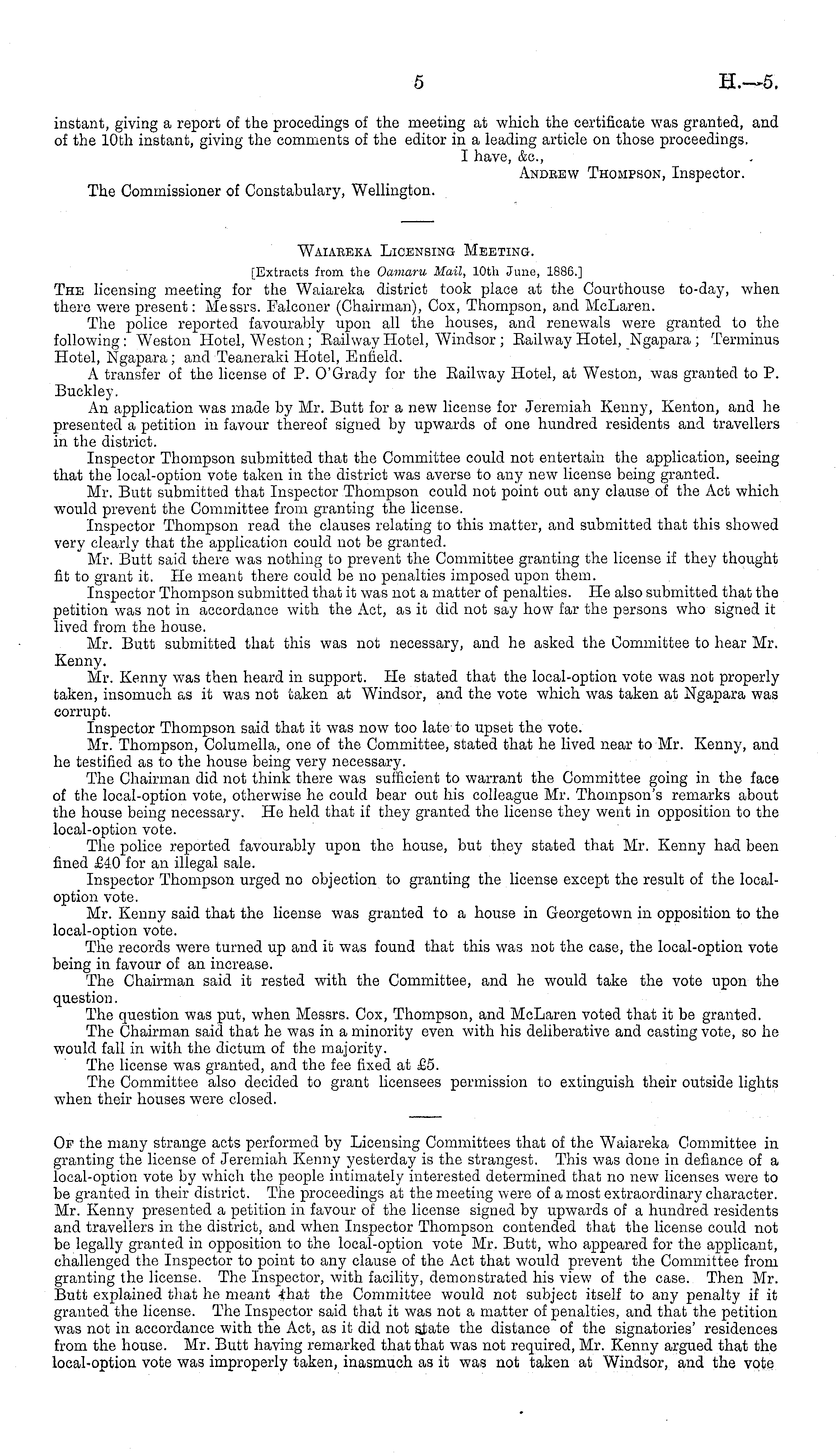 instant, giving a report of the procedings of the meeting at which the certificate was granted, and of the 10th instant, giving the comments of the editor in a leading article on those proceedings. I have, &c, Andrew Thompson, Inspector. The Commissioner of Constabulary, Wellington.