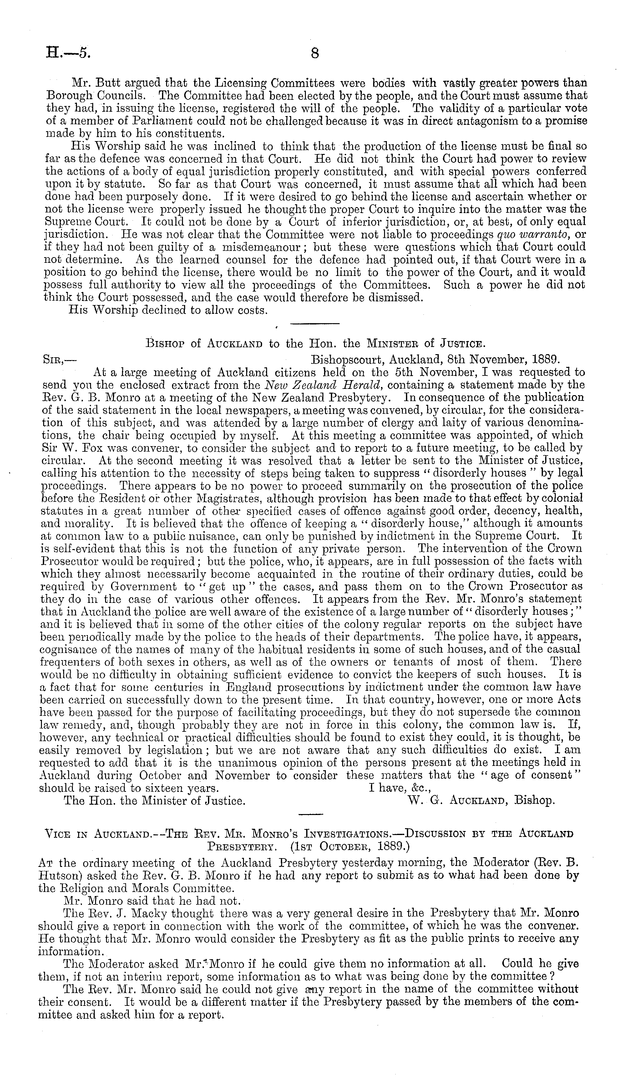 Bishop of Auckland to the Hon. the Minister of Justice. Sir, — Bishopscourt, Auckland, Bth November, 1889. At a large meeting of Auckland citizens held on the sth November, I was requested to send you the enclosed extract from the Neio Zealand Herald, containing a statement made by the Rev. G. B. Monro at a meeting of the New Zealand Presbytery. In consequence of the publication of the said statement in the local newspapers, a meeting was convened, by circular, for the consideration of this subject, and was attended by a large number of clergy and laity of various denominations, the chair being occupied by myself. At this meeting a committee was appointed, of which Sir W. Fox was convener, to consider the subject and to report to a future meeting, to be called by circular. At the second meeting it was resolved that a letter be sent to the Minister of Justice, calling his attention to the necessity of steps being taken to suppress " disorderly houses " by legal proceedings. There appears to be no power to proceed summarily on the prosecution of the police Before the Resident or other Magistrates, although provision has been made to that effect by colonial statutes in a great number of other specified cases of offence against good order, decency, health, and morality. It is believed that the offence of keeping a " disorderly house," although it amounts at common law to a public nuisance, can only be punished by indictment in the Supreme Court. It is self-evident that this is not the function of any private person. The intervention of the Crown Prosecutor would be required ; but the police, who, it appears, are in full possession of the facts with which they almost necessarily become acquainted in the routine of their ordinary duties, could be required by Government to " get up " the cases, and pass them on to the Crown Prosecutor as they do in the case of various other offences. It appears from the Rev. Mr. Monro's statement that in Auckland the police are well aware of the existence of a large number of" disorderly houses;" and it is believed that in some of the other cities of the colony regular reports on the subject have been periodically made by the police to the heads of their departments. The police have, it appears, cognisance of the names of many of the habitual residents in some of such houses, and of the casual frequenters of both sexes in others, as well as of the owners or tenants of most of them. There would be no difficulty in obtaining sufficient evidence to convict the keepers of such houses. It is a fact that for some centuries in England prosecutions by indictment under the common law have been carried on successfully down to the present time. In that country, however, one or more Acts have been passed for the purpose of facilitating proceedings, but they do not supersede the common law remedy, and, though probably they aro not in force in this colony, the common law is. If, however, any technical or practical difficulties should be found to exist they could, it is thought, be easily removed by legislation ; but we are not aware that any such difficulties do exist. lam requested to add that it is the unanimous opinion of the persons present at the meetings held in Auckland during October and November to consider these matters that the " age of consent" should be raised to sixteen years. I have, &c, The Hon. the Minister of Justice. W. G. Auckland, Bishop.