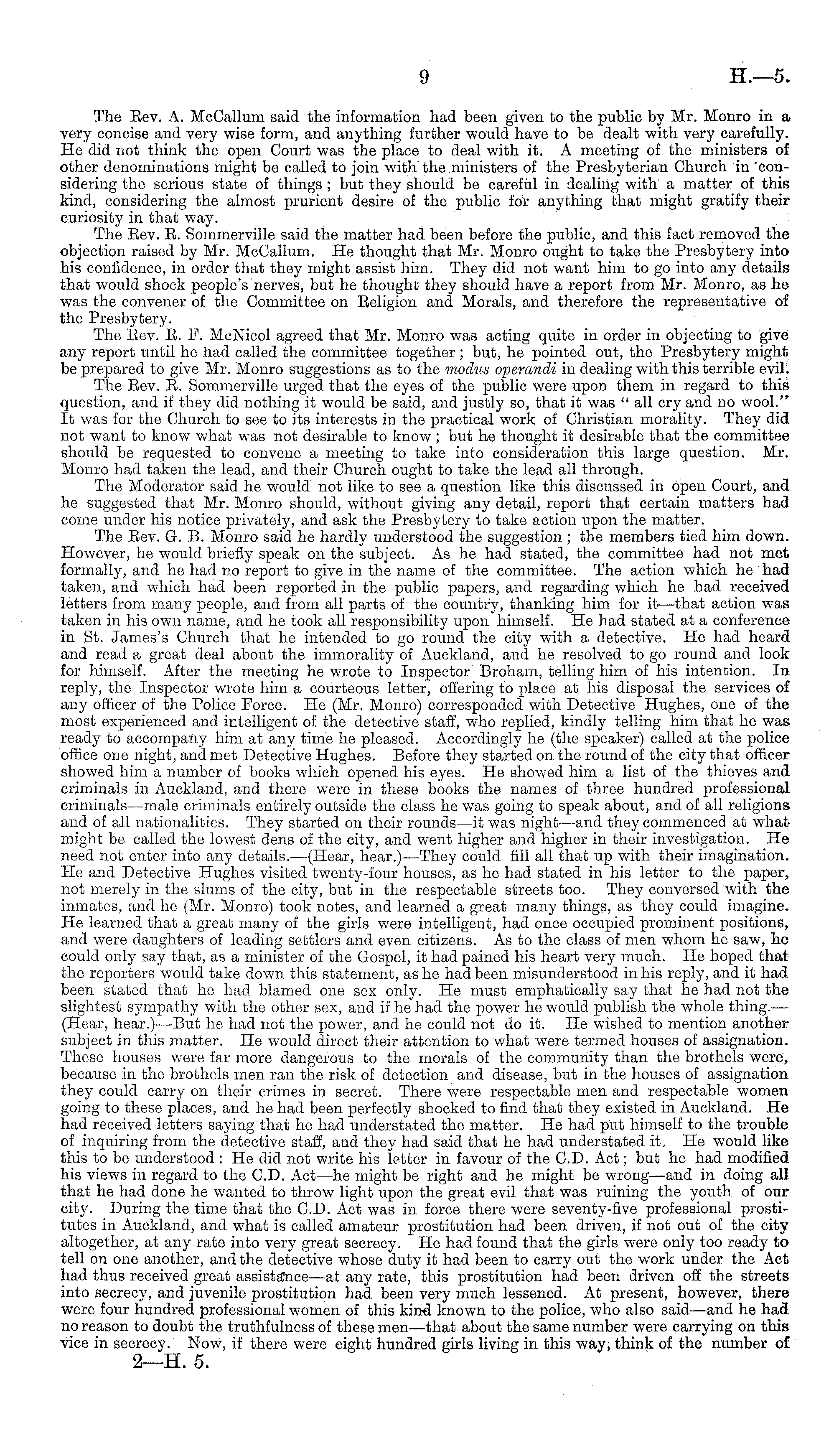 The Rev. A. McCallum said the information had been given to the public by Mr. Monro in a very concise and very wise form, and anything further would have to be dealt with very carefully. He did not think the open Court was the place to deal with it. A meeting of the ministers of other denominations might be called to join with the ministers of the Presbyterian Church in 'considering the serious state of things ; but they should be careful in dealing with a matter of this kind, considering the almost prurient desire of the public for anything that might gratify their curiosity in that way. The Rev. E. Sommerville said the matter had been before the public, and this fact removed the objection raised by Mr. McCallum. He thought that Mr. Monro ought to take the Presbytery into his confidence, in order that they might assist him. They did not want him to go into any details that would shock people's nerves, but he thought they should have a report from Mr. Monro, as he was the convener of the Committee on Religion and Morals, and therefore the representative of the Presbytery. The Rev. R. F. McNicol agreed that Mr. Monro was acting quite in order in objecting to give any report until he had called the committee together ; but, he pointed out, the Presbytery might be prepared to give Mr. Monro suggestions as to the modus operandi in dealing with this terrible evil. The Rev. R. Sommerville urged that the eyes of the public were upon them in regard to this question, and if they did nothing it would be said, and justly so, that it was " all cry and no wool." It was for the Church to see to its interests in the practical work of Christian morality. They did not want to know what was not desirable to know ; but he thought it desirable that the committee should be requested to convene a meeting to take into consideration this large question. Mr. Monro had taken the lead, and their Church ought to take the lead all through. The Moderator said he would not like to see a question like this discussed in open Court, and he suggested that Mr. Monro should, without giving any detail, report that certain matters had come under his notice privately, and ask the Presbytery to take action upon the matter. The Rev. G. B. Monro said he hardly understood the suggestion ; the members tied him down. However, he would briefly speak on the subject. As he had stated, the committee had not met formally, and he had no report to give in the name of the committee. The action which he had taken, and which had been reported in the public papers, and regarding which he had received letters from many people, and from all parts of the country, thanking him for it —that action was taken in his own name, and he took all responsibility upon himself. He had stated at a conference in St. James's Church that he intended to go round the city with a detective. He had heard and read a great deal about the immorality of Auckland, and he resolved to go round and look for himself. After the meeting he wrote to Inspector Broham, telling him of his intention. In reply, the Inspector wrote him a courteous letter, offering to place at his disposal the services of any officer of the Police Force. He (Mr. Monro) corresponded with Detective Hughes, one of the most experienced and intelligent of the detective staff, who replied, kindly telling him that he w 7as ready to accompany him at any time he pleased. Accordingly he (the speaker) called at the police office one night, and met Detective Hughes. Before they started on the round of the city that officer showed him a number of books which opened his eyes. He showed him a list of the thieves and criminals in Auckland, and there were in these books the names of three hundred professional criminals—male criminals entirely outside the class he was going to speak about, and of all religions and of all nationalities. They started on their rounds —it was night—and they commenced at what might be called the lowest dens of the city, and went higher and higher in their investigation. He need not enter into any details.—(Hear, hear.) —They could fill all that up with their imagination. He and Detective Hughes visited twenty-four houses, as he had stated in his letter to the paper, not merely in the slums of the city, but in the respectable streets too. They conversed with the inmates, and he (Mr. Monro) took notes, and learned a great many things, as they could imagine. He learned that a great many of the girls were intelligent, had once occupied prominent positions, and were daughters of leading settlers and even citizens. As to the class of men whom he saw, he could only say that, as a minister of the Gospel, it had pained his heart very much. He hoped thatthe reporters would take down this statement, as he had been misunderstood in his reply, and it had been stated that he had blamed one sex only. He must emphatically say that he had not the slightest sympathy with the other sex, and if he had the power he would publish the whole thing.— (Hear, hear.) —But he had not the power, and he could not do it. He wished to mention another subject in this matter. He would direct their attention to what were termed houses of assignation. These houses were far more dangerous to the morals of the community than the brothels were, because in the brothels men ran the risk of detection and disease, but in the houses of assignation they could carry on their crimes in secret. There were respectable men and respectable women going to these places, and he had been perfectly shocked to find that they existed in Auckland. He had received letters saying that he had understated the matter. He had put himself to the trouble of inquiring from the detective staff, and they had said that he had understated it. He would like this to be understood :He did not write his letter in favour of the CD. Act; but he had modified his views in regard to the CD. Act—he might be right and he might be wrong—and in doing all 