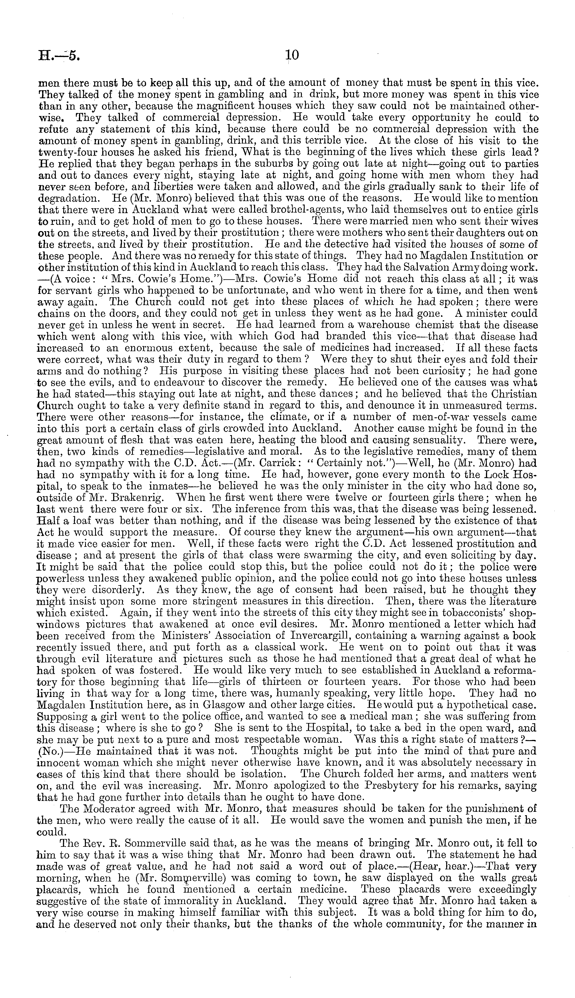 men there must be to keep all this up, and of the amount of money that must be spent in this vice. They talked of the money spent in gambling and in drink, but more money was spent in this vice than in any other, because the magnificent houses which they saw could not be maintained otherwise. They talked of commercial depression. He would take every opportunity he could to refute any statement of this kind, because there could be no commercial depression with the amount of money spent in gambling, drink, and this terrible vice. At the close of his visit to the twenty-four houses he asked his friend, What is the beginning of the lives which these girls lead ? He replied that they began perhaps in the suburbs by going out late at night—going out to parties and out to dances every night, staying late at night, and going home with men whom they had never seen before, and liberties were taken and allowed, and the girls gradually sank to their life of degradation. He (Mr. Monro) believed that this was one of the reasons. He would like to mention that there were in Auckland what were called brothel-agents, who laid themselves out to entice girls to ruin, and to get hold of men to go to these houses. There were married men who sent their wives out on the streets, and lived by their prostitution ; there were mothers who sent their daughters out on the streets, and lived by their prostitution. He and the detective had visited the houses of some of these people. And there was no remedy for this state of things. They had no Magdalen Institution or other institution of this kind in Auckland to reach this class. They had the Salvation Army doing work. —(A voice : " Mrs. Cowie's Home.") —Mrs. Cowie's Home did not reach this class at all; it was for servant girls who happened to be unfortunate, and who went in there for a time, and then went away again. The Church could not get into these places of which he had spoken; there were chains on the doors, and they could not get in unless they went as he had gone. A minister could never get in unless he went in secret. He had learned from a warehouse chemist that the disease which went along with this vice, with which God had branded this vice—that that disease had increased to an enormous extent, because the sale of medicines had increased. If all these facts were correct, what was their duty in regard to them ? Were they to shut their eyes and fold their arms and do nothing ? His purpose in visiting these places had not been curiosity; he had gone to see the evils, and to endeavour to discover the remedy. He believed one of the causes was what he had stated—this staying out late at night, and these dances; and he believed that the Christian Church ought to take a very definite stand in regard to this, and denounce it in unmeasured terms. There were other reasons—for instance, the climate, or if a number of men-of-war vessels came into this port a certain class of girls crowded into Auckland. Another cause might be found in the great amount of flesh that was eaten here, heating the blood and causing sensuality. There were, then, two kinds of remedies—legislative and moral. As to the legislative remedies, many of them had no sympathy with the CD. Act.—(Mr. Carrick: " Certainly not.") —Well, ho (Mr. Monro) had had no sympathy with it for a long time. He had, however, gone every month to the Lock Hospital, to speak to the inmates—he believed he was the only minister in the city who had done so, outside of Mr. Brakenrig. When he first went there were twelve or fourteen girls there; when he last went there were four or six. The inference from this was, that the disease was being lessened. Half a loaf was better than nothing, and if the disease was being lessened by the existence of that Act he would support the measure. Of course they knew the argument—his own argument—that it made vice easier for men. Well, if these facts were right the CD. Act lessened prostitution and disease ; and at present the girls of that class were swarming the city, and even soliciting by day. It might be said that the police could stop this, but the police could not do it; the police were powerless unless they awakened public opinion, and the police could not go into these houses unless they were disorderly. As they knew, the age of consent had been raised, but he thought they might insist upon some more stringent measures in this direction. Then, there was the literature which existed. Again, if they went into the streets of this city they might see in tobacconists' shopwindows pictures that awakened at once evil desires. Mr. Monro mentioned a letter which had been received from the Ministers' Association of Invercargill, containing a warning against a book recently issued there, and put forth as a classical work. He went on to point out that it was through evil literature and pictures such as those he had mentioned that a great deal of what he had spoken of was fostered. He would like very much to see established in Auckland a reformatory for those beginning that life—girls of thirteen or fourteen years. For those who had been living in that way for a long time, there was, humanly speaking, very little hope. They had no Magdalen Institution here, as in Glasgow and other large cities. He would put a hypothetical case. Supposing a girl went to the police office, and wanted to see a medical man; she was suffering from this disease ; where is she to go ? She is sent to the Hospital, to take a bed in the open ward, and she may be put next to a pure and most respectable woman. Was this a right state of matters ?— (No.) —He maintained that it was not. Thoughts might be put into the mind of that pure and innocent woman which she might never otherwise have known, and it was absolutely necessary in cases of this kind that there should be isolation. The Church folded her arms, and matters went on, and the evil was increasing. Mr. Monro apologized to the Presbytery 