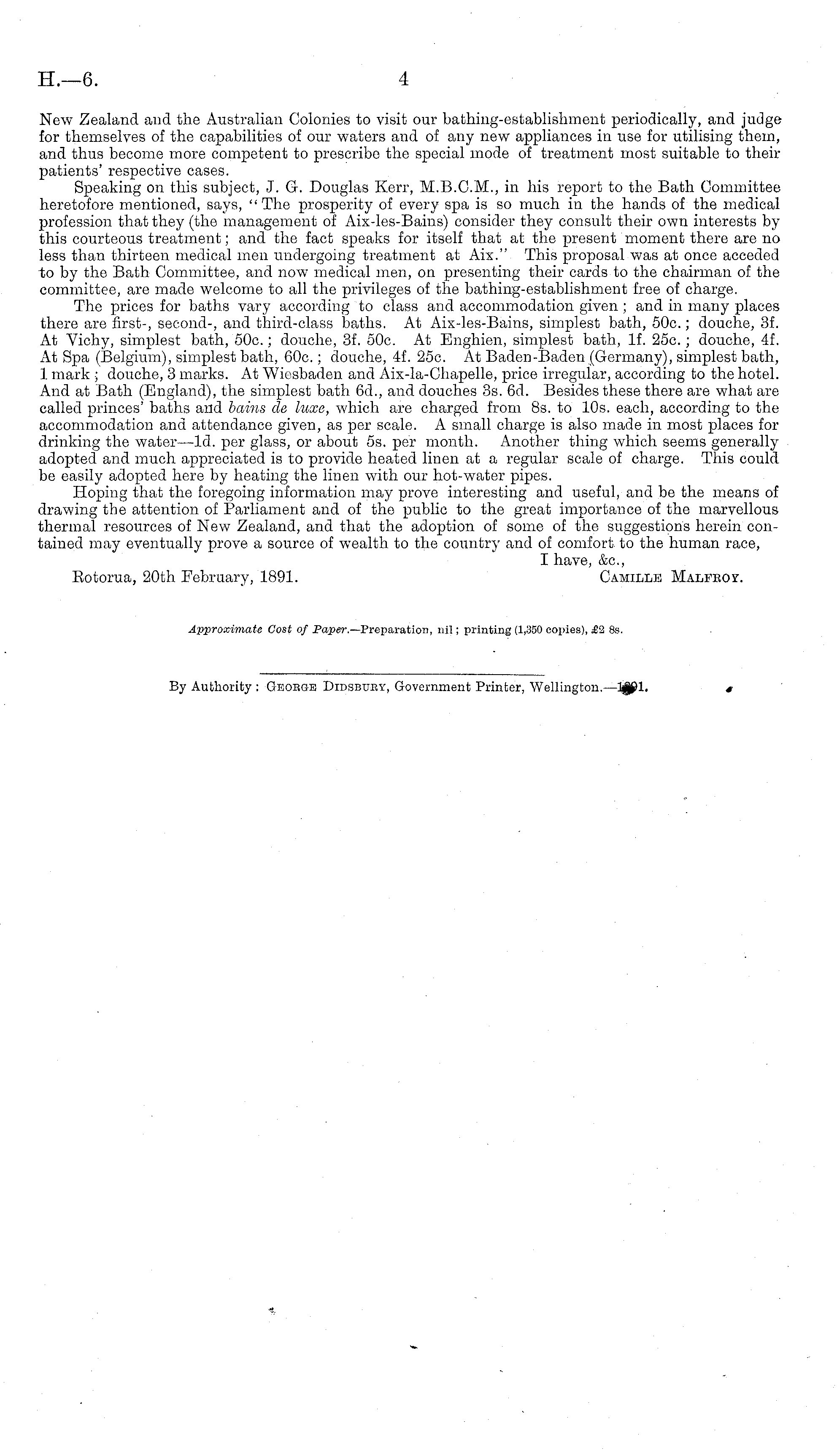 New Zealand and the Australian Colonies to visit our bathing-establishment periodically, and judge for themselves of the capabilities of our waters and of any new appliances in use for utilising them, and thus become more competent to prescribe the special mode of treatment most suitable to their patients' respective cases. Speaking on this subject, J. G. Douglas Kerr, M.8.G.M., in his report to the Bath Committee heretofore mentioned, says, "The prosperity of every spa is so much in the hands of the medical profession that they (the management of Aix-les-Bains) consider they consult their own interests by this courteous treatment; and the fact speaks for itself that at the present moment there are no less than thirteen medical men undergoing treatment at Aix." This proposal was at once acceded to by the Bath Committee, and now medical men, on presenting their cards to the chairman of the committee, are made welcome to all the privileges of the bathing-establishment free of charge. The prices for baths vary according to class and accommodation given ; and in many places there are first-, second-, and third-class baths. At Aix-les-Bains, simplest bath, 50c.; douche, 3f. At Vichy, simplest bath, 50c.; douche, 3f. 50c. At Enghien, simplest bath, If. 25c. ; douche, 4f. At Spa (Belgium), simplest bath, 60c; douche, 4f. 25c. At Baden-Baden (Germany), simplest bath, 1 mark ; douche, 3 marks. At Wiesbaden and Aix4a-Chapelle, price irregular, according to the hotel. And at Bath (England), the simplest bath 6d., and douches 3s. 6d. Besides these there are what are called princes' baths and bains de luxe, which are charged from Bs. to 10s. each, according to the accommodation and attendance given, as per scale. A small charge is also made in most places for drinking the water—ld. per glass, or about ss. per month. Another thing which seems generally adopted and much appreciated is to provide heated linen at a regular scale of charge. This could be easily adopted here by heating the linen with our hot-water pipes. Hoping that the foregoing information may prove interesting and useful, and be the means of drawing the attention of Parliament and of the public to the great importance of the marvellous thermal resources of New Zealand, and that the adoption of some of the suggestions herein contained may eventually prove a source of wealth to the country and of comfort to the human race, I have, &c, Eotorua, 20th February, 1891. Camille Malfeoy. Approximate Cost of Paper.— Preparation, nil; printing (1,350 copies), £2 Bs.