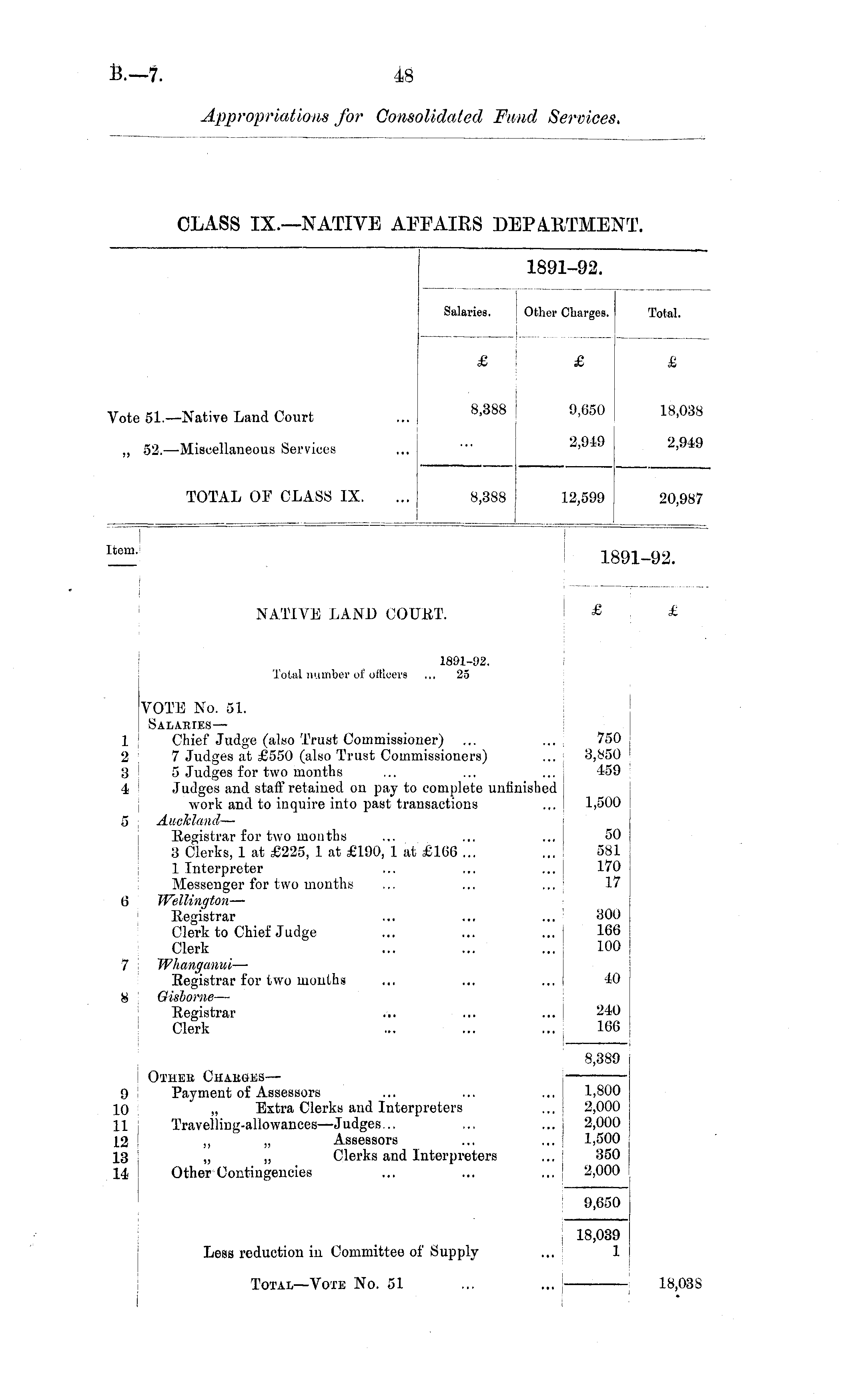 1891-92. Salaries. Other Charges. Total. £ £ £ 8,388 9,650 18,038 ote 51. —Native Land Court ,, 52. —Miscellaneous Services 2,949 2,949 TOTAL OF CLASS IX. 8,388 12,599 20,987 I Item. > rt wi I _ 1891-92. NATIVE LAND COURT. £ i £ 1891-92. Tola! number of officers ... 25 VOTE No. 51. Salaries — 1 Chief Judge (also Trust Commissioner) ... ... 750 2 ; 7 Judges at £550 (also Trust Commissioners) ... 3,850 ' 3 ' 5 Judges for two months ... ... ... j 459 4 ' Judges and staft' retained on pay to complete unfinished work and to inquire into past transactions ... 1,500 5 Auckland — Registrar for two months ... ... ... 50 3 Clerks, 1 at £225, 1 at £190, 1 at £106... ... 581 1 Interpreter ... ... ... 170 Messenger for two months ... ... ... 17 6 Wellington — Registrar ... ... ... ! 300 Clerk to Chief Judge ... ... ... 166 Clerk ... ... ... 100 7 Whanganui — Registrar for two months ... ... ... 40 8 ; Oisborne— Registrar ... ... ... 240 Clerk ... ... ... ; 166 8,389 j Otkeb Chakges— 9 i Payment of Assessors ... ... ... 1,800 10 „ Extra Clerks and Interpreters ... 2,000 11 Travelling-allowances —Judges... ... ... j 2,000 12 ,, „ Assessors ... ... | 1,500 13 „ ,, Clerks and Interpreters ... | 350 14 Other Contingencies ... ... ... [ 2,000 9,650 18,039 Less reduction in Committee of Supply ... 1 Total—Vote No. 51 ... ... \ 18,03S