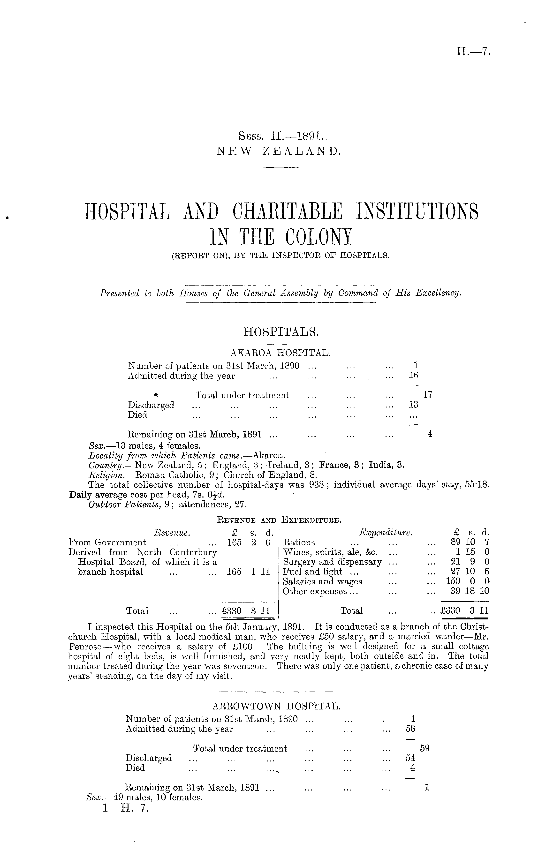 HOSPITALS. AKAEOA HOSPITAL. Number of patients on 31st March, 1890 ... ... ... 1 Admitted during the year ... ... ... ... 16 Total under treatment ... ... ... 17 Discharged ... ... ... ... ... ... 13 Died ... ... ... ... ... Eemaining on 31st March, 1891 ... ... ... ... 4 Sea;. —13 males, 4 females. Locality from which Patients came. —Akaroa. Country. —New Zealand, 5 ; England, 3 ; Ireland, 3 ; France, 3 ; India, 3. Religion. —Eoman Catholic, 9; Church of England, 8. The total collective number of hospital-days was 938 ; individual average days' stay, 55-18. Daily average cost per head, 7s. OJd. Outdoor Patients, 9; attendances, 27. Ebvence and Expendituee. Revenue. £ s. d. Expenditure. £ s. d. From Government ... ... 165 2 0 Eations ... ... ... 89 10 7 Derived from North Canterbury Wines, spirits, ale, &c. ... ... 1 15 0 Hospital Board, of which it is a Surgery and dispensary ... ... 2190 branch hospital ... ... 165 111 Fuel and light ... ... ... 27 10 6 Salaries and wages ... ... 150 0 0 Other expenses... ... ... 39 18 10 Total ... ... £330 3 11 Total ... ... £330 3 11 I inspected this Hospital on the sth January, 1891. It is conducted as a branch of the Christchurch Hospital, with a local medical man, who receives £50 salary, and a married warder—Mr. Penrose —who receives a salary of £100. The building is well designed for a small cottage hospital of eight beds, is well furnished, and very neatly kept, both outside and in. The total number treated during the year was seventeen. There was only one patient, a chronic case of many years' standing, on the day of my visit.