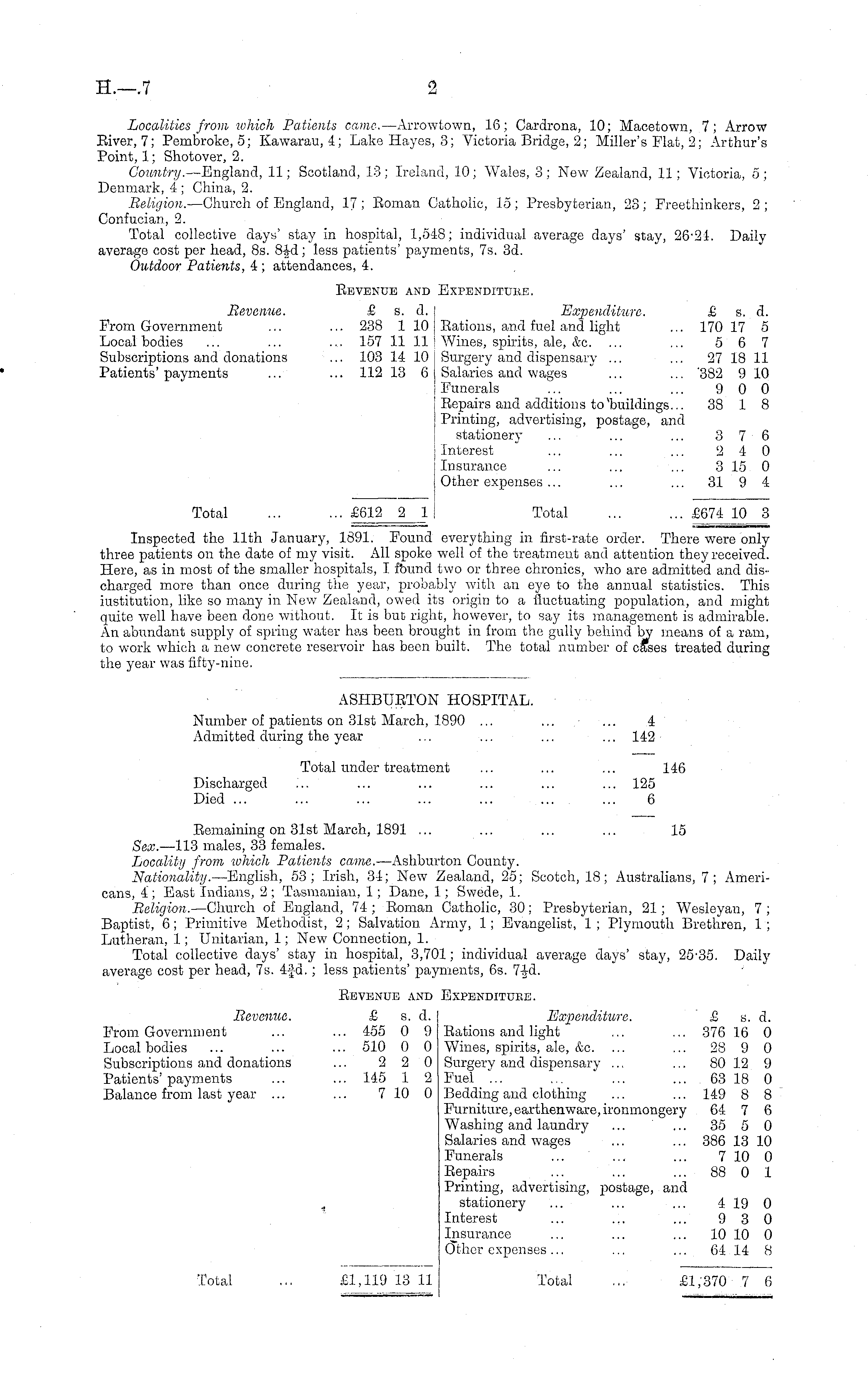 Localities from which Patients came. —Arrowtown, 16; Oardrona, 10; Macetown, 7; Arrow Eiver, 7; Pembroke, 5; Kawarau, 4; Lake Hayes, 3; Victoria Bridge, 2; Miller's Flat, 2; Arthur's Point, 1; Shotover, 2. Country. —England, 11; Scotland, 13 : Ireland, 10 ; Wales, 3 : New Zealand, 11; Victoria, 5 ; Denmark, 4; China, 2. Religion. —Church of England, 17; Eoman Catholic, 15; Presbyterian, 23; Freethinkers, 2; Confucian, 2. Total collective days' stay in hospital, 1,548; individual average clays' stay, 26-24. Dailyaverage cost per head, Bs. &Jd; less patients' payments, 7s. 3d. Outdoor Patients, 4 ; attendances, 4. Eevenue and Expenditure. Revenue. £ s. d. Expenditure. £ s. d. From Government ... ... 238 1 10 Eations, and fuel and light ... 170 17 5 Local bodies ... ... ... 157 11 11 ! Wines, spirits, ale, &c. ... ... 5 6 7 Subscriptions and donations ... 103 14 10 Surgery and dispensary ... ... 27 18 11 Patients'payments ... ... 112 13 6 Salaries and wages ... ... '382 9 10 \ Funerals ... ... ... 9 0 0 Repairs and additions to 38 1 8 Printing, advertising, postage, and stationery ... ... ... 376 Interest ... ... ... 2 4 0 Insurance ... ... ... 3 15 0 Other expenses... ... ... 31 9 4 Total ... ... £612 2 1 j Total ... ...£674 10 3 Inspected the 11th January, 1891. Found everything in first-rate order. There were only three patients on the date of my visit. All spoke well of the treatment and attention they received. Here, as in most of the smaller hospitals, I found two or three chronics, who are admitted and discharged more than once during the year, probably with an eye to the annual statistics. This iustitution, like so many in New Zealand, owed its origin to a fluctuating population, and might quite well have been done without. It is but right, however, to say its management is admirable. An abundant supply of spring water has been brought in from the gully behind by means of a ram, to work which a new concrete reservoir has been built. The total number of cases treated during the year was fifty-nine.