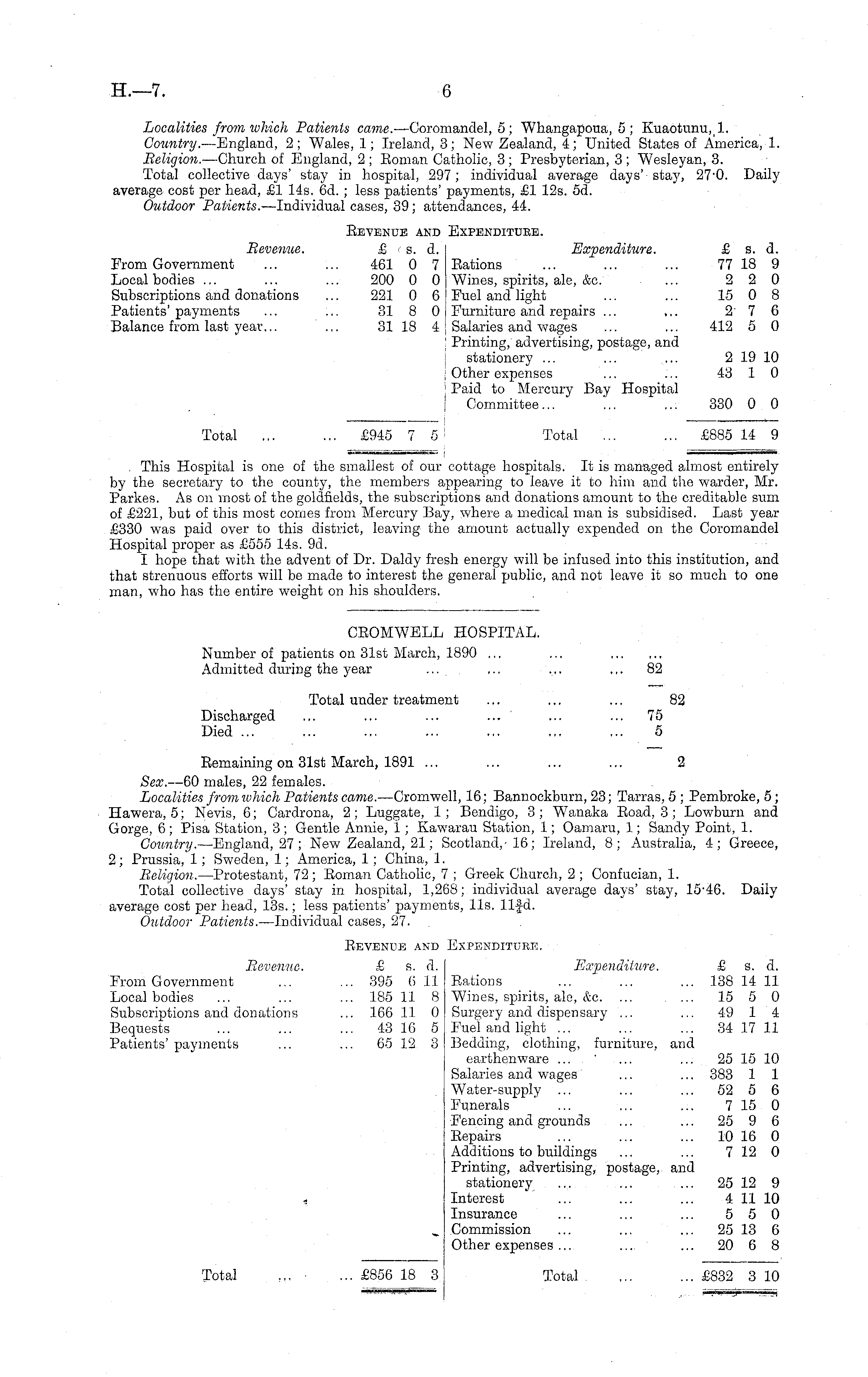 CEOMWELL HOSPITAL. Number of patients on 31st March, 1890 ... ... Admitted during the year ... ~. ... ... 82 Total under treatment ... ... ... 82 Discharged ... ... ... ... ... ... 75 Died 5 Bemaining on 31st March, 1891 ... ... ... ... 2 Sex. —6o males, 22 females. Localities from which Patients came,. —Cromwell, 16; Bannockburn, 23; Tarras, 5 ; Pembroke, 5; Hawera, 5; Nevis, 6; Cardrona, 2; Luggate, 1; Bendigo, 3; Wanaka Road, 3; Lowburn and Gorge, 6; Pisa Station, 3; Gentle Annie, 1 ; Kawarau Station, 1; Oainaru, 1; Sandy Point, 1. Country. —England, 27; New Zealand, 21; Scotland,-16; Ireland, 8; Australia, 4; Greece, 2; Prussia, 1; Sweden, 1; America, 1; China, 1. Religion. —Protestant, 72; Eoman Catholic, 7 ; Greek Church, 2 ; Confucian, 1. Total collective days' stay in hospital, 1,268; individual average days' stay, 15-46. Daily average cost per head, 135.; less patients' payments, 11s. llfd. Outdoor Patients. —Individual cases, 27. Revenue and Expenditure. Revenue. & s. d. Expenditure. £ s. d. From Government ... ... 395 (5 11 Rations ... ... ... 138 14 11 Local bodies ... ... ... 185 11 8 Wines, spirits, ale, &c. ... ... 15 5 0 Subscriptions and donations ... 166 11 0 Surgery and dispensary ... ... 49 1 4 Bequests ... ... ... 43 16 5 Fuel and light ... ... ... 34 17 11 Patients' payments ... ... 65 12 3 Bedding, clothing, furniture, and earthenware ... ... ... 25 15 10 Salaries and wages ... ... 383 1 1 Water-supply ... ... ... 52 5 6 Funerals ... ... ... 7 15 0 Fencing and grounds ... ... 25 9 6 Repairs ... ... ... 10 16 0 Additions to buildings ... ... 712 0 Printing, advertising, postage, and stationery ... ... ... 25 12 9 Interest ... ... ... 4 11 10 Insurance ... ... ... 550 „ Commission ... ... ... 25 13 6 Other expenses ... ... ... 20 6 8 Total ;,, ■ ... £856 18 3 Total ... ... £832 3 10