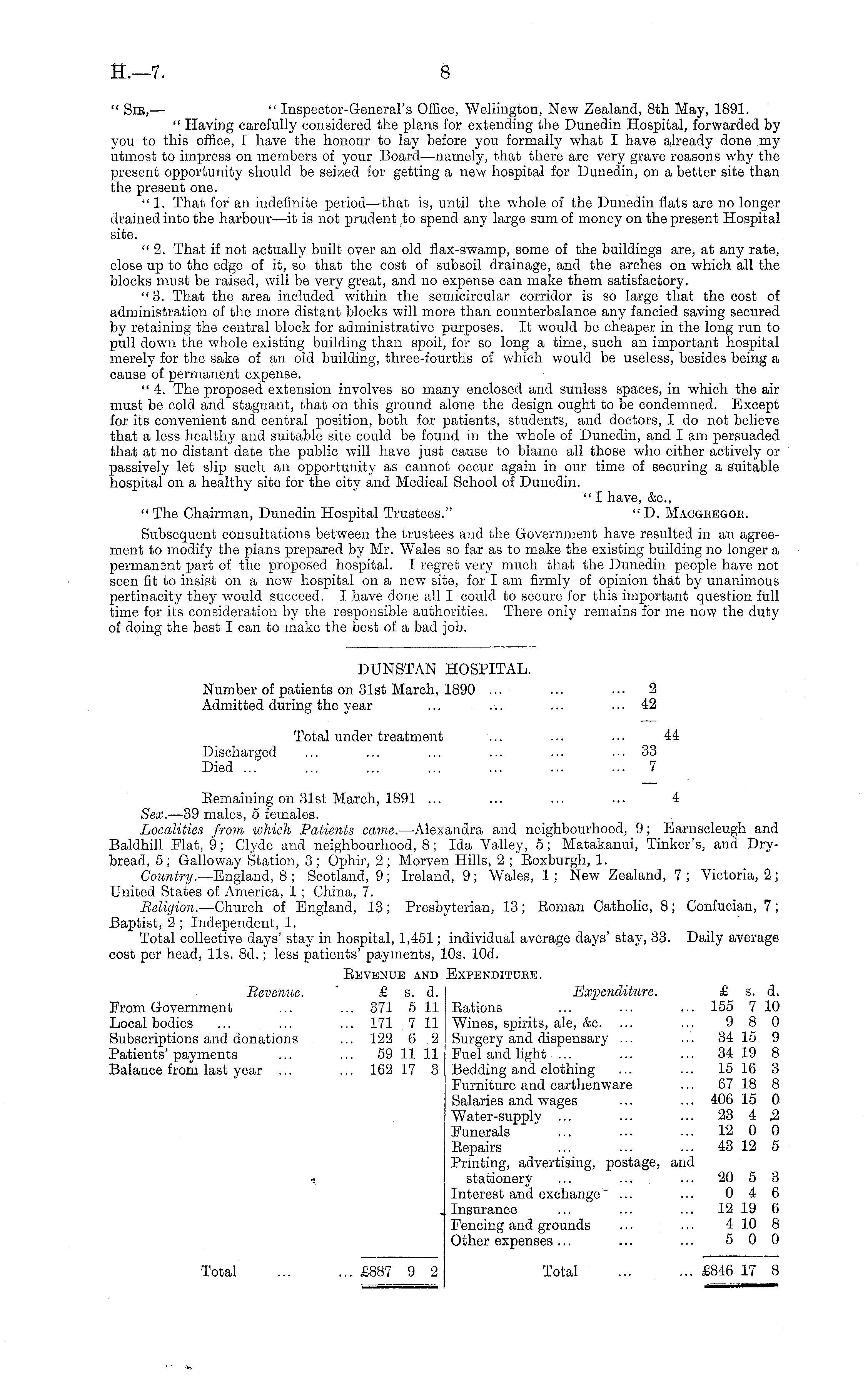 " Sik,' — " Inspector-General's Office, Wellington, New Zealand, Bth May, 1891. " Having carefully considered the plans for extending the Dunedin Hospital, forwarded by you to this office, I have the honour to lay before you formally what I have already done my utmost to impress on members of your Board—namely, that there are very grave reasons why the present opportunity should be seized for getting a new hospital for Dunedin, on a better site than the present one. " 1. That for an indefinite period —that is, until the whole of the Dunedin flats are no longer drained into the harbour—it is not prudent to spend any large sum of money on the present Hospital site. " 2. That if not actually built over an old flax-swamp, some of the buildings are, at any rate, close up to the edge of it, so that the cost of subsoil drainage, and the arches on which all the blocks must be raised, will be very great, and no expense can make them satisfactory. "3. That the area included within the semicircular corridor is so large that the cost of administration of the more distant blocks will more than counterbalance any fancied saving secured by retaining the central block for administrative purposes. It would be cheaper in the long run to pull down the whole existing building than spoil, for so long a time, such an important hospital merely for the sake of an old building, three-fourths of which would be useless, besides being a cause of permanent expense. " 4. The proposed extension involves so many enclosed and sunless spaces, in which the air must be cold and stagnant, that on this ground alone the design ought to be condemned. Except for its convenient and central position, both for patients, students, and doctors, I do not believe that a less healthy and suitable site could be found in the whole of Dunedin, and I am persuaded that at no distant date the public will have just cause to blame all those who either actively or passively let slip such an opportunity as cannot occur again in our time of securing a suitable hospital on a healthy site for the city and Medical School of Dunedin. " I have, &c, "The Chairman, Dunedin Hospital Trustees." "D. Maogbegob. Subsequent consultations between the trustees and the Government have resulted in an agreement to modify the plans prepared by Mr. Wales so far as to make the existing building no longer a permansnt part of the proposed hospital. I regret very much that the Dunedin people have not seen fit to insist on a new hospital on a new site, for I am firmly of opinion that by unanimous pertinacity they would succeed. I have done all I could to secure for this important question full time for its consideration by the responsible authorities. There only remains for me now the duty of doing the best I can to make the best of a bad job.