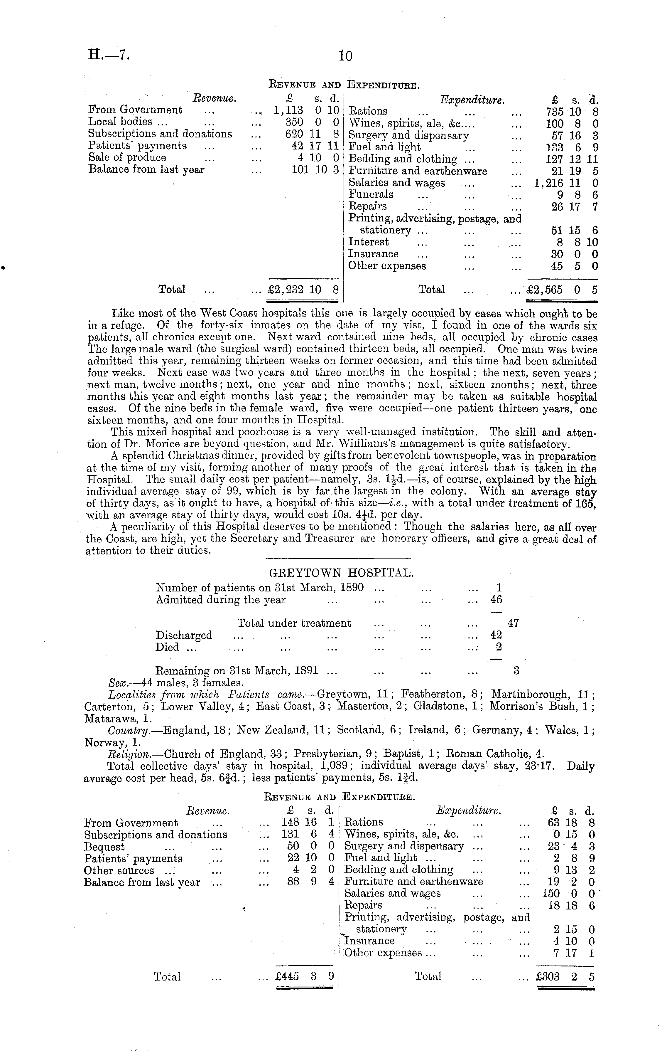 Revenue and Expenditube. Revenue. £ s. d. Expenditure. £ s. d. From Government ... ..„ 1,113 0 10 Rations ... ... ... 735 10 8 Local bodies ... ... ... 350 0 0 Wines, spirits, ale, &c... 100 8 0 Subscriptions and donations ... 620 11 8 Surgery and dispensary 57 16 3 Patients'payments ... ... 42 17 11 Fuel and light "... IP>3 6 9 Sale of produce ... ... 4 10 0 Bedding and clothing ... 127 12 11 Balance from last year ... 101 10 3 Furniture and earthenware 21 19 5 ! Salaries and wages ... ... 1,216 11 0 Funerals ... ... ... 9 8 6 Repairs ... ... 26 17 7 Printing, advertising, postage, and stationery ... ... ... 51 15 6 Interest ... ... 8 8 10 Insurance ... ... ... 30 0 0 Other expenses ... ... 45 5 0 Total ... ... £2,232 10 8 Total ... ... £2,565 0 5 Like most of the West Coast hospitals this one is largely occupied by cases which ought to be in a refuge. Of the forty-six inmates on the date of my vist, I found in one of the wards six patients, all chronics except one. Next ward contained nine beds, all occupied by chronic cases The large male ward (the surgical ward) contained thirteen beds, all occupied. One man was twice admitted this year, remaining thirteen weeks on former occasion, and this time had been admitted four weeks. Next case was two years and three months in the hospital; the next, seven years ; next man, twelve months; next, one year and nine months ; next, sixteen months; next, three months this year and eight months last year; the remainder may be taken as suitable hospital cases. Of the nine beds in the female ward, five were occupied—one patient thirteen years, one sixteen months, and one four months in Hospital. This mixed hospital and poorhouse is a very well-managed institution. The skill and attention of Dr. Morice are beyond question, and Mr. Willliams's management is quite satisfactory. A splendid Christmas dinner, provided by gifts from benevolent townspeople, was in preparation at the time of my visit, forming another of many proofs of the great interest that is taken in the Hospital. The small daily cost per patient—namely, 3s. IJd. —is, of course, explained by the high individual average stay of 99, which is by far the largest in the colony. With an average stay of thirty days, as it ought to have, a hospital of this size— i.e., with a total under treatment of 165, with an average stay of thirty days, would cost 10s. 4Jd. per day. A peculiarity of this Hospital deserves to be mentioned : Though the salaries here, as all over the Coast, are high, yet the Secretary and Treasurer are honorary officers, and give a great deal of attention to their duties.