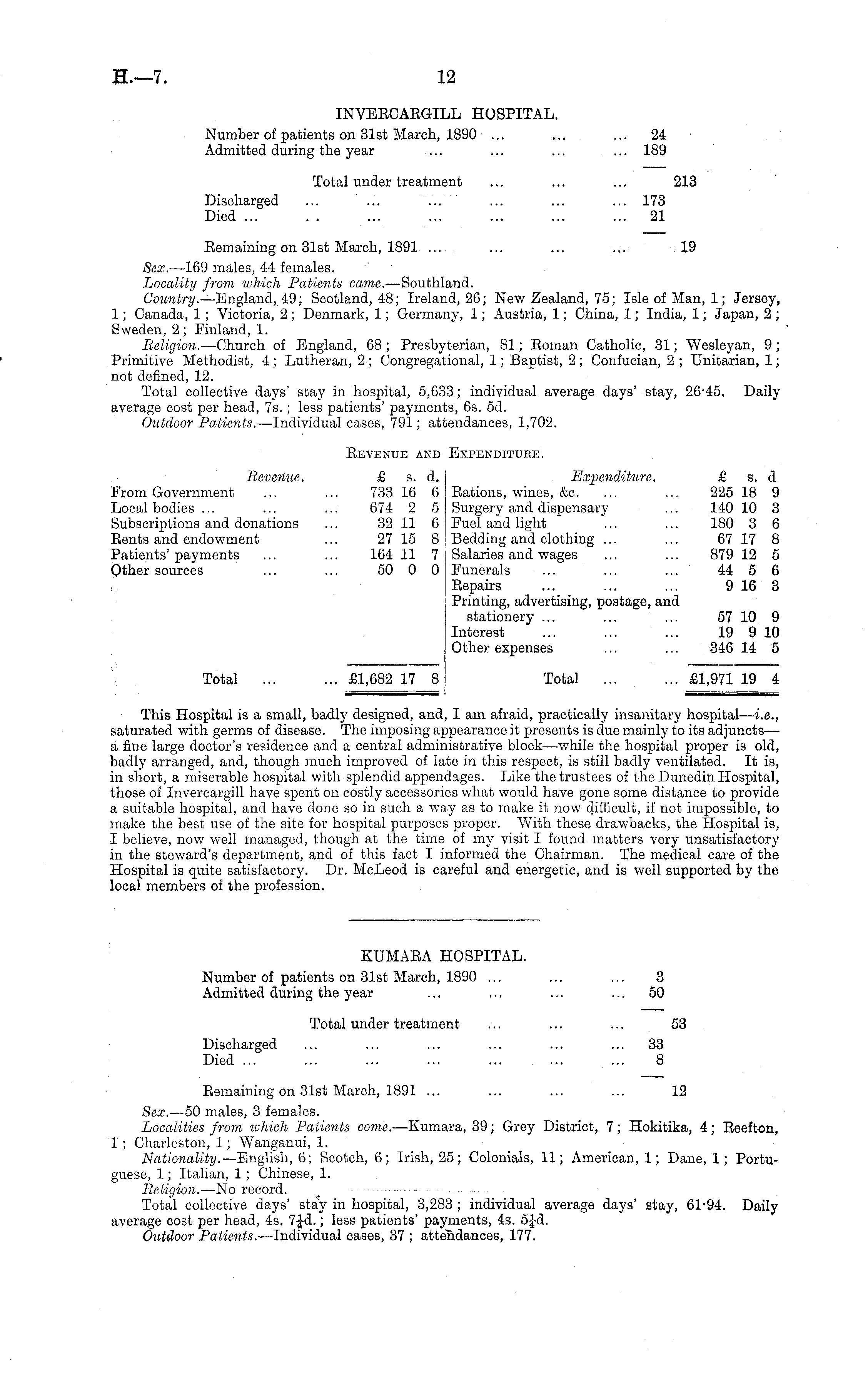 INVEECAEGILL HOSPITAL. Number of patients on 31st March, 1890 ... ... ... 24 Admitted during the year ... ... ... ... 189 Total under treatment ... ... ... 213 Discharged ... ... ... ... ... ... 173 Died ... . . ... ... ... ... ... 21 Eemaining on 31st March, 1891 ... ... ... ... 19 Sex. —169 males, 44 females. Locality from ivhich Patients came. —Southland. Country.— England, 49; Scotland, 48; Ireland, 26; New Zealand, 75; Isle of Man, 1; Jersey, 1; Canada, 1; Victoria, 2 ; Denmark, 1; Germany, 1; Austria, 1; China, 1; India, 1; Japan, 2 ; Sweden, 2 ; Finland, 1. Religion. —Church of England, 68 ; Presbyterian, 81; Eornan Catholic, 31; Wesleyan, 9 ; Primitive Methodist, 4; Lutheran, 2 ; Congregational, 1; Baptist, 2 ; Confucian, 2 ; Unitarian, 1; not defined, 12. Total collective days' stay in hospital, 5,633; individual average days' stay, 26-45. Daily average cost per head, 75.; less patients' payments, 6s. sd. Outdoor Patients. —lndividual cases, 791; attendances, 1,702. Eevenub and Expenditure. Revenue. £ s. d. Expenditure. £ s. d From Government ... ... 733 16 6 Eations, wines, &c. ... ... 225 18 9 Local bodies ... ... ... 674 2 5 Surgery and dispensary ... 140 10 3 Subscriptions and donations ... 32 11 6 Fuel and light ... ... 180 3 6 Eents and endowment ... 27 15 8 Bedding and clothing ... ... 67 17 8 Patients' payments ... ... 164 11 7 Salaries and wages ... ... 879 12 5 Other sources ... ... 50 0 0 Funerals ... ... ... 44 5 6 Eepairs ... ... ... 9 16 3 Printing, advertising, postage, and stationery ... ... ... 57 10 9 Interest ... ... ... 19 9 10 Other expenses ... ... 346 14 5 Total £1,682 17 8 Total £1,971 19 4 This Hospital is a small, badly designed, and, I am afraid, practically insanitary hospital — i.e., saturated with germs of disease. The imposing appearance it presents is due mainly to its adjuncts— a fine large doctor's residence and a central administrative block—while the hospital proper is old, badly arranged, and, though much improved of late in this respect, is still badly ventilated. It is, in short, a miserable hospital with splendid appendages. Like the trustees of the Dunedin Hospital, those of Invercargill have spent on costly accessories what would have gone some distance to provide a suitable hospital, and have done so in such a way as to make it now difficult, if not impossible, to make the best use of the site for hospital purposes proper. "With these drawbacks, the Hospital is, I believe, now well managed, though at the time of my visit I found matters very unsatisfactory in the steward's department, and of this fact I informed the Chairman. The medical care of the Hospital is quite satisfactory. Dr. McLeod is careful and energetic, and is well supported by the local members of the profession.