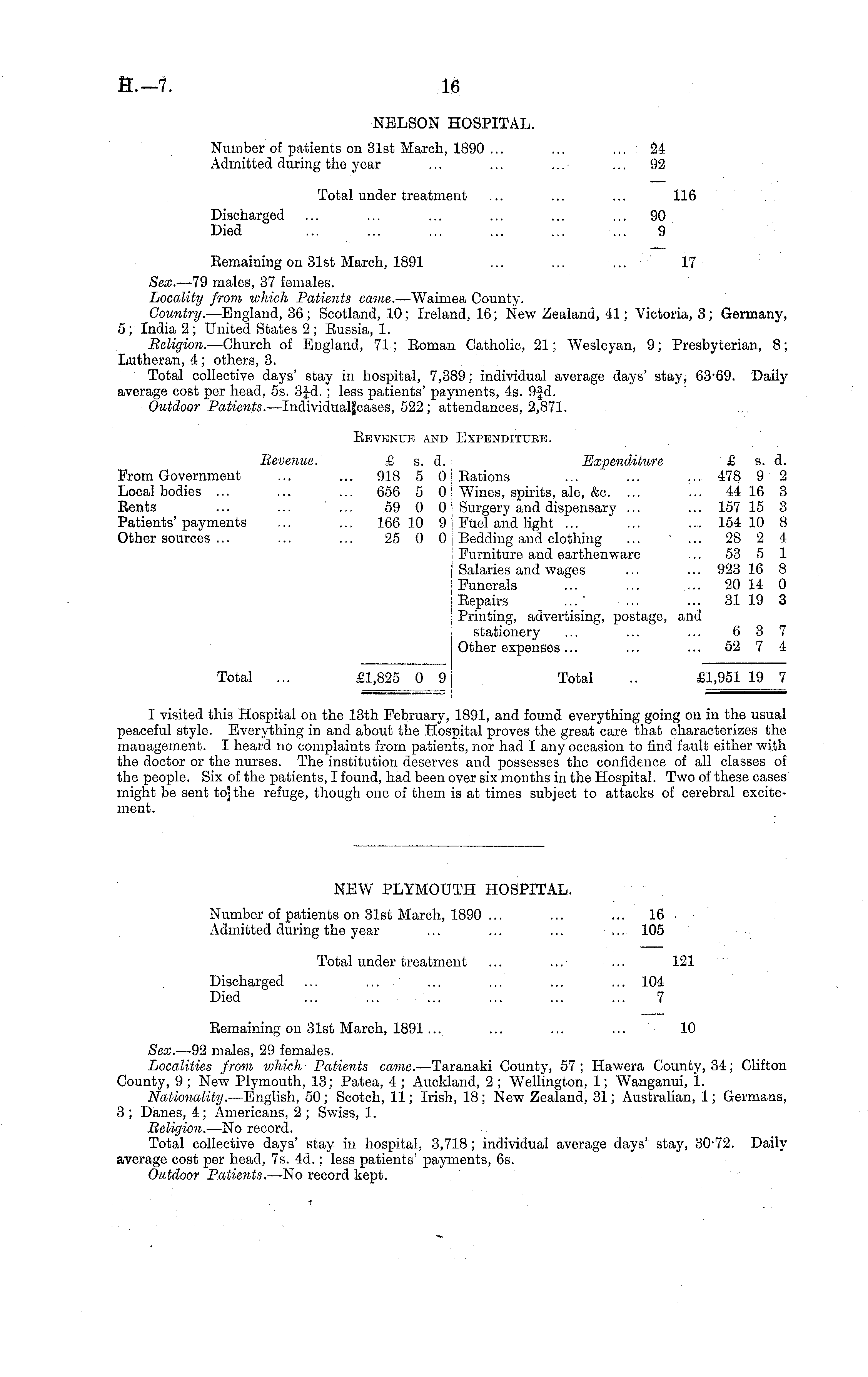 NEW PLYMOUTH HOSPITAL. Number of patients on 31st March, 1890 ... ... ... 16 Admitted during the year ... ... ... ... 105 Total under treatment ... ...• ... 121 Discharged ... ... ... ... ... ... 104 Died ... ... ... ... ... ... 7 Remaining on 31st March, 1891 ... ... ... ... 10 Sex. —92 males, 29 females. Localities from which Patients came. —Taranaki County, 57 ; Hawera County, 34; Clifton County, 9; New Plymouth, 13; Patea, 4; Auckland, 2; Wellington, 1; Wanganui, 1. Nationality. —English, 50; Scotch, 11; Irish, 18; New Zealand, 31; Australian, 1; Germans, 3; Danes, 4; Americans, 2; Swiss, 1. Beligion.—Eo record. Total collective days' stay in hospital, 3,718; individual average days' stay, 30'72. Daily average cost per head, 7s. 4d.; less patients' payments, 6s. Outdoor Patients. —No record kept.