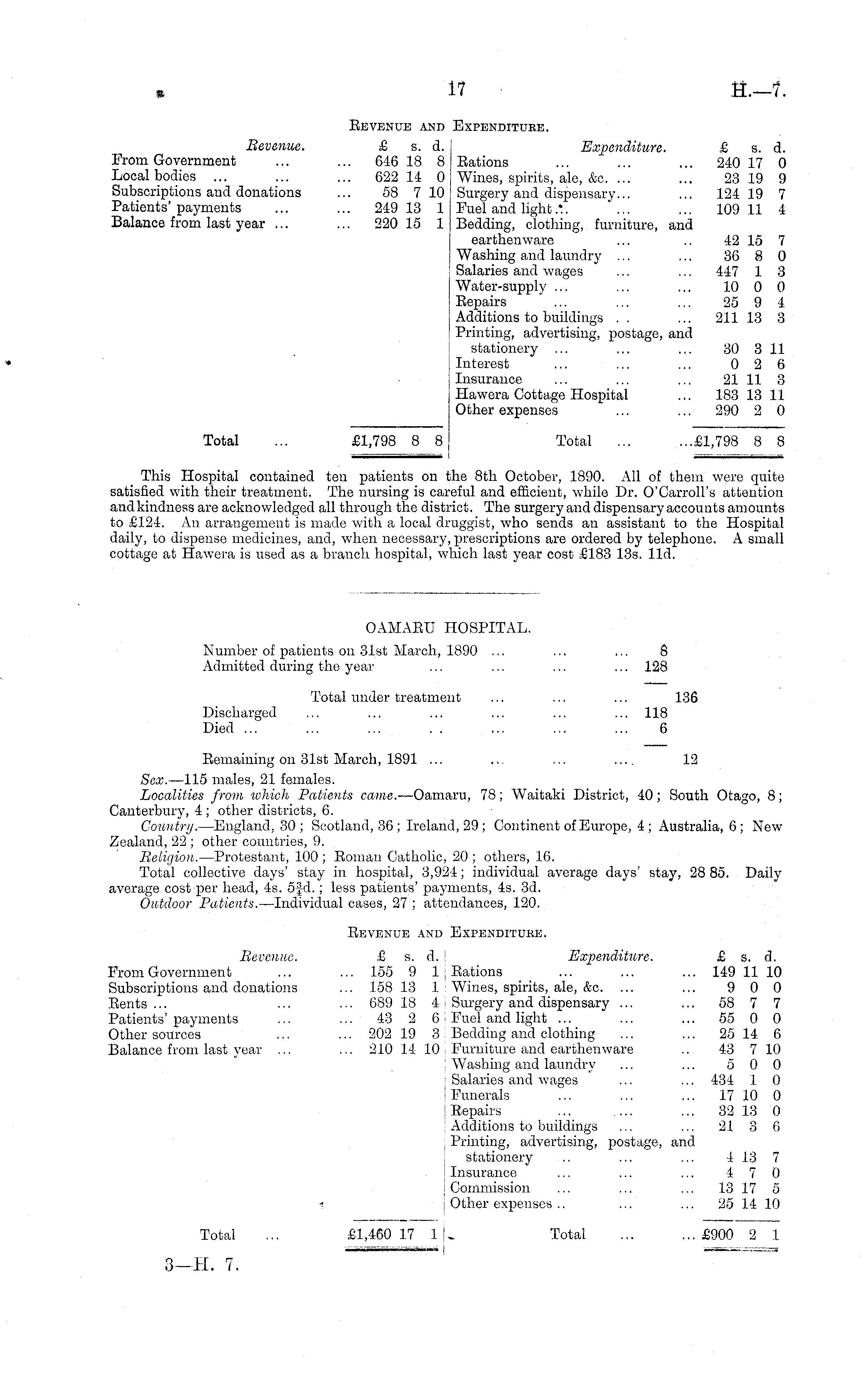Be venue and Expendituee. Revenue. £ s. d. Expenditure. £ s. d. From Government ... ... 646 18 8 Eations ... ... ... 240 17 0 Local bodies ... ... ... 622 14 0 Wines, spirits, ale, &c. ... ... 23 19 9 Subscriptions and donations ... 58 710 Surgery and dispensary... ... 124 19 7 Patients'payments ... ... 249 13 1 Fuel and light.:. ... ... 109 11 4 Balance from last year ... ... 220 15 1 Bedding, clothing, furniture, and earthenware ... .. 42 15 7 Washing and laundry ... ... 3680 Salaries and wages ... ... 447 1 3 Water-supply ... ... ... 10 0 0 Bepairs ... ... ... 25 9 4 Additions to buildings . . ... 211 13 3 Printing, advertising, postage, and stationery ... ... ... 30 3 11 Interest ... ... ... 026 Insurance ... ... 21 11 3 Hawera Cottage Hospital ... 183 13 11 Other expenses ... ... 290 2 0 ■ Total ... £1,798 8 8 Total ... ...£1,798 8 8 This Hospital contained ten patients on the Bth October, 1890. All of them were quite satisfied with their treatment. The nursing is careful and efficient, while Dr. O'Carroll's attention and kindness are acknowledged all through the district. The surgery and dispensary accounts amounts to £124. An arrangement is made with a local druggist, who sends an assistant to the Hospital daily, to dispense medicines, and, when necessary, prescriptions are ordered by telephone. A small cottage at Hawera is used as a branch hospital, which last year cost £183 13s. lid.