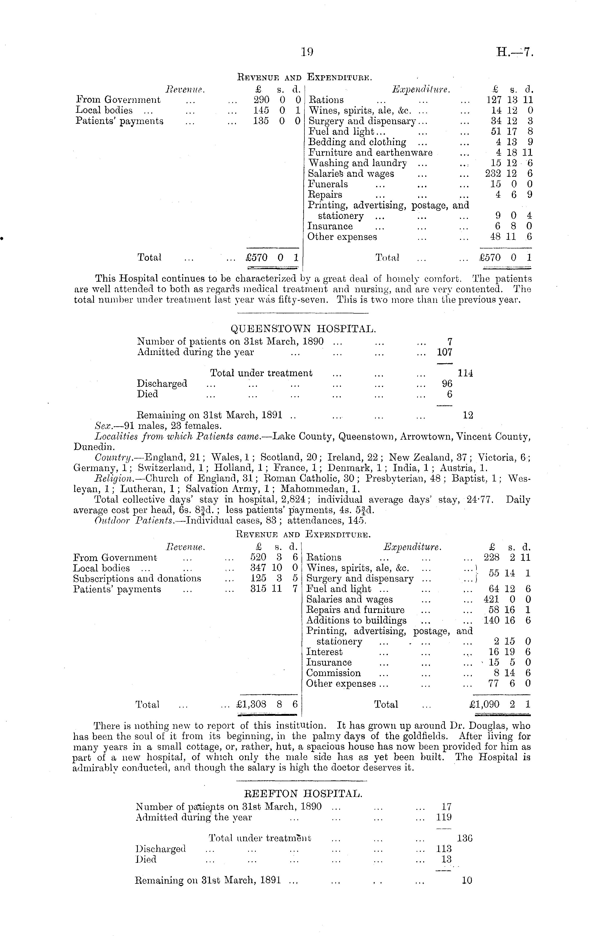 Revenue and Expenditure. Bevenue. £ s. d. j Expenditure. £ s. d. From Government ... ... 290 0 0 Eations ... ... ... 127 13 11 Local bodies ... ... ... 145 0 1 Wines, spirits, ale, Ac, ... ... 14 12 0 Patients'payments ... ... 135 0 0 Surgery and dispensary... ... 34 12 3 Fuel and light... ... ... 51 17 8 Bedding and clothing ... ... 4139 Furniture and earthenware ... 4 18 11 Washing and laundry ... .. : 15 12 6 Salaries and wages ... ... 232 12 6 Funerals ... ... ... 15 0 0 Repairs ... ... ... 469 Printing, advertising, postage, and stationery ... ... ... 904 Insurance ... ... ... 680 Other expenses ... ... 48 11 6 Total ... ... £570 0 1 Total ... ... £570 0 1 This Hospital continues to be characterized by a great deal of homely comfort. The patients are well attended to both as regards medical treatment and nursing, and are very contented. The total number under treatment last year was fifty-seven. This is two more than the previous year.