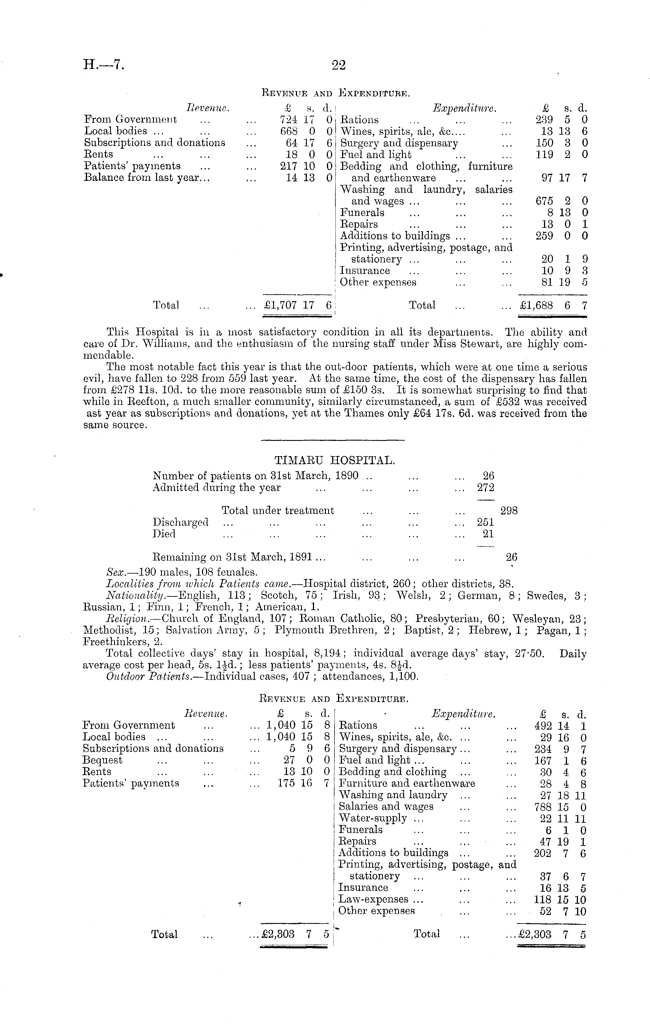 Revenue and ExPENDrTURE. Bevenue. £ s. d. Expenditure. £ s. d. From Government ... ... 724 17 0 Rations ... ... ... 239 5 0 Local bodies ... ... ... 668 0o! Wines, spirits, ale, &c... ... 13 13 6 Subscriptions and donations ... 64 17 6 Surgery and dispensary ... 150 3 0 Rents ... ... ... 18 00j Fuel and light ... ... 119 2 0 Patients'payments ... ... 217 10 0! Bedding and clothing, furniture Balance from last year... ... 14 13 0| and earthenware ... ... 97 17 7 Washing and laundry, salaries and wages ... ... ... 675 2 0 Funerals ... ... ... 8 13 0 Repairs ... ... ... 1301 Additions to buildings ... ... 259 0 0 Printing, advertising, postage, and stationery ... ... ... 20 1 9 I Insurance ... ... ... 1093 1 Other expenses ... ... 81 19 5 Total ... ... £1,707 17 61 Total ... ... £1,688 6 7 ! __ This Hospital is in a most satisfactory condition in all its departments. The ability and care of Dr. Williams, and the enthusiasm of the nursing staff under Miss Stewart, are highly commendable. The most notable fact this year is that the out-door patients, which were at one time a serious evil, have fallen to 228 from 559 last year. At the same time, the cost of the dispensary has fallen from £278 11s. lOd. to the more reasonable sum of £150 3s. It is somewhat surprising to find that while in Reefton, a much smaller community, similarly circumstanced, a sum of £532 was received ast year as subscriptions and donations, yet at the Thames only £64 17s. 6d. was received from the same source.