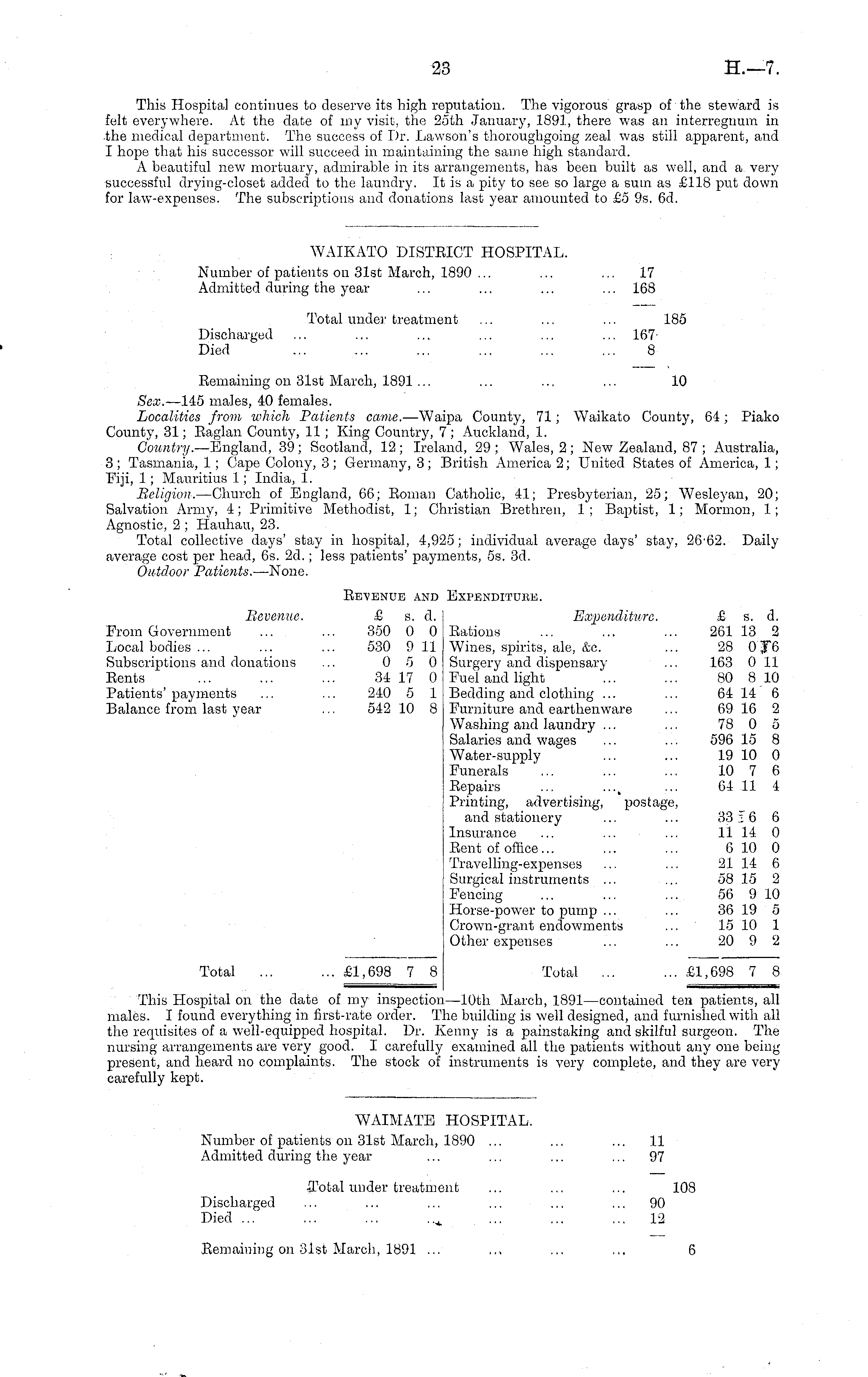 WAIKATO DISTEICT HOSPITAL. Number of patients on 31st March, 1890 ... ... ... 17 Admitted during the year ... ... ... ... 168 Total under treatment ... ... ... 185 Discharged ... ... ... ... ... ... 167Died ... ... ... ... ... ... 8 Remaining on 31st March, 1891 ... ... ... ... 10 Sex. —145 males, 40 females. Localities from which Patients came. —Waipa County, 71; Waikato County, 64 ; Piako County, 31; Raglan County, 11; King Country, 7 ; Auckland, 1. Country. —England, 39 ; Scotland, 12 ; Ireland, 29 ; Wales, 2 ; New Zealand, 87 ; Australia, 3; Tasmania, 1; Cape Colony, 3 ; Germany, 3; British America 2; United States of America, 1; Fiji, 1; Mauritius 1; India, 1. Religion. —Church of England, 66; Roman Catholic, 41; Presbyterian, 25; Wesleyan, 20; Salvation Army, 4; Primitive Methodist, 1; Christian Brethren, 1; Baptist, 1; Mormon, 1; Agnostic, 2 ; Hauhau, 23. Total collective days' stay in hospital, 4,925; individual average days' stay, 26'62. Daily average cost per head, 6s. 2d.; less patients' payments, ss. 3d. Outdoor Patients. —None. Revenue and Expenditumk. Revenue. £ s. d. Expenditure. £ s. d. From Government ... ... 350 0 0 Rations ... ... ... 261 13 2 Local bodies ... ... ... 530 9 11 Wines, spirits, ale, &c. ... 28 of6 Subscriptions and donations ... 0 5 0 Surgery and dispensary ... 163 011 Rents ... ... ... 34 17 0 Fuel and light "... ... 80 8 10 Patients'payments ... ... 240 5 1 Bedding and clothing ... ... 64 14 6 Balance from last year ... 542 10 8 Furniture and earthenware ... 69 16 2 Washing and laundry ... ... 78 0 5 Salaries and wages ... ... 596 15 8 Water-supply ... ... 19 10 0 Funerals ' ... ... ... 10 7 6 Repairs ... .... ... 64 11 4 Printing, advertising, postage, and stationery ... ... 33 J 6 6 Insurance ... ... ... 11 14 0 Rent of office... ... ... 6 10 0 Travelling-expenses ... ... 21 14 6 Surgical instruments ... ... 58 15 2 Fencing ... ... ... 56 9 10 Horse-power to pump ... ... 36 19 5 Crown-grant endowments ... 15 10 1 Other expenses ... ... 2092 Total ... ... £1,698 7 8 Total ... ... £1,698 7 8 This Hospital on the date of my inspection—loth March, 1891 —contained ten patients, all males. I found everything in first-rate order. The building is well designed, and furnished with all the requisites of a well-equipped hospital. Dr. Kenny is a painstaking and skilful surgeon. The nursing arrangements are very good. I carefully examined all the patients without any one being present, and heard no complaints. The stock of instruments is very complete, and they are very carefully kept.