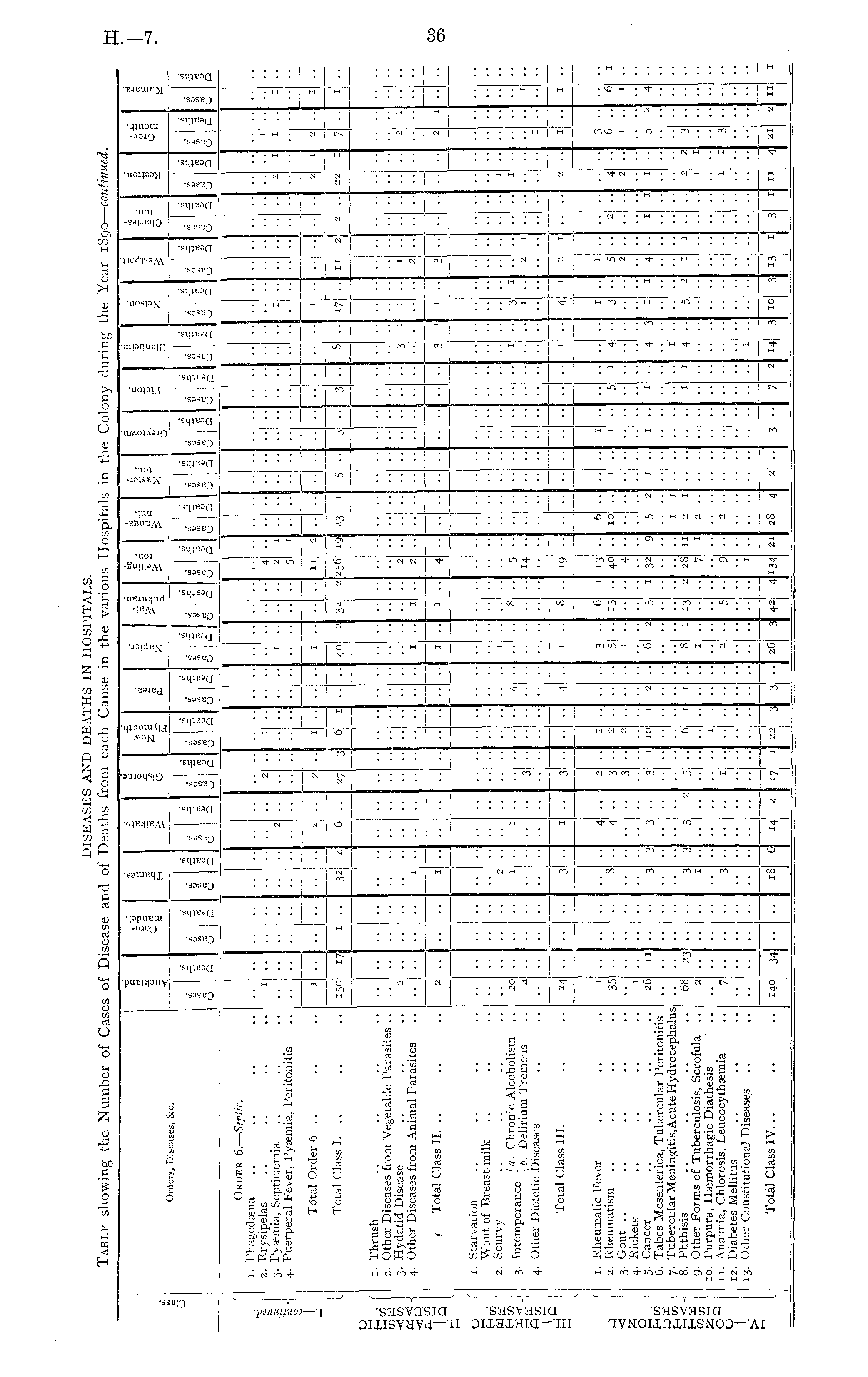 I] 03 •£ 3 I c I 1 3 Z E 3 a v (3 Q re 2 w rt 5 c to oi -c 3 o re c o 1 1 5 c I r O rt o O o V 1 1 e4 (j Orders, Diseases, &c. I 1 1 . 1 3 Q —7 J3 rt u I Q S 1 Is 5 & u a ill « I n u a u a - I 1 u J3 1 a I I I Order 6.— Septic. 1. Phagedasna 2. Erysipelas 3. Pyaemia, Septicaemia 4. Puerperal Fever, Pyaemia, Peritonitis •■ I •• - • ■■ - •• ■■ •• 2 I •1 1 •• - • ■■ •• 4 2 5 • •■ - •• - i ■■ ■ •■ •■ " •• • ■• •1 1 •1 •• 1 •• - • 2 :. - - H - ! __ 1 ■ 2 - ■ • - - •■ 1 • ■ ■• • • • ■■ ■■ ■■ . i I H h- — h- — H - — — H H H H — 1 1 1 H H H Total Order 6 .. I •• » 2 » " .. 11 2 .. • ■ • ■ 1 .. .. 2 1 2 .. •• •• •• ••1 •• •1 •• Total Class I. .. — — S~ — t H M H — H ~ H ~ H - — 150 17 X 32 - 27 3 Uo i 32 256 19 23 * ■■■ 3 - ■• 8 - h • II 22 7 •I i 'I •• ■ M — — 4 — — — — — — — — 1 — — ft") IS +— i 1. Thrush 2. Other Diseases from Vegetable Parasites .. 3. Hydatid Disease 4. Other Diseases from Animal Parasites •• - - ■• •• •• - •1 • • •• ■ - •I - • ■• ■• ■• ■ •• •• " 3 1 •■ •• •• ■• • ■■ •• ., •• •• • 1 ' 2 1 2 - - - • ■ ■• » ■■ ■• ■ - - •• ■ A - - ■•I ■ •• 1 I ■• 2 •■ • ■• • • • •• H ■ •• • — 1 — H 1 H H H — - H H I ! -~ 1 1 1 1 — * Total Class II. .. 2 •• - * * •• •• •• ■ •■ .. 1 .. • 4 • .. - - •• • 3 1 3 •• • •■ ' —- 1 I — 1 — 1 I— — — — — — — 1 — —i I — 1 1 1 — — 1 o r Hen 1. Starvation Want of Breast-milk 2. Scurvy T , fa. Chronic Alcoholism 3 . Intemperance ] & Delirium Tremens \ 4. Other Dietetic Diseases 20 4 •■ - - " ■ •• 2 1 •• ■ •• ■■ •■ ■• - ■ •• 4 " I 8 •■ - ■• •• .. 5 • • ■■ •1 •■ ■ •• •• • • ■ - ■ ■• •• •• •• •• ■I 1 1 ••I ..I - ■ I •• • ■ - • - •■ • 1 3 1 1 ■• - 1 • - 3 ■ - • •• •• • •■ 2 A H I •■ • ■■■ •• H • • •• ■ — •• • •• .. ■• •• ■A - ! — 1 — — H - H - H H H — i 1 I M 1 Total Class III. 24 •• •• - 3 ! 1 ■ Li .. • 4 ■ 8 •■ 19 •• - •■ • 'I .. .. A » A - 2 1 ■• H — — — — — — — — — iz; o {-,00 I— i 1. Rheumatic Fever 2. Rheumatism 3. Gout .. 4. Rickets 5. Cancer C. Tabes Mesenterica, Tubercular Peritonitis 7. Tubercular Meningitis, Acute Hydrocephalus 8. Phthisis 9. Other Forms of Tuberculosis, Scrofula .. 10. Purpura, Haemorrhagic Diathesis 11. Anaemia, Chlorosis, Leucocythaemia 12. Diabetes Mellitus 13. Other Constitutional Diseases I 35 •• 1 26 - •■ ■■ 1 • •• - - - - - " - - • - " 8 3 ■ ■ • - 3 'I 4 4 • • 3 • ■ • - - - 2 3 3 •■ •■ ■ • ■ • 1 2 •• 10 •■■ 1 ■ •■ 2 " 3 1 6 ■• • • - 2 ■■ 6 15 3 1 ■ • •• 1 • 13 40 4 32 •■ • 9 • 6 10 5 1 • - - 2 \ ■ ■ " 1 • V ■ • • - II I - I I - - • •• - •• •• •• 5 1 1 1 • •• 4 4 1 3 - 1 3 1 - 5 ■• I 1 5 2 4 1 • •• • ■ ■• • •• 1 •• 2 •1 • - •• A • • •• 4 2 1 2 1 ■ ■ ■ ■ 1 = •• ■■ ■• • 2 6 1 4 I 68 2 23 • - I" • 3 1 ■ 3 3 ■■ A 5 • ■ 6 ■ 1 - 1 8 ■• ! 13 •■ 2 28 7 ■ 11 2 1 - - - •• 4 •■ • A 3 • - V - • - 1 ■ 1 • A 2 - •■ • • ■ "•■ •• - • A • •• ■• •• • • •'■ •• •■ 1 • 1 •■ 2 • •• ■ - " - •• • - •• • 1 • •• •• 7 • • - 3 - - • - • - 5 •• 9 ■ 2 - - - - • - - • A 3 - - • • ■•" • • • - • • ■• •• •• - - h - • 1 • • - • ■ ■ • • !•• •■ • .. • ■ - • •• 1 • - •• ■ •• •■ ■ • ■ .. •• ■ .. • • Total Class IV... I i — 18 — — h" — H 28 H H — — ~\ 1 1 1 1 — 140 34! •■ • ■ h 2 *7 2 2 3 3 • • 26 4 2 4 1341 21 4 I .. 3 .. 2 M 3 10 3 1 3 I 11 4 hi 11