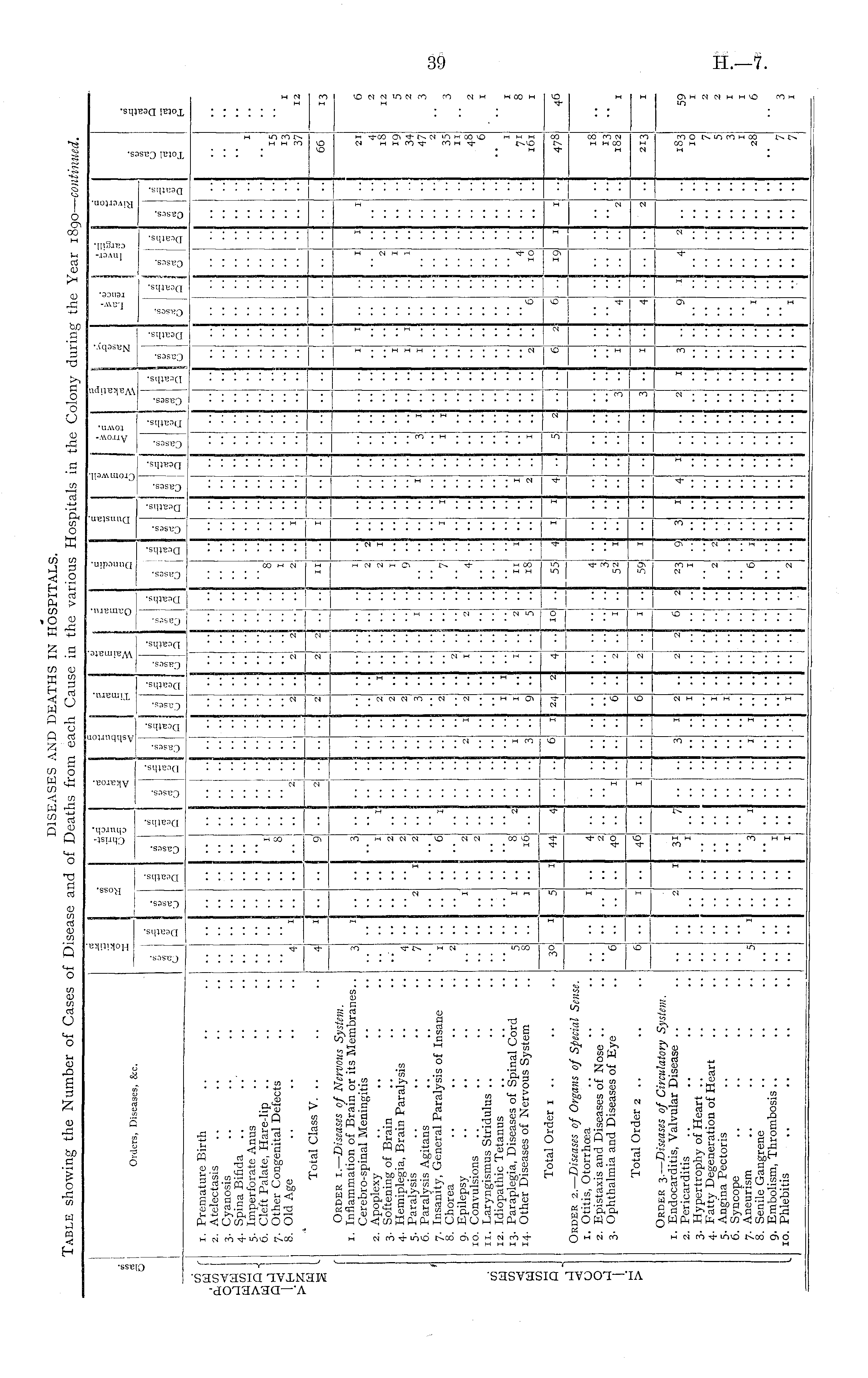 o o < o 1" I ■a - 3 a a £ a Q a c Q o o > I p en 5 Orders, Diseases, &c. o Q 6 a ■u V u 1 1 re ■a rt O G ■ "1 v re CJ re Q 6 I I U Q —T~ I I Q 1. Premature Birth 2. Atelectasis 3. Cyanosis 4. Spina Bifida 5. Imperforate Anus 6. Cleft Palate, Hare-lip 7. Other Congenital Defects 8. Old Age i .. • •• •• ■■ 'I !•■ •• •• ■ - - ■■ •• •• •• ■ • ■ ■ ■1 " - - - •• " •• •■ I - -i •■ ! •■ •■ - •■ 1 - - - 8 1 2 ■ - •■! •• - 1 8 •■ i • •• •■ ■ - -I I- " 15 13 37 66 - 2 2 • 1 - - - 1 _J - I •■ 2 •■ •• 2 •• - 1 •• '"I - 1 ■ ■ 1 • - 12 1 M H H — ! I H ! 1 ! H H Total Class V. .. 4 i - 9 2 .. 2 2 » 11 .. •■ - ■ ■ .. • ■■ •• I •• 13 Order i.— Diseases of Nervous System. 1. Inflammation of Brain or its Membranes.. Cerebro-spinal Meningitis 2. Apoplexy 3. Softening of Brain 4. Hemiplegia, Brain Paralysis 5. Paralysis 6. Paralysis Agitans 7. Insanity, General Paralysis of Insane 8. Chorea 9. Epilepsy 10. Convulsions 11. Laryngismus Stridulus .. 12. Idiopathic Tetanus 13. Paraplegia, Diseases of Spinal Cord 14. Other Diseases of Nervous System 3 •• 4 7 •• 1 • - - - 2 •• - 2 I •• ••! •• - ••! 1 1 1 3 •■ * - - 2 6 ~i 1 •• - • r~ •• ■• •1 " I "I - - ■■ • 2 2 2 3 •■ I •• • • ■ "I ■• ■ ' • .. . - 1 1 2 2 1 9 7 " 2 1 - !•• •■ •• •• ■■ •■ 1 "I ■ ••! 1 - I - " ■■ 3 •• •1 1 — I 1 1 1 1! " ij — 1 • 'I - .. 1 •• 2 1 1 1 -• 1 — I 21 4 18 19 34 47 2 35 11 48 6 2 12 2 3 =s 1 .... 1 • - 2 ' 2 I •• - 1 ] •■ 2 •■ — ■ •■ - •• • •• ■• • • " • • - ■■ J ■ • I ' 1 ■• » •• 2 ij 2 • 2 4 •■ •• - • ■ ■ " 2 • •• •• 2 •• ■ - • ■• - • - I CO - •• • •■ " .. I I 9 1 - ■ •• - • • ■ - - •• .. .. ■• •■ 8 16 •• - I - ■ 11 18 • ■■ •• • • - 1 71 161 I 8 ■ 2 5 5 8 ■■ 11 1 •• 2 • A • • - A •• » 1 • 2 "e I !4 10 - ■• ■• 6 •• .. • •• ■ ■• .. 2 .. " 'I ■ __ 1 Total Order 1 .. — H H -\ — H — I I — I 3° 4 5 A 44 - 1*4 •• h " 4 1 4 5 6 2 « ■• 4 "I ■• 6 1 1 478 - — ■■ U I— Order 2.— Diseases of Organs of Special Sense. 1. Otitis, Otorrhoea 2. Epistaxis and Diseases of Nose .. 3. Ophthalmia and Diseases of Eye •• 1 •■ 4 2 40 1 •I — • • •■ ■1 ' 4 3 52 •• — •■ — — — — 4 18 13 182 6 ■■ ■• •• - 6 - •• I ■ I ■ - "I 1 • •• ■ • ■ * - - 2 • 1 ■■ 1 • 3 4 • 2 • 1 Total Order 2 .. 6 — - — 46 \— 1 H I H h~ H ■ - - • 59 • 3 4 ■ .. 213] •• • • •• •• ..1 ■• — - H Order 3.— Diseases of Circulatory System. 1. Endocarditis, Valvular Disease .. 2. Pericarditis 3. Hypertrophy of Heart 4. Fatty Degeneration of Heart 5. Angina Pectoris 6. Syncope 7. Aneurism 8. Senile Gangrene 9. Embolism, Thrombosis 10. Phlebitis I.I •• 1 • 1 •• '• i - ., 3 1 ■ • 2 I I I 2 • - - 2j • II "I • 23 1 ■• 2 9 ■• • — 3 - ■•! I 4 I — 2 I 3 9 I ■ H 4 2 • - ••! 183 10 7 5 3 1 28 59 1 2 2 1 1 • ■ • ■ ■ • • •• • •• I •■ 1 ' ■ 6 • ■ •• ■■I •! 5 1 • 3 1 1 • • A • 1 • • • 1 1 - II ■■! • ■ • •■ • ■• .. • • •• ■ • ■ • 7 7 3 1 •• .. ■ ■ •■ •• .. ' 2 .. .. .. .. .. 1 ■• .. ..