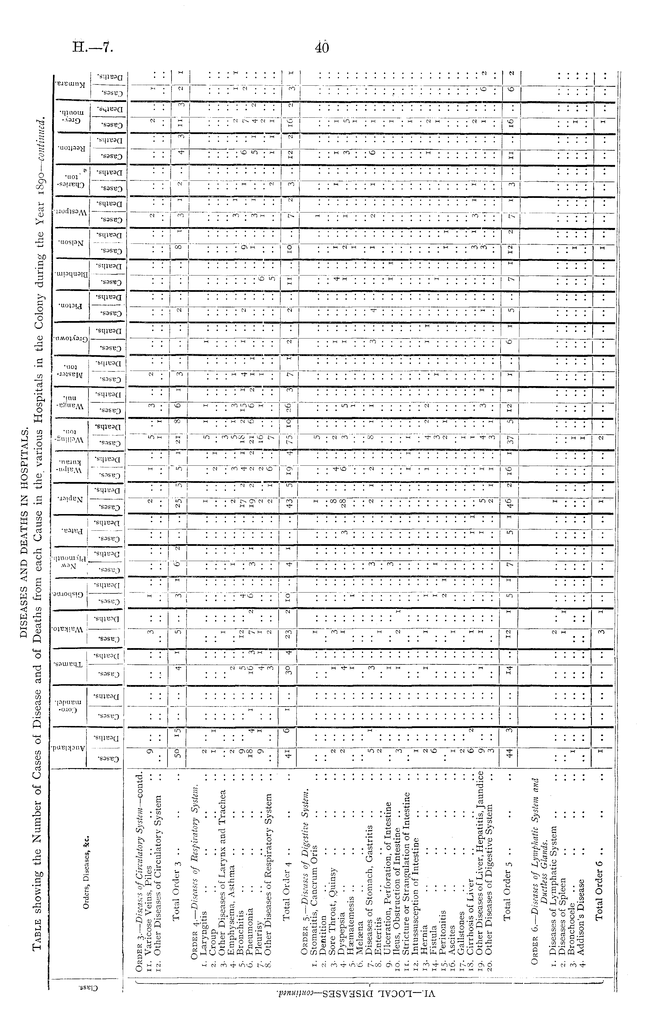DISEASES AND DEATHS IN HOSPITALS. Table showing the Number of Cases of Disease and of Deaths from each Cause in the various Hospitals in the Colony during the Year 1890— continued.