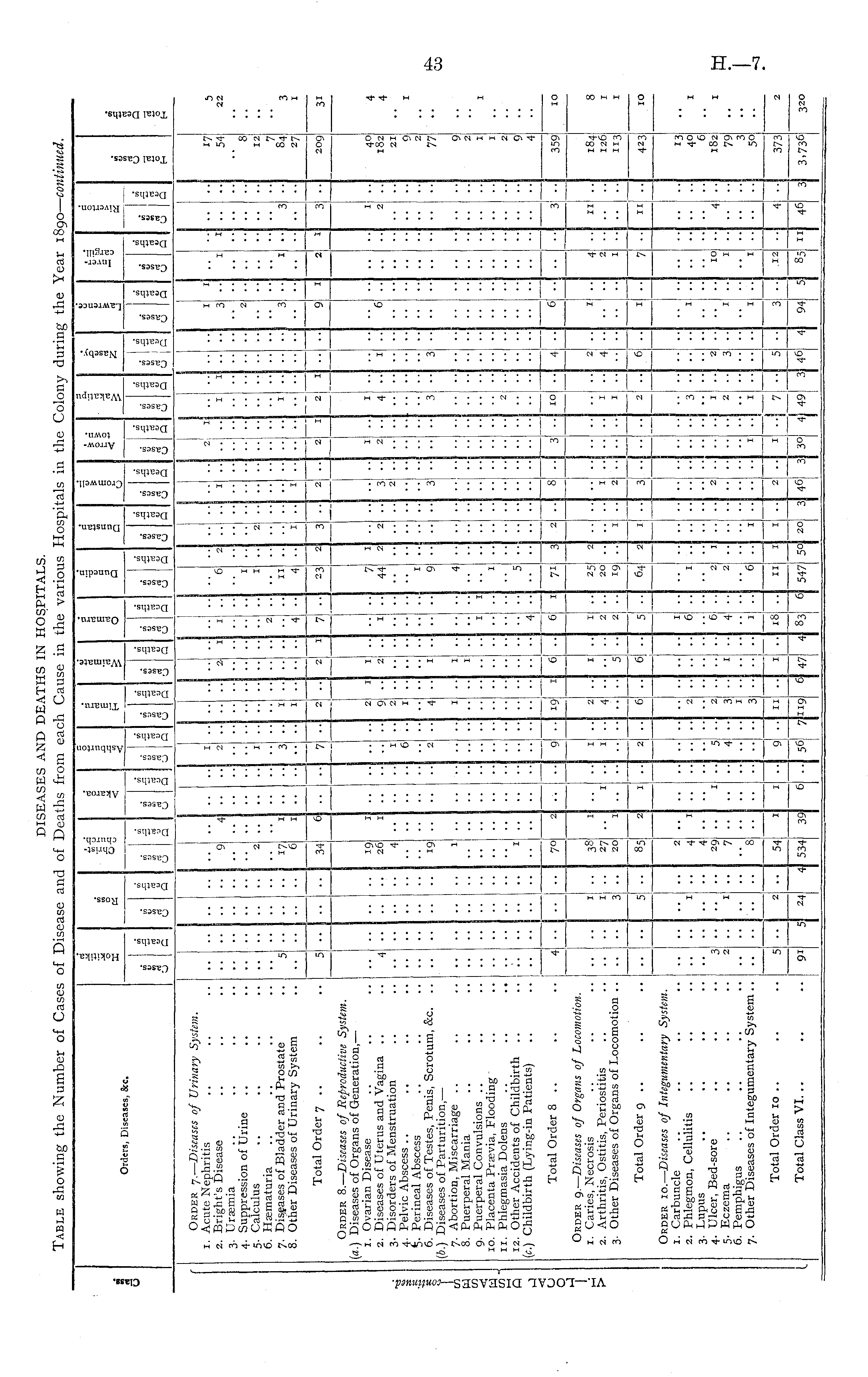 DISEASES AND DEATHS IN HOSPITALS. Table showing the Number of Cases of Disease and of Deaths from each Cause in the various Hospitals in the Colony during the Year 1890— continued.