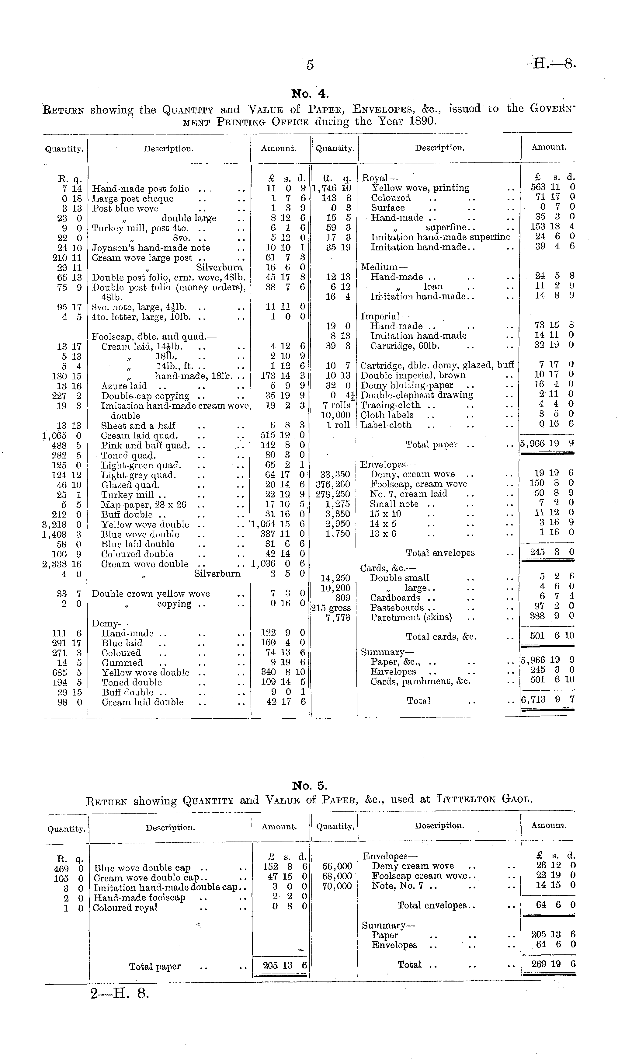 No. 5. Return showing Quantity and Value of Paper, &c., used at Lyttelton Gaol.