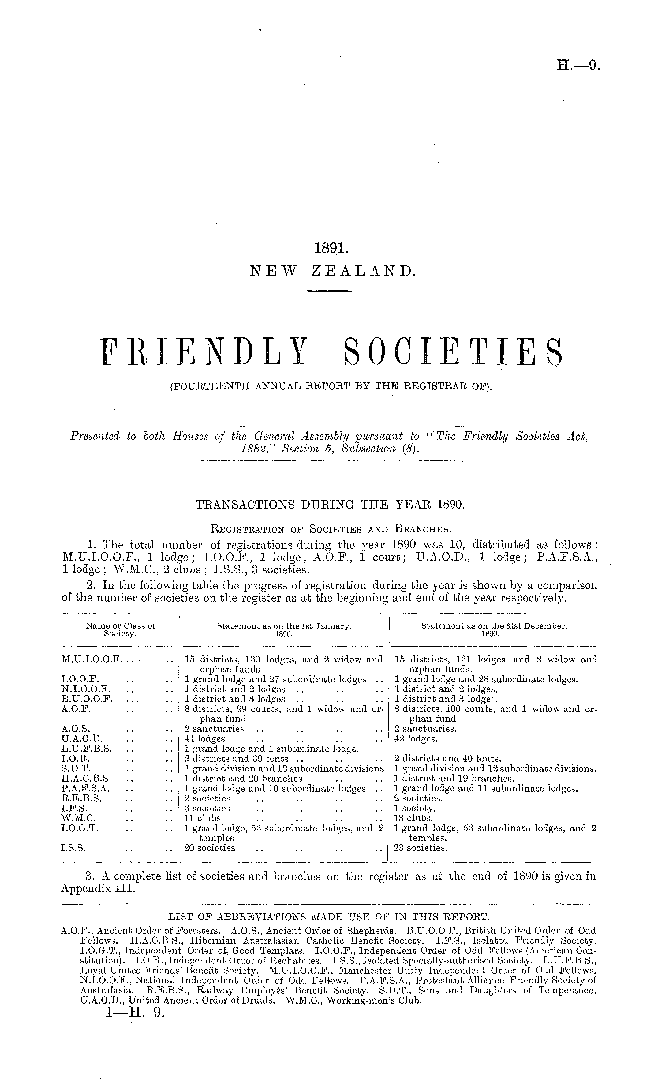 TRANSACTIONS DUEING THE YEAE 1890. Begistbation of Societies and Branches. 1. The total number of registrations during the year 1890 was 10, distributed as follows : M.U.1.0.0.F., 1 lodge; 1.0.0.F., 1 lodge; A.0.F., 1 court; U.A.0.D., 1 lodge; P.A.F.8.A., 1 lodge ; W.M.C., 2 clubs ; 1.5.5., 3 societies, 2. In the following table the progress of registration during the year is shown by a comparison of the number of societies on the register as at the beginning and end of the year respectively.