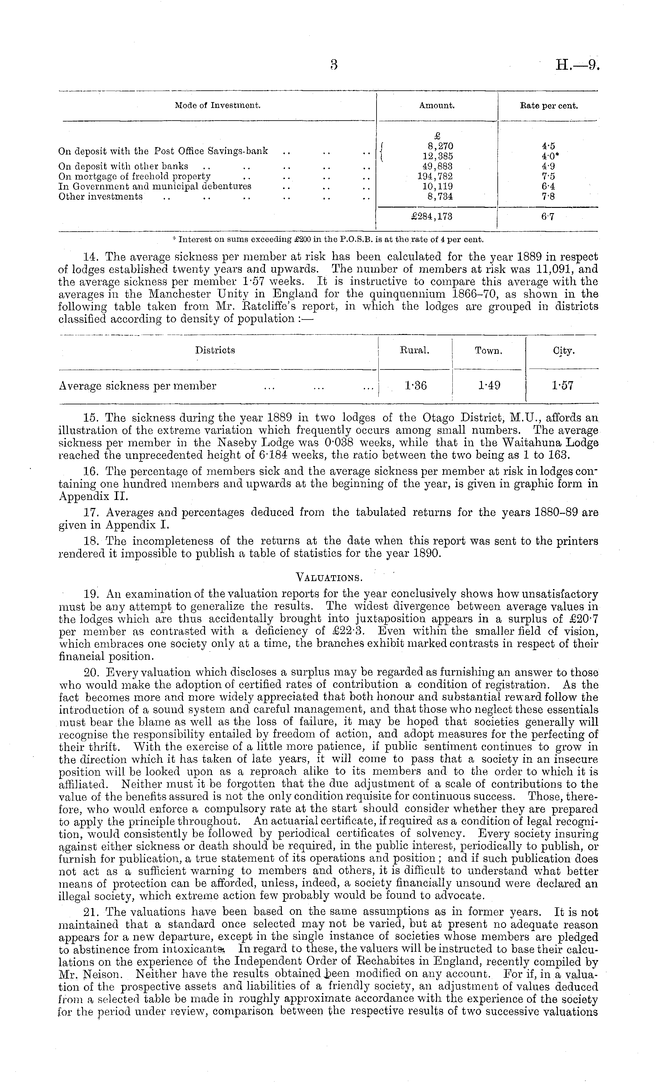 15. The sickness during the year 1889 in two lodges of the Otago District, M.U., affords an illustration of the extreme variation which frequently occurs among small numbers. The average sickness per member in the Naseby Lodge was 0038 weeks, while that in the Waitahuna Lodge reached the unprecedented height of 6-184 weeks, the ratio between the two being as 1 to 163. 16. The percentage of members sick and the average sickness per member at risk in lodges containing one hundred members and upwards at the beginning of the year, is given in graphic form in Appendix 11. 17. Averages and percentages deduced from the tabulated returns for the years 1880-89 are given in Appendix I. 18. The incompleteness of the returns at the date when this report was sent to the printers rendered it impossible to publish a table of statistics for the year 1890. Valuations. 19. An examination of the valuation reports for the year conclusively shows how unsatisfactory must be any attempt to generalize the results. The widest divergence between average values in the lodges which are thus accidentally brought into juxtaposition appears in a surplus of £20-7 per member as contrasted with a deficiency of £22'3. Even within the smaller field of vision, which embraces one society only at a time, the branches exhibit marked contrasts in respect of their financial position. 20. Every valuation which discloses a surplus may be regarded as furnishing an answer to those who would make the adoption of certified rates of contribution a condition of registration. As the fact becomes more and more widely appreciated that both honour and substantial reward follow the introduction of a sound system and careful management, and that those who neglect these essentials must bear the blame as well as the loss of failure, it may be hoped that societies generally will recognise the responsibility entailed by freedom of action, and adopt measures for the perfecting of their thrift. With the exercise of a little more patience, if public sentiment continues to grow in the direction which it has taken of late years, it will come to pass that a society in an insecure position will be looked upon as a reproach alike to its members and to the order to which it is affiliated. Neither must it be forgotten that the due adjustment of a scale of contributions to the value of the benefits assured is not the only condition requisite for continuous success. Those, therefore, who would enforce a compulsory rate at the start should consider whether they are prepared to apply the principle throughout. An actuarial certificate, if required as a condition of legal recognition, would consistently be followed by periodical certificates of solvency. Every society insuring against either sickness or death should be required, in the public interest, periodically to publish, or furnish for publication, a true statement of its operations and position ; and if such publication does not act as a sufficient warning to members and others, it is difficult to understand what better means of protection can be afforded, unless, indeed, a society financially unsound were declared an illegal society, which extreme action few probably would be found to advocate. 21. The valuations have been based on the same assumptions as in former years. It is not maintained that a standard once selected may not be varied, but at present no adequate reason appears for a new departure, except in the single instance of societies whose members are pledged to abstinence from intoxicants-. In regard to these, the valuers will be instructed to base their calculations on the experience of the Independent Order of Bechabites in England, recently compiled by Mr. Neison. Neither have the results obtained .been modified on any account. For if, in a valuation of the prospective assets and liabilities of a friendly society, an adjustment of values deduced from a selected table be made in roughly approximate accordance with the experience of the soeiety for the period under review, comparison between the respective results of two successive valuations