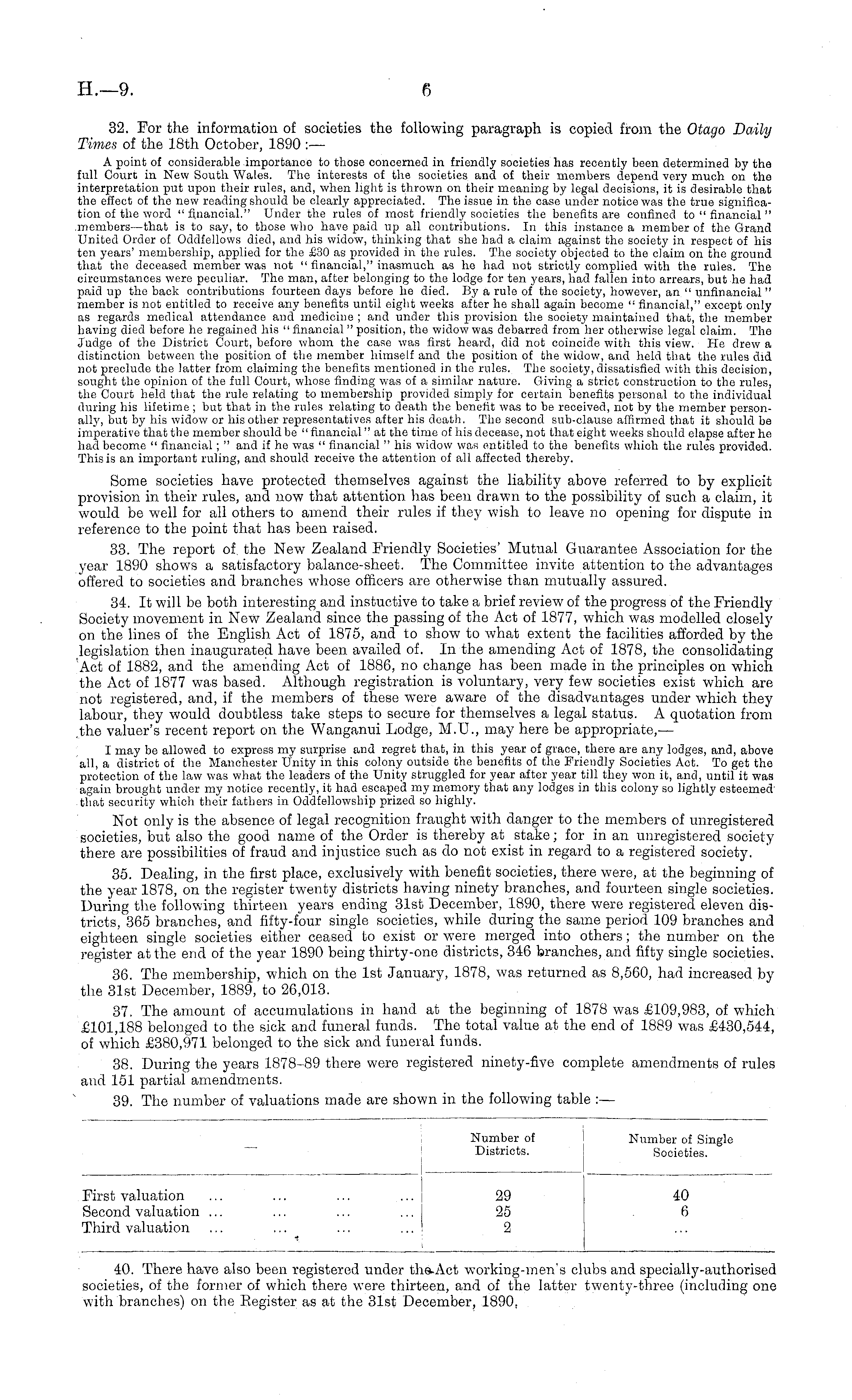 32. For the information of societies the following paragraph is copied from the Otago Daily Times of the 18th October, 1890 :— A point of considerable importance to those concerned in friendly societies has recently been determined by the full Court in New South Wales. The interests of the societies and of their members depend very much on the interpretation put upon their rules, and, when light is thrown on their meaning by legal decisions, it is desirable that the effect of the new reading should be clearly appreciated. The issue in the case under notice was the true signification of the word " financial." Under the rules of most friendly societies the benefits are confined to " financial " members —that is to say, to those who have paid up all contributions. In this instance a member of the Grand United Order of Oddfellows died, and his widow, thinking that she had a claim against the society in respect of his ten years' membership, applied for the £30 as provided in the rules. The society objected to the claim on the ground that the deceased member was not " financial," inasmuch as he had not strictly complied with the rules. The circumstances were peculiar. The man, after belonging to the lodge for ten years, had fallen into arrears, but he had paid up the back contributions fourteen days before he died. By a rule of the society, however, an " unfinancial " member is not entitled to receive any benefits until eight weeks after he shall again become " financial," except only as regards medical attendance and medicine ; and under this provision the societj' maintained that, the member having died before he regained his " financial " position, the widow was debarred from her otherwise legal claim. The Judge of the District Court, before whom the case was first heard, did not coincide with this view. He drew a distinction between the position of the member himself and the position of the widow, and held that the rules did not preclude the latter from claiming the benefits mentioned in the rules. The society, dissatisfied with this decision, sought the opinion of the full Court, whose finding was of a similar nature. Giving a strict construction to the rules, the Court held that the rule relating to membership provided simply for certain benefits personal to the individual during his lifetime; but that in the rules relating to death the benefit was to be received, not by the member personally, but by his widow or his other representatives after his death. The second sub-clause affirmed that it should be imperative that the member should be " financial " at the time of his decease, not that eight weeks should elapse after he had become " financial ; " and if he was " financial " his widow was entitled to the benefits which the rules provided. This is an important ruling, and should receive the attention of all affected thereby. Some societies have protected themselves against the liability above referred to by explicit provision in their rules, and now that attention has been drawn to the possibility of such a claim, it would be well for all others to amend their rules if they wish to leave no opening for dispute in reference to the point that has been raised. 33. The report of the New Zealand Friendly Societies' Mutual Guarantee Association for the year 1890 shows a satisfactory balance-sheet. The Committee invite attention to the advantages offered to societies and branches whose officers are otherwise than mutually assured. 34. It will be both interesting and instuctive to take a brief review of the progress of the Friendly Society movement in New Zealand since the passing of the Act of 1877, which was modelled closely on the lines of the English Act of 1875, and to show to what extent the facilities afforded by the legislation then inaugurated have been availed of. In the amending Act of 1878, the consolidating Act of 1882, and the amending Act of 1886, no change has been made in the principles on which the Act of 1877 was based. Although registration is voluntary, very few societies exist which are not registered, and, if the members of these were aware of the disadvantages under which they labour, they would doubtless take steps to secure for themselves a legal status. A quotation from .the valuer's recent report on the Wanganui Lodge, M.U., may here be appropriate,— I may be allowed to express my surprise and regret that, in this year of grace, there are any lodges, and, above all, a district of the Manchester Unity in this colony outside the benefits of the Friendly Societies Act. To get the protection of the law was what the leaders of the Unity struggled for year after year till they won it, and, until it was again brought under my notice recently, it had escaped my memory that any lodges in this colony so lightly esteemed that security which their fathers in Oddfellowship prized so highly. Not only is the absence of legal recognition fraught with danger to the members of unregistered societies, but also the good name of the Order is thereby at stake; for in an unregistered society there are possibilities of fraud and injustice such as do not exist in regard to a registered society. 35. Dealing, in the first place, exclusively with benefit societies, there were, at the beginning of the year 1878, on the register twenty districts having ninety branches, and fourteen single societies. During the following thirteen years ending 31st December, 1890, there were registered eleven districts, 365 branches, and fifty-four single societies, while during the same period 109 branches and eighteen single societies either ceased to exist or were merged into others; the number on the register at the end of the year 1890 being thirty-one districts, 346 branches, and fifty single societies. 36. The membership, which on the Ist January, 1878, was returned as 8,560, had increased by the 31st December, 1889, to 26,013. 37. The amount of accumulations in hand at the beginning of 1878 was £10
