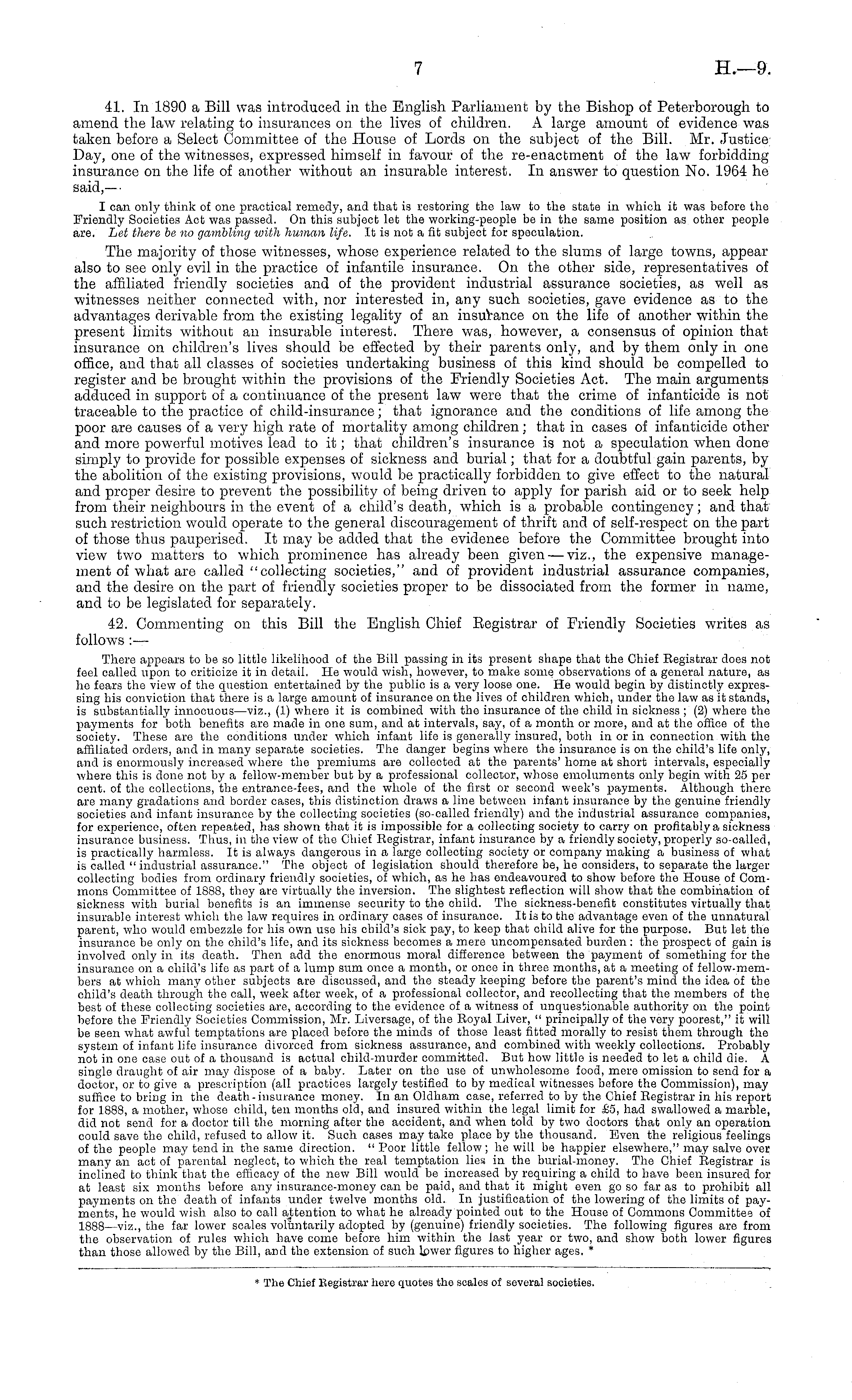 41. In 1890 a Bill was introduced in the English Parliament by the Bishop of Peterborough to amend the law relating to insurances on the lives of children. A large amount of evidence was taken before a Select Committee of the House of Lords on the subject of the Bill. Mr. Justice Day, one of the witnesses, expressed himself in favour of the re-enactment of the law forbidding insurance on the life of another without an insurable interest. In answer to question No. 1964 he said,— • I can only think of one practical remedy, and that is restoring the law to the state in which it was before the Friendly Societies Act was passed. On this subject let the working-people be in the same position as other people are. Let there be no gambling with human life. It is not a fit subject for speculation. The majority of those witnesses, whose experience related to the slums of large towns, appear also to see only evil in the practice of infantile insurance. On the other side, representatives of the affiliated friendly societies and of the provident industrial assurance societies, as well as witnesses neither connected with, nor interested in, any such societies, gave evidence as to the advantages derivable from the existing legality of an insurance on the life of another within the present limits without an insurable interest. There was, however, a consensus of opinion that insurance on children's lives should be effected by their parents only, and by them only in one office, and that all classes of societies undertaking business of this kind should be compelled to register and be brought within the provisions of the Friendly Societies Act. The main arguments adduced in support of a continuance of the present law were that the crime of infanticide is not traceable to the practice of child-insurance; that ignorance and the conditions of life among the poor are causes of a very high rate of mortality among children; that in cases of infanticide other and more powerful motives lead to it; that children's insurance is not a speculation when done simply to provide for possible expenses of sickness and burial; that for a doubtful gain parents, by the abolition of the existing provisions, would be practically forbidden to give effect to the natural and proper desire to prevent the possibility of being driven to apply for parish aid or to seek help from their neighbours in the event of a child's death, which is a probable contingency; and that such restriction would operate to the general discouragement of thrift and of self-respect on the part of those thus pauperised. It may be added that the evidenee before the Committee brought into view two matters to which prominence has already been given — viz., the expensive management of what are called "collecting societies," and of provident industrial assurance companies, and the desire on the part of friendly societies proper to be dissociated from the former in name, and to be legislated for separately. 42. Commenting on this Bill the English Chief Registrar of Friendly Societies writes as follows :— There appears to be so little likelihood of the Bill passing in its present shape that the Chief Eegistrar does not feel called upon to criticize it in detail. He would wish, however, to make some observations of a general nature, as he fears the view of the question entertained by the public is a very loose one. He would begin by distinctly expressing his conviction that there is a large amount of insurance on the lives of children which, under the law as it stands, is substantially innocuous—viz., (1) where it is combined with the insurance of the child in sickness ; (2) where the payments for both benefits arc made in one sum, and at intervals, say, of a month or more, and at the office of the society. These are the conditions under which infant life is generally insured, both in or in connection with the affiliated orders, and in many separate societies. The danger begins where the insurance is on the child's life only, and is enormously increased where the premiums are collected at the parents' home at short intervals, especially where this is done not by a fellow-member but by a professional collector, whose emoluments only begin with 25 per cent, of the collections, the entrance-fees, and the whole of the first or second week's payments. Although there are many gradations and border cases, this distinction draws a line between infant insurance by the genuine friendly societies and infant insurance by the collecting societies (so-called friendly) and the industrial assurance companies, for experience, often repeated, has shown that it is impossible for a collecting society to carry on profitably a sickness insurance business. Thus, in the view of the Chief Registrar, infant insurance by a friendly society, properly so-called, is practically harmless. It is always dangerous in a large collecting society or company making a business of what is called " industrial assurance." The object of legislation should therefore be, he considers, to separate the larger collecting bodies from ordinary friendly societies, of which, as he has endeavoured to show before the House of Commons Committee of 1888, they are virtually the inversion. The slightest reflection will show that the combination of sickness with burial benefits is an immense security to the child. The sickness-benefit constitutes virtually that insurable interest which the law requires in ordinary cases of insurance. It is to the advantage even of the unnatural parent, who would embezzle for his own use his child's sick pay, to keep that child alive for the purpose. But let the insurance be only on the child's life, and its sickness becomes a mere uncompensated burden : the prospect of gain is involved only in its death. Then add the enormous moral difference between tho payment of something for the insurance on a child's life as part of a lump sum once a month, or once in three months, at a meeting o