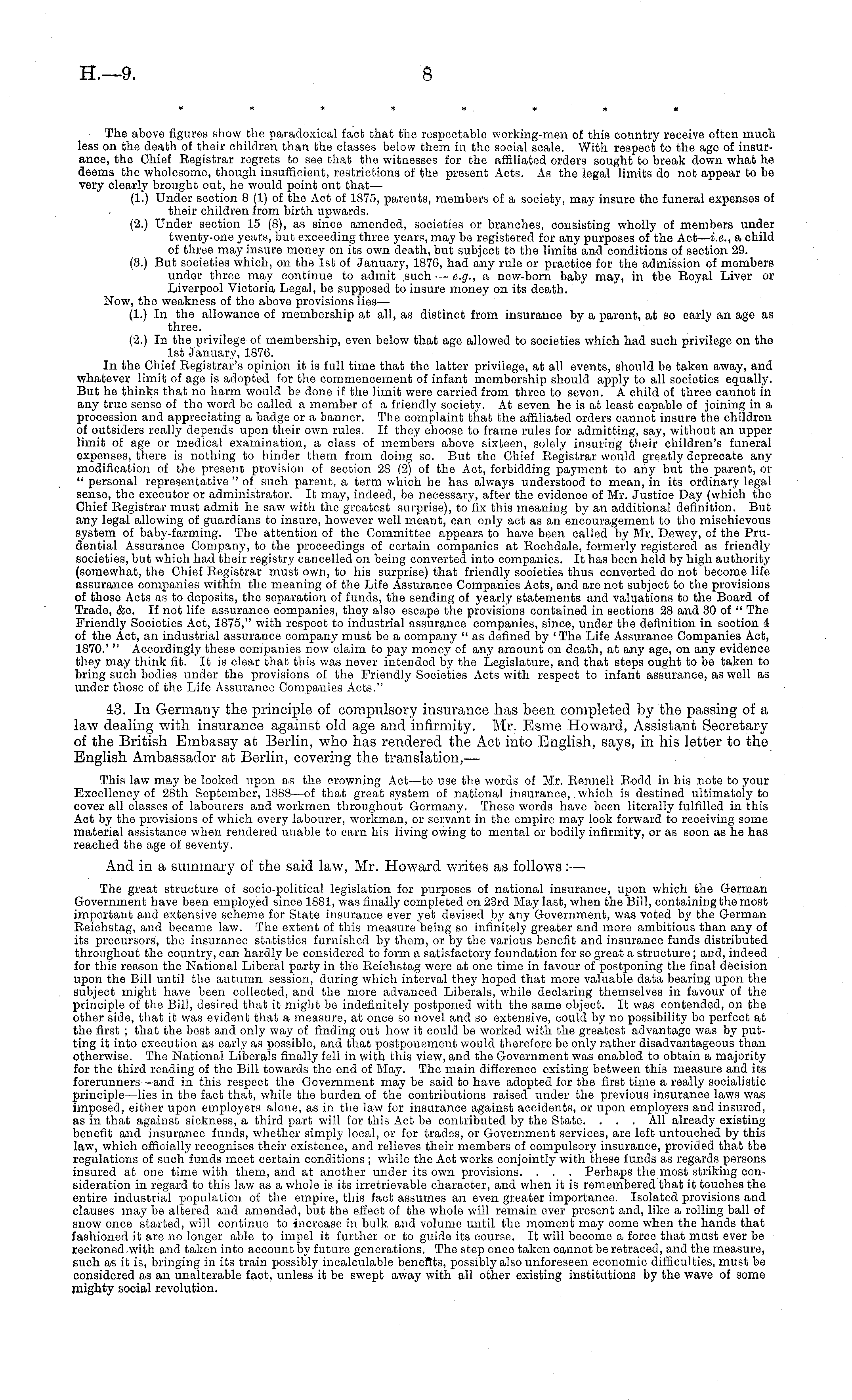 ******** The above figures show the paradoxical fact that the respectable working-men of this country receive often much less on the death of their children than the classes below them in the social scale. With respect to the age of insurance, the Chief Registrar regrets to see that the witnesses for the affiliated orders sought to break down what he deems the wholesome, though insufficient, restrictions of the present Acts. As the legal limits do not appear to be very clearly brought out, he-would point out that — (1.) Under section 8 (1) of the Act of 1875, parents, members of a society, may insure the funeral expenses of their children from birth upwards. (2.) Under section 15 (8), as since amended, societies or branches, consisting wholly of members under twenty-one years, but exceeding three years, may be registered for any purposes of the Act — i.e., a child of three may insure money on its own death, but subject to the limits and conditions of section 29. (3.) But societies which, on the Ist of January, 1876, had any rule or practice for the admission of members under three may continue to admit such — e.g., a new-born baby may, in the Eoyal Liver or Liverpool Victoria Legal, be supposed to insure money on its death. Now, the weakness of the above provisions lies— (1.) In the allowance of membership at all, as distinct from insurance by a parent, at so early an ago as three. (2.) In the privilege of membership, even below that age allowed to societies which had such privilege on the Ist January, 1876. In the Chief Registrar's opinion it is full time that the latter privilege, at all events, should be taken away, and whatever limit of age is adopted for the commencement of infant membership should apply to all societies equally. But he thinks that no harm would be done if the limit were carried from three to seven. A child of three cannot in any true sense of the word be called a member of a friendly society. At seven he is at least capable of joining in a procession and appreciating a badge or a banner. The complaint that the affiliated orders cannot insure the children of outsiders really depends upon their own rules. If they choose to frame rules for admitting, say, without an upper limit of age or medical examination, a class of members above sixteen, solely insuring their children's funeral expenses, there is nothing to hinder them from doing so. But the Chief Registrar would greatly deprecate any modification of the present provision of section 28 (2) of the Act, forbidding payment to any but the parent, or "personal representative " of such parent, a term which he has always understood to mean, in its ordinary legal sense, the executor or administrator. It may, indeed, be necessary, after the evidence of Mr. Justice Day (which the Chief Registrar must admit he saw with the greatest surprise), to fix this meaning by an additional definition. But any legal allowing of guardians to insure, however well meant, can only act as an encouragement to the mischievous system of baby-farming. The attention of the Committee appears to have been called by Mr. Dewey, of the Prudential Assurance Company, to the proceedings of certain companies at Rochdale, formerly registered as friendly societies, but which had their registry cancelled on being converted into companies. It has been held by high authority (somewhat, the Chief Registrar must own, to his surprise) that friendly societies thus converted do not become life assurance companies within the meaning of the Life Assurance Companies Acts, and are not subject to the provisions of those Acts as to deposits, the separation of funds, the sending of yearly statements and valuations to the Board of Trade, &c. If not life assurance companies, they also escape the provisions contained in sections 28 and 30 of " The Friendly Societies Act, 1875," with respect to industrial assurance companies, since, under the definition in section i of the Act, an industrial assurance company must be a company " as denned by 'The Life Assurance Companies Act, 1870.' " Accordingly these companies now claim to pay money of any amount on death, at any age, on any evidence they may think fit. It is clear that this was never intended by the Legislature, and that steps ought to be taken to bring such bodies under the provisions of the Friendly Societies Acts with respect to infant assurance, as well as under those of the Life Assurance Companies Acts." 43. In Germany the principle of compulsory insurance has been completed by the passing of a law dealing with insurance against old age and infirmity. Mr. Esme Howard, Assistant Secretary of the British Embassy at Berlin, who has rendered the Act into English, says, in his letter to the English Ambassador at Berlin, covering the translation, — This law may be looked upon as the crowning Act—to use the words of Mr. Rennell Rodd in his note to your Excellency of 28th September, 1888—of that great system of national insurance, which is destined ultimately to cover all classes of labourers and workmen throughout Germany. These words have been literally fulfilled in this Act by the provisions of which every labourer, workman, or servant in the empire may look forward to receiving some material assistance when rendered unable to earn his living owing to mental or bodily infirmity, or as soon as he has reached the age of seventy. And in a summary of the said law, Mr. Howard writes as follows: — The great structure of socio-political legislation for purposes of national insurance, upon which the German Government have been employed since 1881, was finally completed on 23rd May last, when the Bill, containingthemost important and extensive scheme for State insurance ever yet devised by any Government, was voted bj' the German Reichstag, and became law. The extent of this measure being so infinitely greater and more ambitious than any of its precursors, the insurance statistics furnished by them, or by the vario
