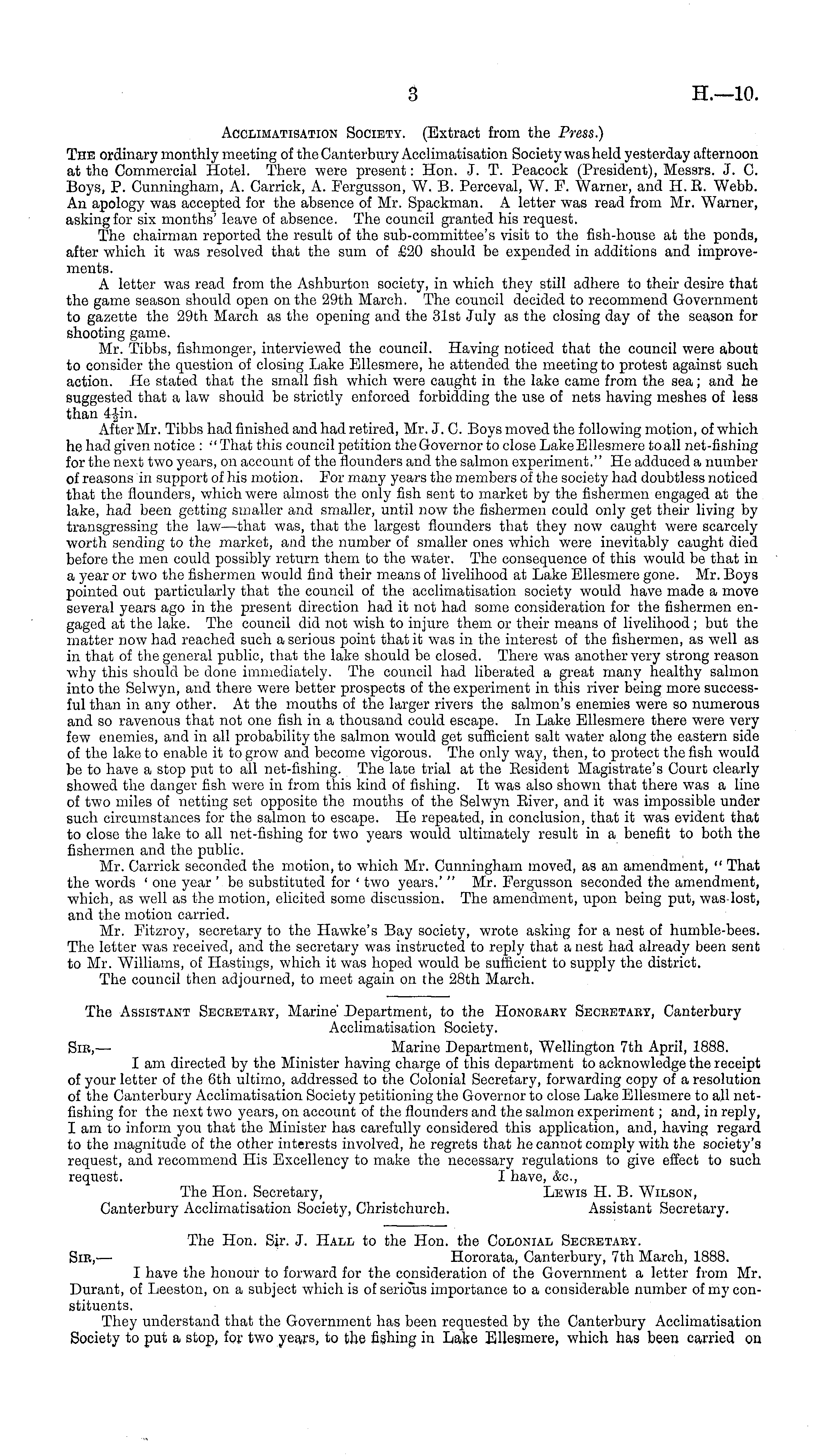 The Assistant Secretary, Marine' Department, to the Honorary Secretary, Canterbury Acclimatisation Society. Sir, — Marine Department, Wellington 7th April, 1888. I am directed by the Minister having charge of this department to acknowledge the receipt of your letter of the 6th ultimo, addressed to the Colonial Secretary, forwarding copy of a resolution of the Canterbury Acclimatisation Society petitioning the Governor to close Lake Ellesmere to all netfishing for the next two years, on account of the flounders and the salmon experiment; and, in reply, I am to inform you that the Minister has carefully considered this application, and, having regard to the magnitude of the other interests involved, he regrets that he cannot comply with the society's request, and recommend His Excellency to make the necessary regulations to give effect to such request. I have, &c, The Hon. Secretary, Lewis H. B. Wilson, Canterbury Acclimatisation Society, Christchurch. Assistant Secretary.