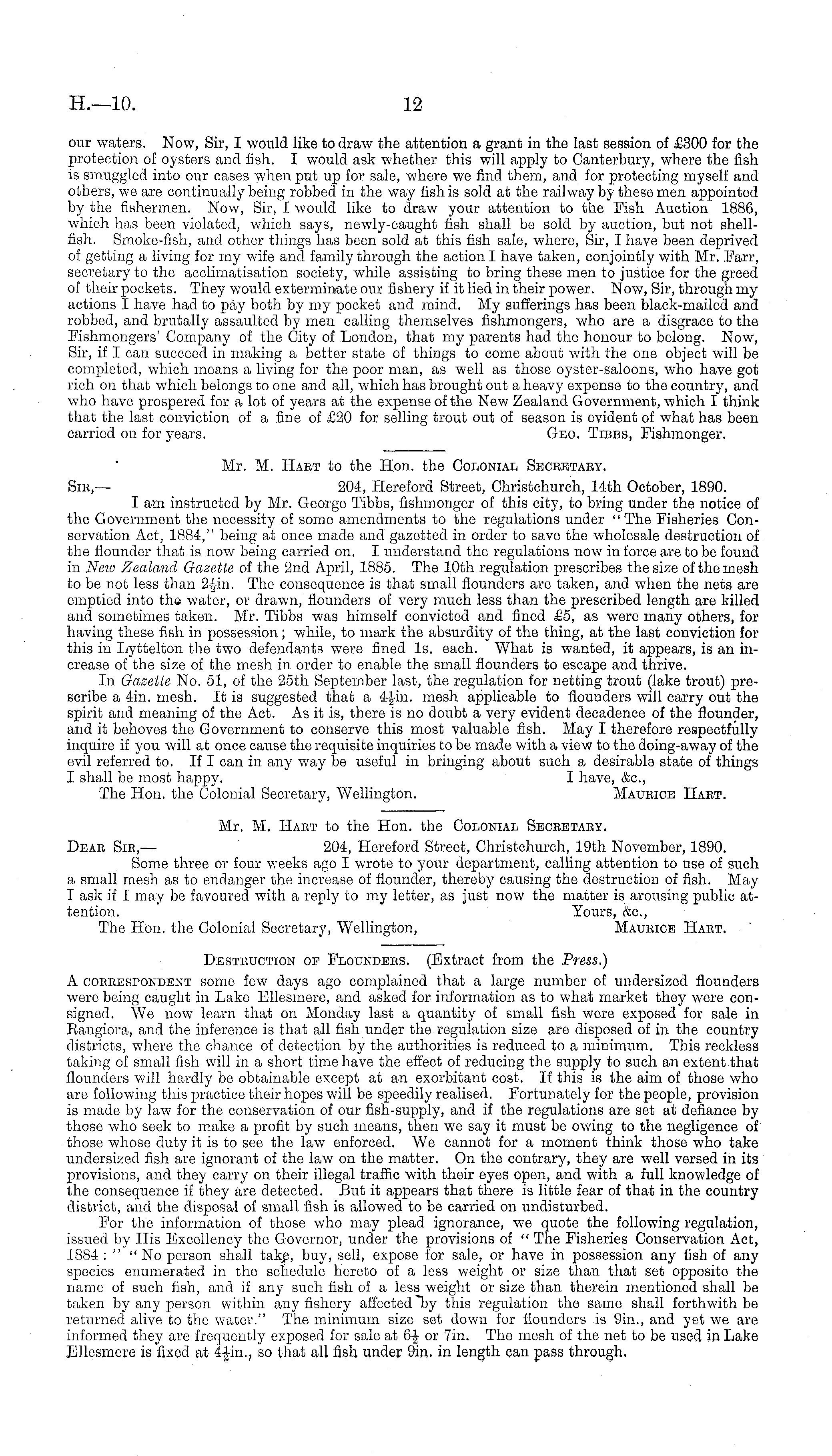 Mr. M. Haet to the Hon. the Colonial Secretaey. Sib,— 204, Hereford Street, Christchurch, 14th October, 1890. I am instructed by Mr. George Tibbs, fishmonger of this city, to bring under the notice of the Government the necessity of some amendments to the regulations under " The Fisheries Conservation Act, 1884," being at once made and gazetted in order to save the wholesale destruction of the flounder that is now being carried on. I understand the regulations now in force are to be found in New Zealand Gazette of the 2nd April, 1885. The 10th regulation prescribes the size of the mesh to be not less than 2-Jin. The consequence is that small flounders are taken, and when the nets are emptied into the water, or drawn, flounders of very much less than the prescribed length are killed and sometimes taken. Mr. Tibbs was himself convicted and fined £5, as were many others, for having these fish in possession; while, to mark the absurdity of the thing, at the last conviction for this in Lyttelton the two defendants were fined Is. each. What is wanted, it appears, is an increase of the size of the mesh in order to enable the small flounders to escape and thrive. In Gazette No. 51, of the 25th September last, the regulation for netting trout (lake trout) prescribe a 4in. mesh. It is suggested that a 4-Jin. mesh applicable to flounders will carry out the spirit and meaning of the Act. As it is, there is no doubt a very evident decadence of the flounder, and it behoves the Government to conserve this most valuable fish. May I therefore respectfully inquire if you will at once cause the requisite inquiries to be made with a view to the doing-away of the evil referred to. If I can in any way be useful in bringing about such a desirable state of things I shall be most happy. I have, &c, The Hon. the Colonial Secretary, Wellington. Maueice Haet.