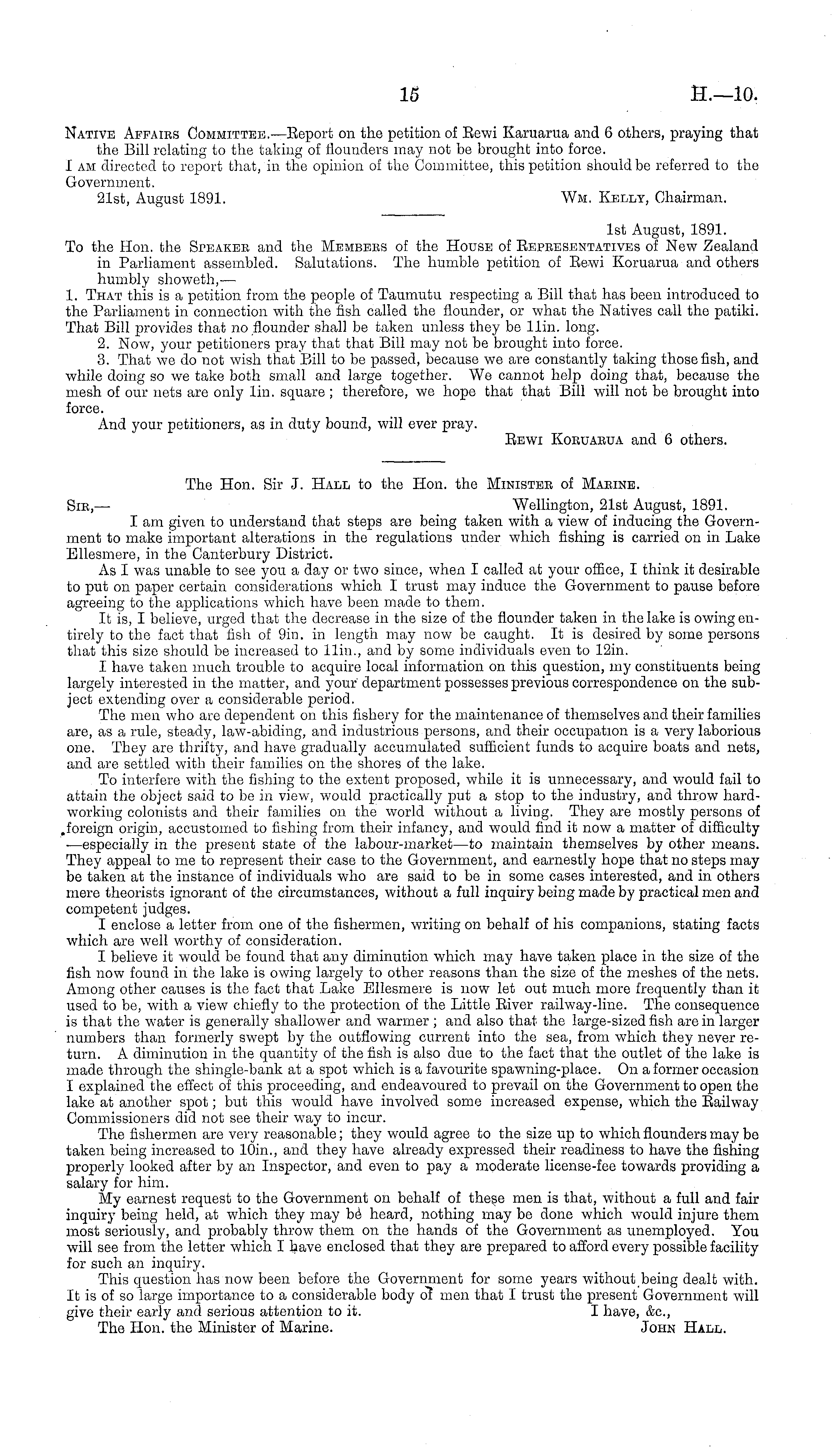 Native Affairs Committee.—Report on the petition of Rewi Karuarua and 6 others, praying that the Bill relating to the taking of flounders may not be brought into force. I am directed to report that, in the opinion of the Committee, this petition should be referred to the Government. 21st, August 1891. Wm. Kelly, Chairman.