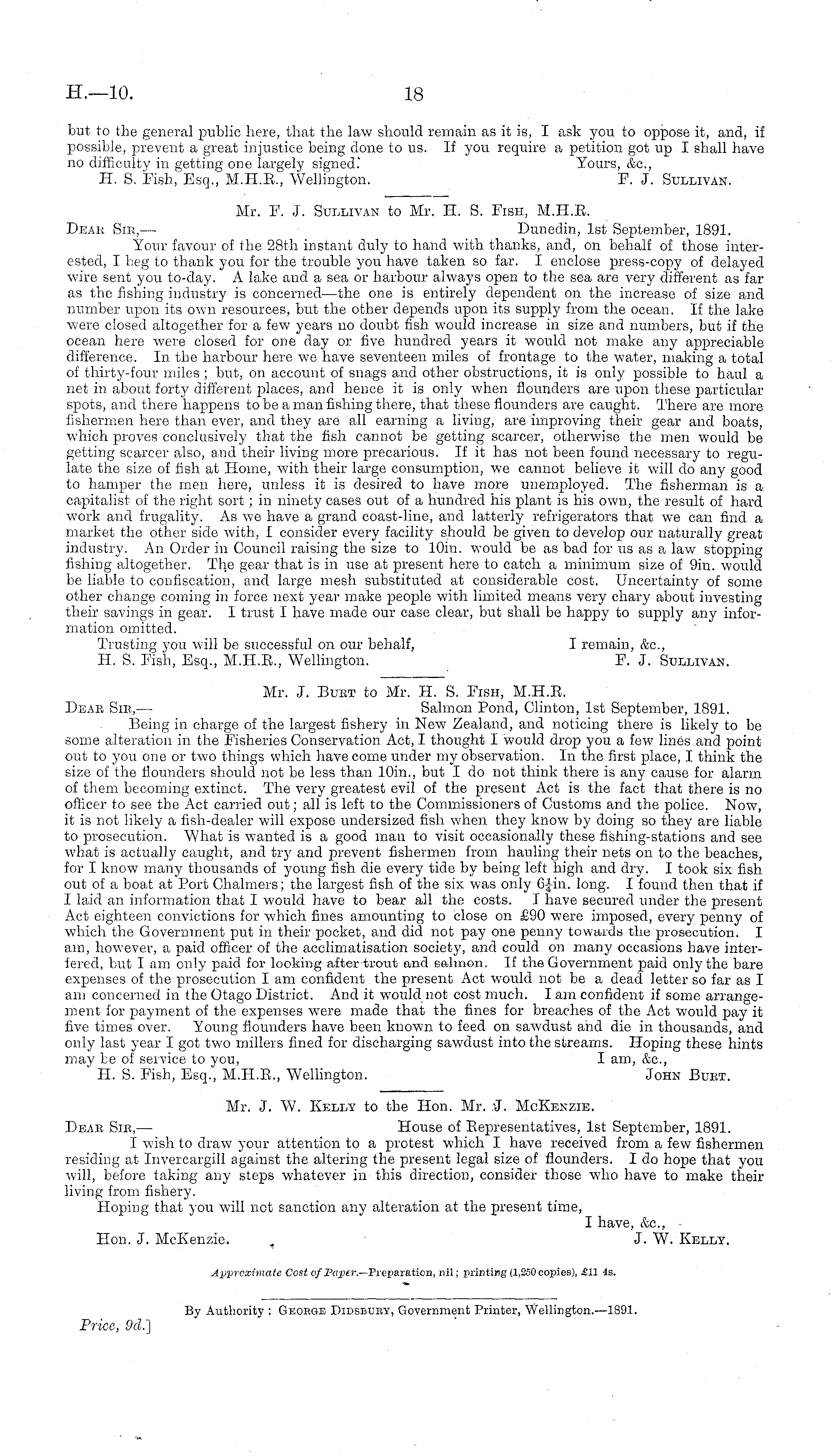 Mr. F. J. Sullivan to Mr. H. S. Fish, M.H.E. Deab Sic, — Dunedin, Ist September, 1891. Your favour of the 28th instant duly to hand with thanks, and, on behalf of those interested, I beg to thank you for the trouble you have taken so far. I enclose press-copy of delayed wire sent you to-day. A lake and a sea or harbour always open to the sea are very different as far as the fishing industry is concerned—the one is entirely dependent on the increase of size and number upon its own resources, but the other depends upon its supply from the ocean. If the lake were closed altogether for a few years no doubt fish would increase in size and numbers, but if the ocean here were closed for one day or five hundred years it would not make any appreciable difference. In the harbour here we have seventeen miles of frontage to the water, making a total of thirty-four miles ; but, on account of snags and other obstructions, it is only possible to haul a net in about forty different 23laces, and hence it is only when flounders are upon these particular spots, and there happens to be a man fishing there, that these flounders are caught. There are more fishermen here than, ever, and they are all earning a living, are improving their gear and boats, which proves conclusively that the fish cannot be getting scarcer, otherwise the men would be getting scarcer also, and their living more precarious. If it has not been found necessary to regulate the size of fish at Home, with their large consumption, we cannot believe it will do any good to hamper the men here, unless it is desired to have more unemployed. The fisherman is a capitalist of the right sort ; in ninety cases out of a hundred his plant is his own, the result of hard work and frugality. As we have a grand coast-line, and latterly refrigerators that we can find a market the other side with, I consider every facility should be given to develop our naturally great industry. An Order in Council raising the size to 10in. would be as bad for us as a law stopping fishing altogether. The gear that is in use at present here to catch a minimum size of 9iu. would be liable to confiscation, and large mesh substituted at considerable cost. Uncertainty of some other change coming in force next year make people with limited means very chary about investing their savings in gear. I trust I have made our case clear, but shall be happy to supply any information omitted. Trusting you will be successful on our behalf, I remain, &c, H. S. Fish, Esq., M.H.E., Wellington. F. J. Sullivan.