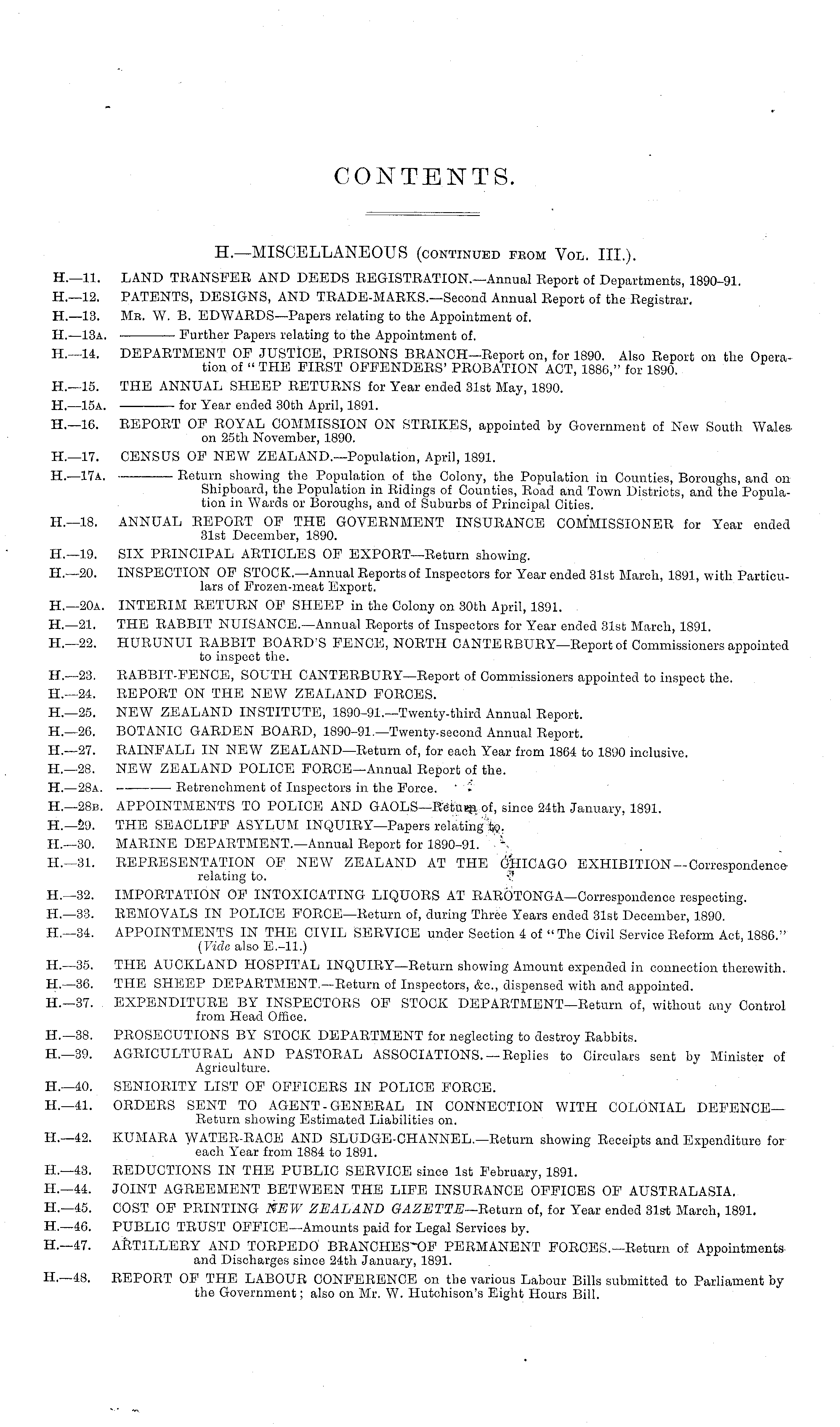 H.—MISCELLANEOUS (continued feom Vol. III.). H.—ll. LAND TRANSFER AND DEEDS REGISTRATION.—AnnuaI Report of Departments, 1890-91. H.—l2. PATENTS, DESIGNS, AND TRADE-MARKS.—Second Annual Report of the Registrar. H.—l3. Me. W. B. EDWARDS—Papers relating to the Appointment of. H. —13a. Further Papers relating to the Appointment of. H.—l4. DEPARTMENT OP JUSTICE, PRISONS BRANCH—Report on, for 1890. Also Report on the Operation of " THE FIRST OFFENDERS' PROBATION ACT, 1886," for 1890.. H.—l6. THE ANNUAL SHEEP RETURNS for Year ended 31st May, 1890. H.— lsa. for Year ended 30th April, 1891. H.—l6. REPORT OF ROYAL COMMISSION ON STRIKES, appointed by Government of New South Waleson 25th November, 1890. H.— l7. CENSUS OF NEW ZEALAND.—Population, April, 1891. H. — l7A. Return showing the Population of the Colony, the Population in Counties, Boroughs, and on Shipboard, the Population in Ridings of Counties, Road and Town Districts, and the Population in Wards or Boroughs, and of Suburbs of Principal Cities. H.—lB. ANNUAL REPORT OF THE GOVERNMENT INSURANCE COMMISSIONER for Year ended 31st December, 1890. H.— l9. SIX PRINCIPAL ARTICLES OF EXPORT—Return showing. H.—2o. INSPECTION OF STOCK.—Annual Reports of Inspectors for Year ended 31st March, 1891, with Particulars of Frozen-meat Export. H.—2oa. INTERIM RETURN OF SHEEP in the Colony on 30th April, 1891. H.—2l. THE RABBIT NUISANCE.—AnnuaI Reports of Inspectors for Year ended 31st March, 1891. H.—22. HURUNUI RABBIT BOARD'S PENCE, NORTH CANTE BBURY—Report of Commissioners appointed to inspect the. H.—23. RABBIT-EENCE, SOUTH CANTERBURY—Report of Commissioners appointed to inspect the. H.—24. REPORT ON THE NEW ZEALAND FORCES. H.—25. NEW ZEALAND INSTITUTE, 1890-91.—Twenty-third Annual Report. H.—2G. BOTANIC GARDEN BOARD, 1890-91.—Twenty-second Annual Report. H.—27. RAINFALL IN NEW ZEALAND—Return of, for each Year from 1864 to 1890 inclusive. H.—2B. NEW ZEALAND POLICE FORCE—Annual Report of the. H.—2Ba. Retrenchment of Inspectors in the Force. H.—2Bb. APPOINTMENTS TO POLICE AND GAOLS—Return of, since 24th January, 1891. H.—29. THE SEACLIFF ASYLUM INQUIRY—Papers relating to. H.—3o. MARINE DEPARTMENT.—AnnuaI Report for 1890-91. lH.—3l. REPRESENTATION OF NEW ZEALAND AT THE CHICAGO EXHIBITION — Corfespondaaoft relating to. ■? H.—32. IMPORTATION OF INTOXICATING LIQUORS AT RAROTONGA—Correspondence respecting. H.—33. REMOVALS IN POLICE FORCE—Return of, during Three Years ended 31st December, 1890. H.—34. APPOINTMENTS IN THE CIVIL SERVICE under Section 4 of "The Civil Service Reform Act, 1886." (Vide also E.-ll.) H.—35. THE AUCKLAND HOSPITAL INQUIRY—Return showing Amount expended in connection therewith. H.—36. THE SHEEP DEPARTMENT.—Return of Inspectors, &c, dispensed with and appointed. H.—37. EXPENDITURE BY INSPECTORS OF STOCK DEPARTMENT—Return of, without any Control from Head Office. H.—3B. PROSECUTIONS BY STOCK DEPARTMENT for neglecting to destroy Rabbits. H.—39. AGRICULTURAL AND PASTORAL ASSOCIATIONS. —Replies to Circulars sent by Minister of Agriculture. H.—4o. SENIORITY LIST OP OFFICERS IN POLICE FORCE. H.—4l. ORDERS SENT TO AGENT-GENERAL IN CONNECTION WITH COLONIAL DEFENCE— Return showing Estimated Liabilities on. H.—42. KUMARA WATER-RACE AND SLUDGE-CHANNEL.—Return showing Receipts and Expenditure for each Year from 1884 to 1891. H.—43. REDUCTIONS IN THE PUBLIC SERVICE since Ist February, 1891. H.—44. JOINT AGREEMENT BETWEEN THE LIFE INSURANCE OFFICES OF AUSTRALASIA. H.—45. COST OF PRINTING NEW ZEALAND GAZETTE— Return of, for Year ended 31st March, 1891. H.—46. PUBLIC TRUST OFFlCE—Amounts paid for Legal Services by. H.—47. ARTILLERY AND TORPEDO BRANCHES-OF PERMANENT FORCES.—Return of Appointmentsand Discharges since 24th January, 1891. H.—4B. REPORT OF THE LABOUR CONFERENCE on the various Labour Bills submitted to Parliament by the Government; also on Mr. W. Hutchison's Eight Hours Bill.