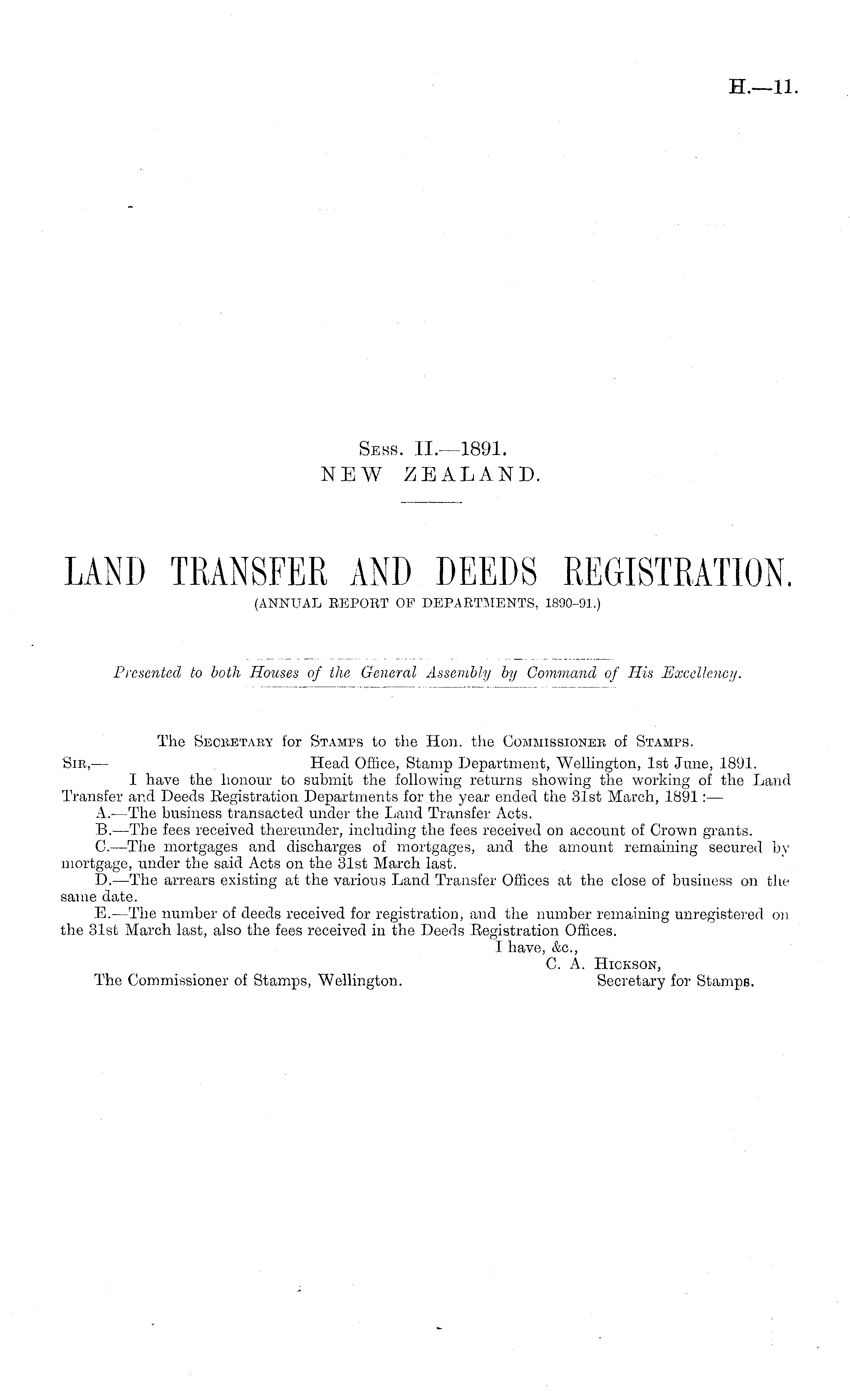 The Secretary for Stamps to the Hon. the Commissioner of Stamps. Sir, — Head Office, Stamp Department, Wellington, Ist June, 1891. I have the honour to submit the following returns showing the working of the Land Transfer and Deeds Eegistration Departments for the year ended the 31st March, 1891: — A.—The business transacted under the Land Transfer Acts. B.—The fees received thereunder, including the fees received on account of Crown grants. C.—The mortgages and discharges of mortgages, and the amount remaining secured by mortgage, under the said Acts on the 31st March last. D. —The arrears existing at the various Land Transfer Offices at the close of business on the same date. E.—The number of deeds received for registration, and the number remaining unregistered on the 31st March last, also the fees received in the Deeds Registration Offices. I have, &c, C. A. Hickson, The Commissioner of Stamps, Wellington. Secretary for Stamps.