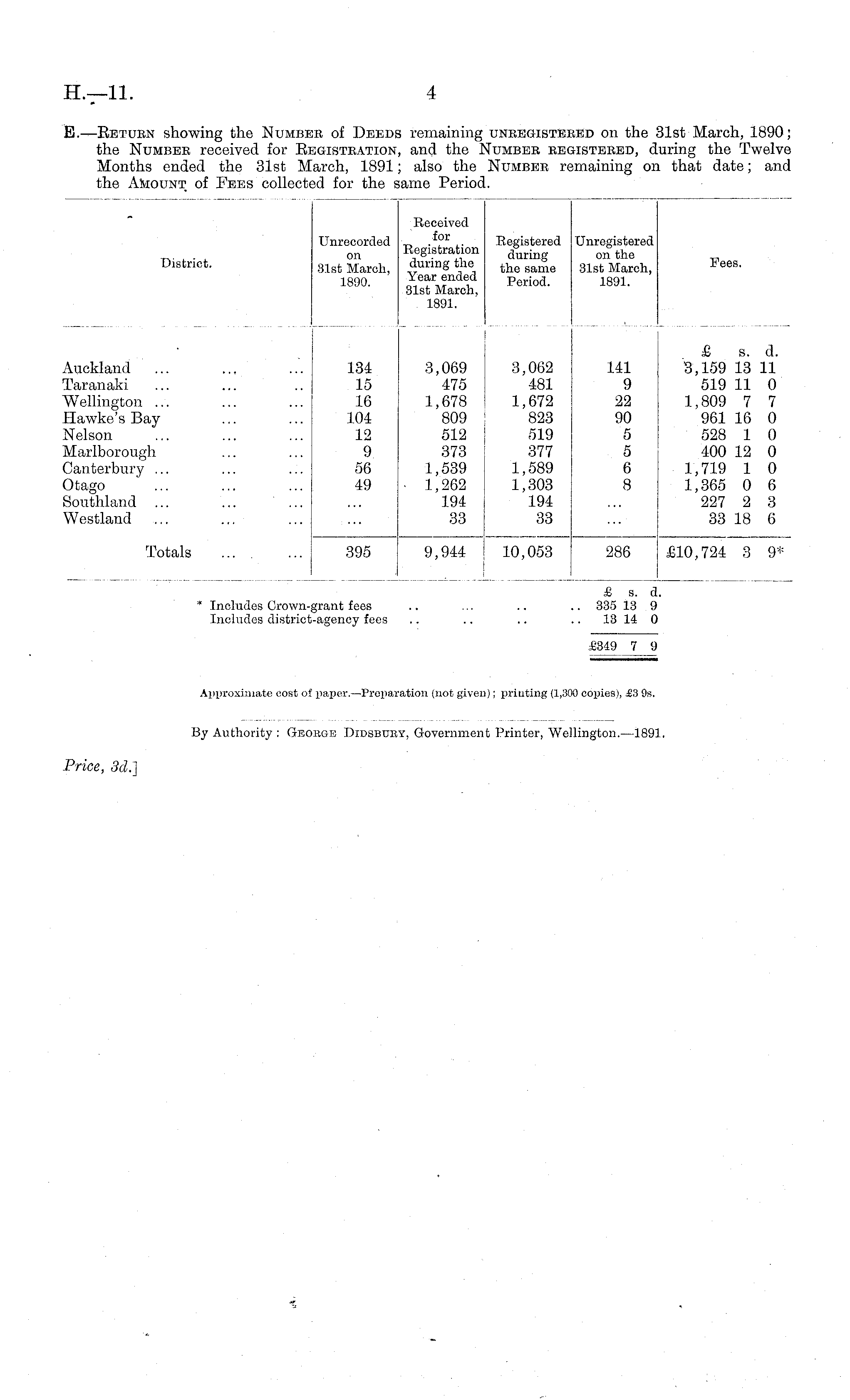E.—Return showing the Number of Deeds remaining unregistered on the 31st March, 1890; the Number received for Registration, and the Number registered, during the Twelve Months ended the 31st March, 1891; also the Number remaining on that date; and the Amount of Fees collected for the same Period.