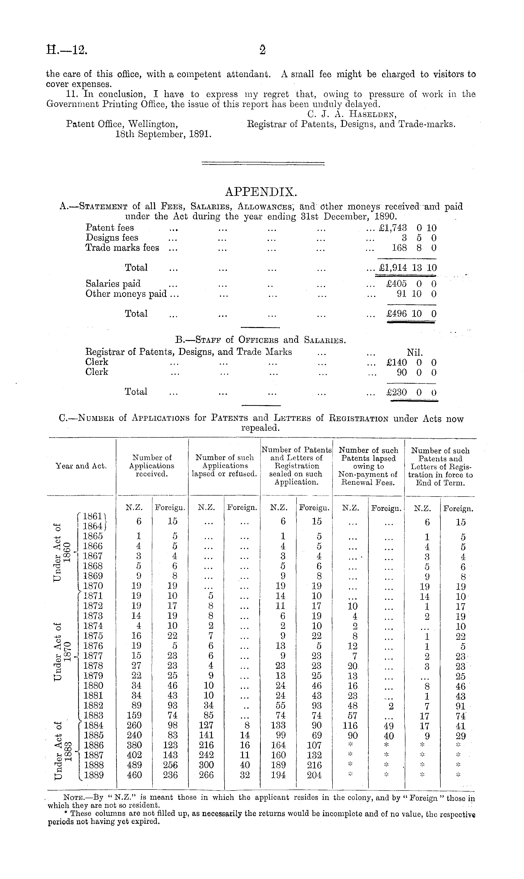 the care of this office, with a competent attendant. A small fee might be charged to visitors to cover expenses. 11. In conclusion, I have to express my regret that, owing to pressure of work in the Government Printing Office, the issue of this report has been unduly delayed. C. J. A. Haselden, Patent Office, Wellington, Eegistrar of Patents, Designs, and Trade-marks. 18th September, 1891.