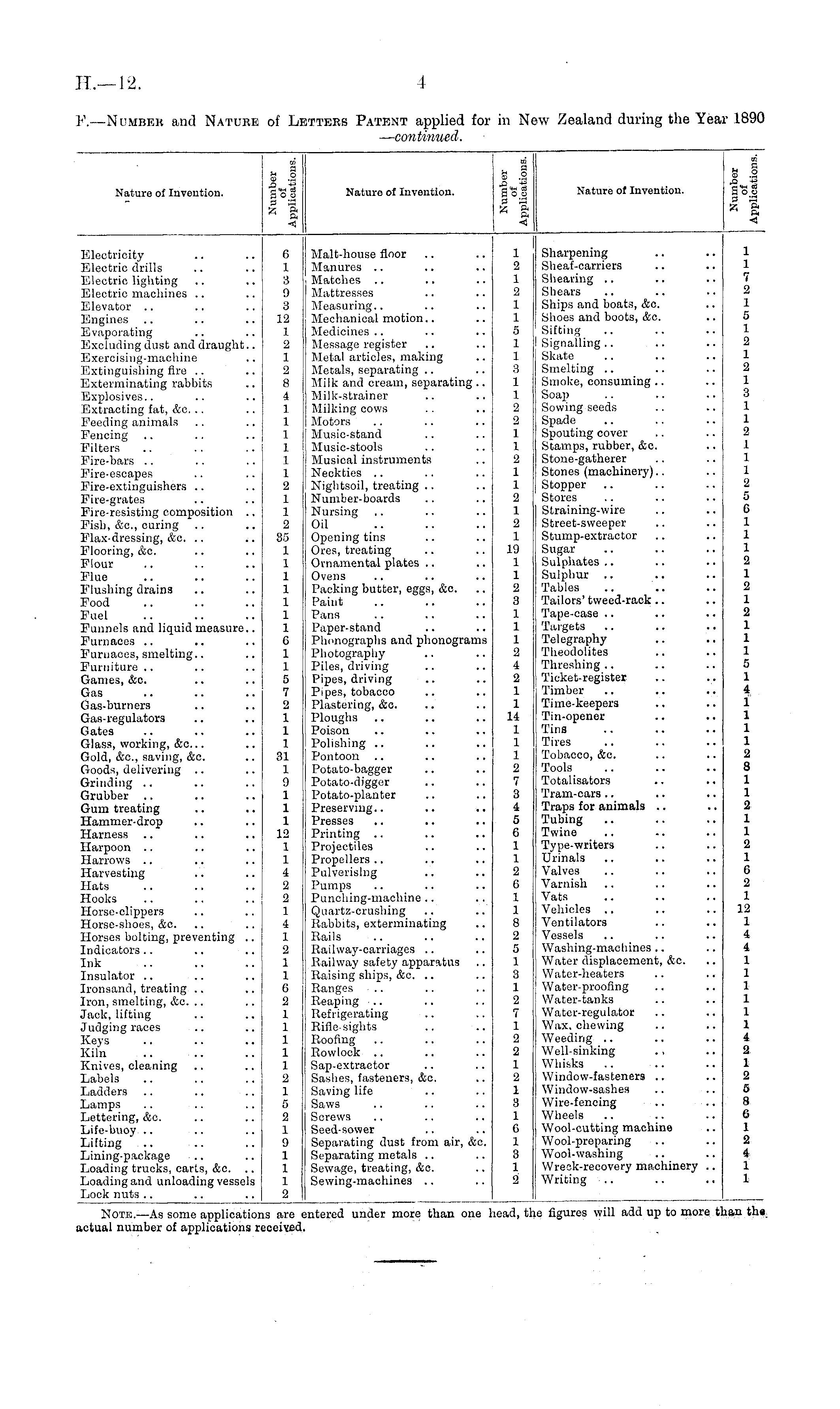 F. —Number and Nature of Letters Patent applied for in New Zealand during the Year 1890 — continued.