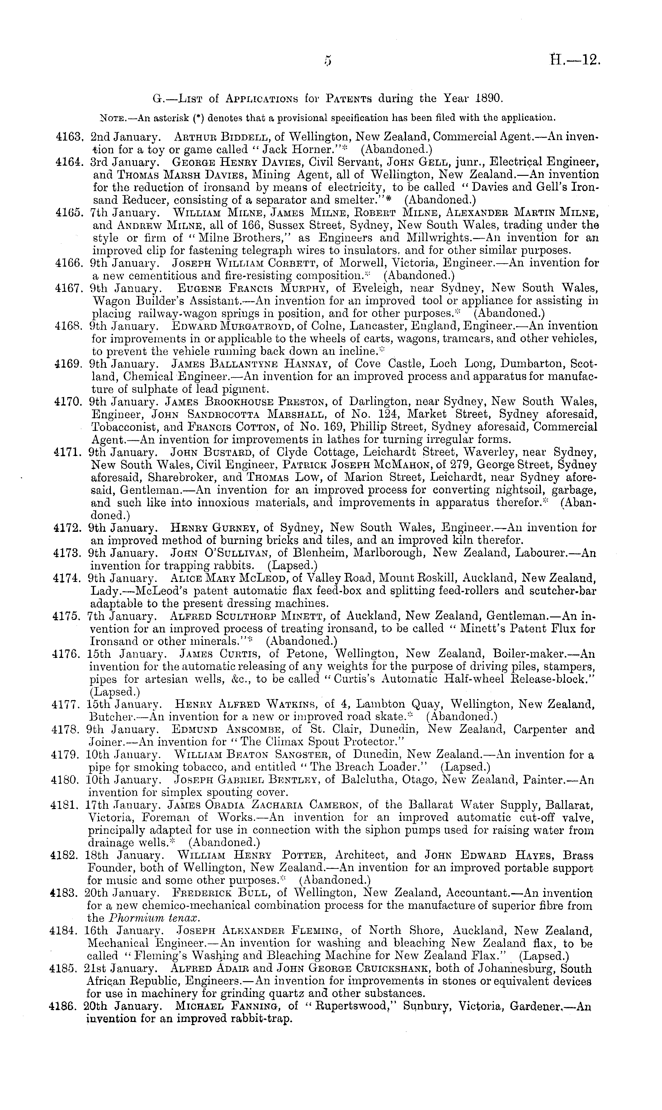 G.—List of Applications for Patents during the Year 1890. JfoiE. —An asterisk (*) denotes that a provisional specification has been filed with the application. 4163, 2nd January. Arthur Biddell, of Wellington, New Zealand, Commercial Agent.—An invention for a toy or game called " Jack Homer."* (Abandoned.) 4164. 3rd January. George Henry Davies, Civil Servant, John Gell, junr., Electrical Engineer, and Thomas Marsh Davies, Mining Agent, all of Wellington, New Zealand.—An invention for the reduction of ironsand by means of electricity, to be called " Davies and Gell's Ironsand Reducer, consisting of a separator and smelter."* (Abandoned.) 41G5. 7th January. William Milne, James Milne, Robert Milne, Alexander Martin Milne, and Andrew Milne, all of 166, Sussex Street, Sydney, New South Wales, trading under the style or firm of " Milne Brothers," as Engineers and Millwrights.—An invention for an improved clip for fastening telegraph wires to insulators, and for other similar purposes. 4166. 9th January. Joseph William Corbett, of Morwell, Victoria, Engineer.—An invention for a new cementitious and fire-resisting composition.* (Abandoned.) 4167. 9th January. Eugene Francis Murphy, of Eveleigh, near Sydney, New South Wales, Wagon Builder's Assistant.—An invention for an improved tool or appliance for assisting in placing railway-wagon springs in position, and for other purposes.* (Abandoned.) 4168. 9th January. Edward Murgatroyd, of Colne, Lancaster, England, Engineer.-—An invention for improvements in or applicable to the wheels of carts, wagons, tramcars, and other vehicles, to prevent the vehicle running back down an incline." 4169. 9th January. James Ballantyne Hannay, of Cove Castle, Loch Long, Dumbarton, Scotland, Chemical Engineer.—An invention for an improved process and apparatus for manufacture of sulphate of lead pigment. 4170. 9th January. James Brookhouse Preston, of Darlington, near Sydney, New South Wales, Engineer, John Sandrocotta Marshall, of No. 124, Market Street, Sydney aforesaid, Tobacconist, and Francis Cotton, of No. 169, Phillip Street, Sydney aforesaid, Commercial Agent. —An invention for improvements in lathes for turning irregular forms. 4171. 9th January. John Bustard, of Clyde Cottage, Leichardt Street, Waverley, near Sydney, New South Wales, Civil Engineer, Patrick Joseph McMahon, of 279, George Street, Sydney aforesaid, Sharebroker, and Thomas Low, of Marion Street, Leichardt, near Sydney aforesaid, Gentleman.—An invention for an improved process for converting nightsoil, garbage, and such like into innoxious materials, and improvements in apparatus therefor.* (Abandoned.) 4172. 9th January. Henry Gurney, of Sydney, New South Wales, Engineer.—An invention for an improved method of burning bricks and tiles, and an improved kiln therefor. 4173. 9th January. John O'Sullivan, of Blenheim, Marlborough, New Zealand, Labourer.—An invention for trapping rabbits. (Lapsed.) 4174. 9th January. Alice Mary McLeod, of Valley Road, Mount Roskill, Auckland, New Zealand, Lady.—McLeod's patent automatic flax feed-box and splitting feed-rollers and scutcher-bar adaptable to the present dressing machines. 4175. 7th January. Alfred Sculthorp Minett, of Auckland, New Zealand, Gentleman.—An invention for an improved process of treating ironsand, to be called " Minett's Patent Flux for Ironsand or other minerals."* (Abandoned.) 4176. 15th January. James Curtis, of Petone, Wellington, New Zealand, Boiler-maker.—An invention for the automatic releasing of any weights for the purpose of driving piles, stampers, pipes for artesian wells, &c, to be called " Curtis's Automatic Half-wheel Release-block." (Lapsed.) 4177. loth January. Henry Alfred Watkins, of 4, Lambton Quay, Wellington, New Zealand, Butcher. —An invention for a new or improved road skate.* (Abandoned.) 4178. 9th January. Edmund Anscombe, of St. Glair; Dunedin, New Zealand, Carpenter and Joiner.—An invention for " The Climax Spout Protector." 4179. 10th January. William Beaton Sangster, of Dunedin, New Zealand.—An invention for a pipe fpr smoking tobacco, and entitled " The Breach Loader." (Lapsed.) 4180. 10th January. Joseph Gabriel Bentley, of Balclutha, Otago, New Zealand, Painter.—An invention for simplex spouting cover. 4181. 17th January. James Obadia Zacharia Cameron, of the Ballarat Water Supply, Ballarat, Victoria, Foreman of Works. —An invention for an improved automatic cut-off valve, principally adapted for use in connection with the siphon pumps used for raising water from drainage wells.* (Abandoned.) 4182. 18th January. William Henry Potter, /Architect, and John Edward Hayes, Brass Founder, both of Wellington, New Zealand.—An invention for an improved portable support for music and some other purposes.* (Abandoned.) 4183. 20th January. Frederick Bull, of Wellington, New Zealand, Accountant.—An invention for a new chemico-mechanical combination process for the manufacture of superior fibre from the Phormium tenax. 4184. 16th January. Joseph Alexander Fleming, of North Shore, Auckland, New Zealand, Mechanical Engineer. —An invention for washing and bleaching New Zealand flax, to be called "Fleming's Washing and Bleaching Machine for New Zealand Flax." (Lapsed.) 4185. 21st January. Alfred Adair and John George Cruickshank, both of Johannesburg, South Afriqan Republic, Engineers.—An invention for improvements in stones or equivalent devices for use in machinery for grinding quartz and other substances. 4186. 20th. January. Michael Fanning, of " Rupertswood," Sunbury, Victoria, Gardener,—An invention for an improved rabbit-trap.