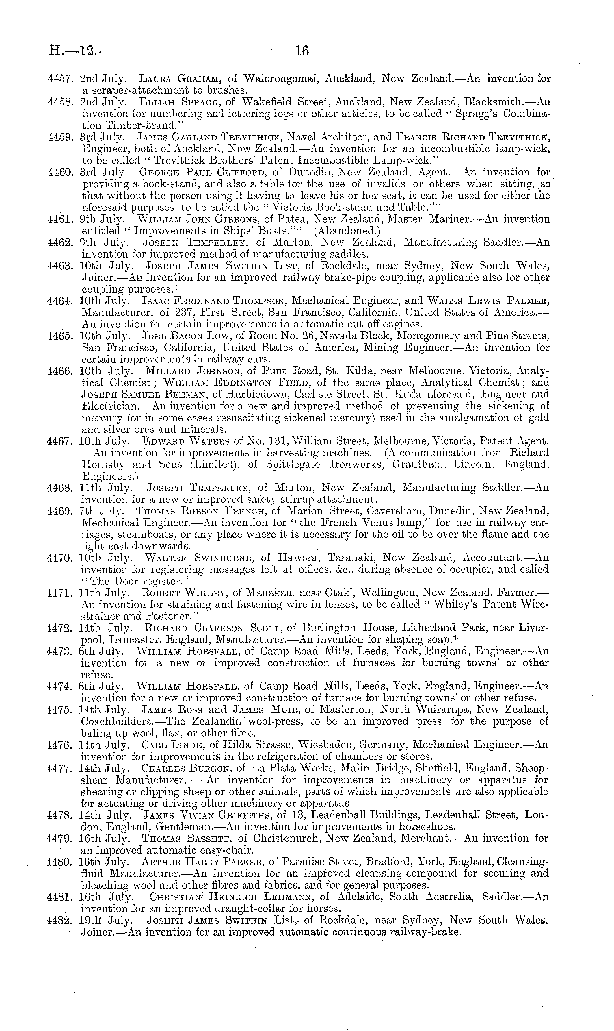 4457. 2nd July. Laura Graham, of Waiorongomai, Auckland, New Zealand.—An invention for a scraper-attachment to brushes. 4438. 2nd July. Elijah Speagg, of Wakefield Street, Auckland, New Zealand, Blacksmith.—An invention for numbering and lettering logs or other articles, to be called " Spragg's Combination Timber-brand." 445.9. 3r.d July. James Garland Trevithick, Naval Architect, and Francis Eichaed Teevithick, Engineer, both of Auckland, New Zealand.—An invention for an incombustible lamp-wick, to be called " Trevithick Brothers' Patent Incombustible Lamp-wick." 4460. 3rd July. Geoege Paul Clippoed, of Dunedin, New Zealand, Agent. —An invention for providing a book-stand, and also a table for the use of invalids or others when sitting, so that -without the person using it having to leave his or her seat, it can be used for either the aforesaid purposes, to be called the "Victoria Book-stand and Table."* 4461. 9th July. William John Gibbons, of Patea, New Zealand, Master Mariner.—An invention entitled " Improvements in Ships' Boats."* (Abandoned.) 4462. 9th July. Joseph Tempeeley, of Marton, New Zealand, Manufacturing Saddler.—An invention for improved method of manufacturing saddles. 4463. 10th July. Joseph James Swithin List, of Eockdale, near Sydney, New South Wales, Joiner. —An invention for an improved railway brake-pipe coupling, applicable also for other coupling purposes.* 4464. 10th July. Isaac Feedinand Thompson, Mechanical Engineer, and Wales Lewis Palmer, Manufacturer, of 237, First Street, San Francisco, California, United States of America.— An invention for certain improvements in automatic cut-off engines. 4465. 10th July. Joel Bacon Low, of Eoom No. 26, Nevada Block, Montgomery and Pine Streets, San Francisco, California, United States of America, Mining Engineer. —An invention for certain improvements in railway cars. 4466. 10th July. Millaed Johnson, of Punt Eoad, St. Kilda, near Melbourne, Victoria, Analytical Chemist; William Eddington Field, of the same place, Analytical Chemist; and Joseph Samuel Beeman, of Harbledown, Carlisle Street, St. Kilda aforesaid, Engineer and Electrician. —An invention for a new and improved method of preventing the sickening of mercury (or in some cases resuscitating sickened mercury) used in the amalgamation of gold and silver ores and minerals. 4467. 10th July. Edwaed Wateeb of No. 131, William Street, Melbourne, Victoria, Patent xigent. —An invention for improvements in harvesting machines. (A communication from Eichard Hornsby and Sons (Limited), of Spittlegate Ironworks, Grantham, Lincoln, England, Engineers.) 4468. 11th July. Joseph Tempeeley, of Marton, New Zealand, Manufacturing Saddler.—An invention for a new or improved safety-stirrup attachment. 4469. 7th July. Thomas Eobson French, of Marion Street, Cavershain, Dunedin, New Zealand, Mechanical Engineer. —An invention for "the French Venus lamp," for use in railway carriages, steamboats, or any place where it is necessary for the oil to be over the flame and the light cast downwards. 4470. 10th July. Waltee Swinburne, of Hawera, Taranaki, New Zealand, Accountant.—An invention for registering messages left at offices, &c, during absence of occupier, and called " The Door-register." 4471. 11th July. Eobeet Whiley, of Manakau, near Otaki, Wellington, New Zealand, Farmer.— An invention for straining and fastening wire in fences, to be called " Whiley's Patent Wirestrainer and Fastener." 4472. 14th July. Eichaed Claekson Scott, of Burlington House, Litherland Park, near Liverpool, Lancaster, England, Manufacturer. —An invention for shaping soap.* 4473. Bth July. William Hoesfall, of Camp Eoad Mills, Leeds, York, England, Engineer.—An invention for a new or improved construction of furnaces for burning towns' or other refuse. 4474. Bth July. William Hobsfall, of Camp Eoad Mills, Leeds, York, England, Engineer.—An invention for a new or improved construction of furnace for burning towns' or other refuse. 4475. 14th July. James Eoss and James Muie, of Masterton, North Wairarapa, New Zealand, Coachbuilders.—The Zealandia wool-press, to be an improved press for the purpose of baling-up wool, flax, or other fibre. 4476. 14th July. Gael Linde, of Hilda Strasse, Wiesbaden, Germany, Mechanical Engineer.—An invention for improvements in the refrigeration of chambers or stores. 4477. 14th July. Charles Burgon, of La Plata Works, Malm Bridge, Sheffield, England, Sheepshear Manufacturer. —An invention for improvements in machinery or apparatus for shearing or clipping sheep or other animals, parts of which improvements are also applicable for actuating or driving other machinery or apparatus. 4478. 14th July. Jambs Vivian Griffiths, of 13, Leadenhall Buildings, Leadenhall Street, London, England, Gentleman.—An invention for improvements in horseshoes. 4479. 16th July. Thomas Bassett, of Christchurch, New Zealand, Merchant..—An invention for an improved automatic easy-chair. 4480. 16th July. Arthue Haeey Parkee, of Paradise Street, Bradford, York, England, Cleansingfluid Manufacturer.—An invention for an improved cleansing compound for scouring and bleaching wool and other fibres and fabrics, and for general purposes. 4481. 16th July. Christian" Heineich Lehmann, of Adelaide, South Australia, Saddler.—An invention for an improved draught-collar for horses. 4482. 19tll July. Joseph James Swithin List, of Eockdale, near Sydney, New South Wales, Joiner.—An invention for an improved automatic continuous railway-brake.