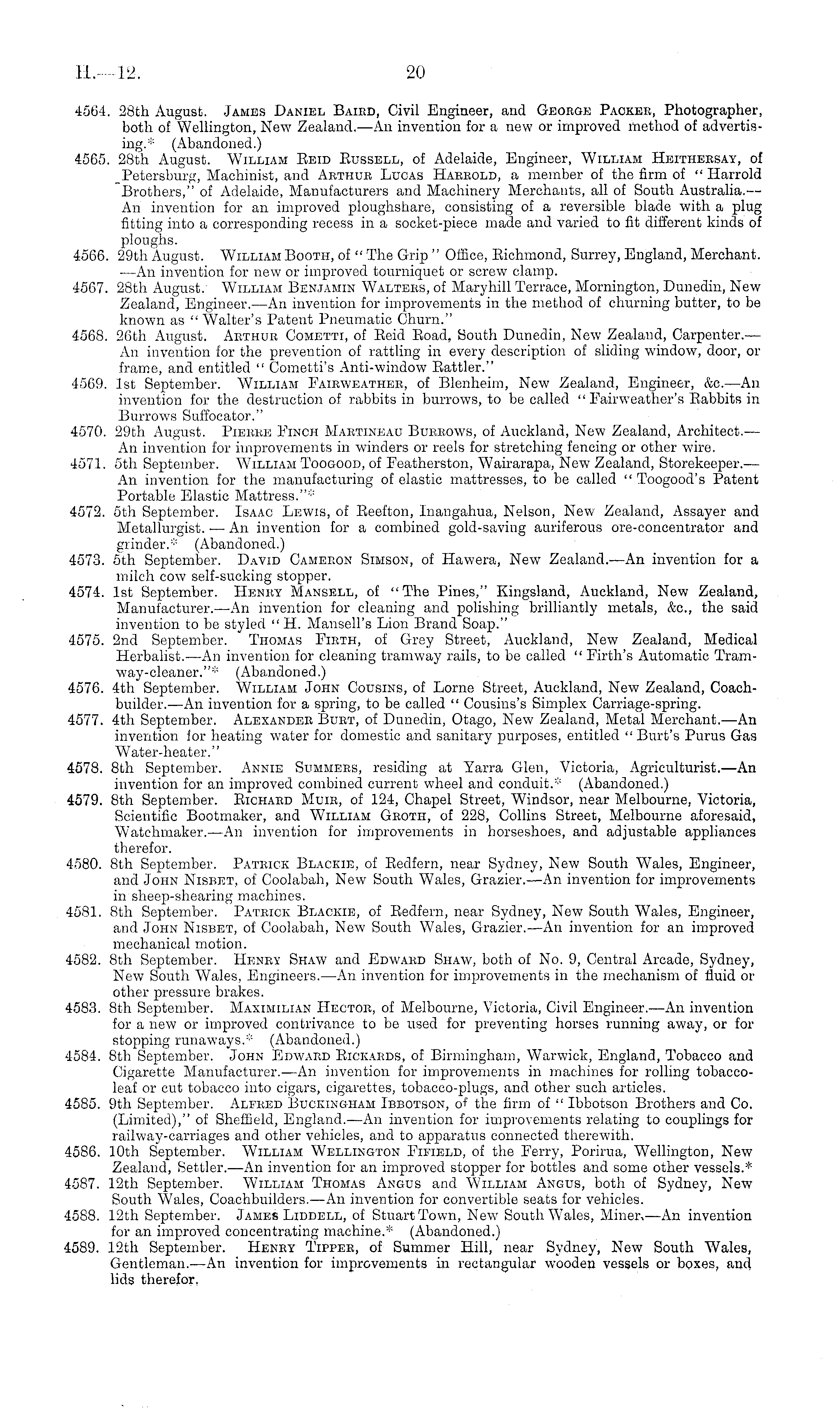 4564. 28th August. James Daniel Baied, Civil Engineer, and George Paokee, Photographer, both of Wellington, New Zealand.—An invention for a new or improved method of advertising.* (Abandoned.) 4565. 28th August. William Eeid Eussell, of Adelaide, Engineer, William Heithebsay, of _ Petersburg, Machinist, and Aethub Lucas Haeeold, a member of the firm of " Harrold "Brothers," of Adelaide, Manufacturers and Machinery Merchants, all of South Australia.— An invention for an improved ploughshare, consisting of a reversible blade with a plug fitting into a corresponding recess in a socket-piece made and varied to fit different kinds of ploughs. 4566. 29th August. William Booth, of " The Grip " Office, Eichmond, Surrey, England, Merchant. —An invention for new or improved tourniquet or screw clamp. 4567. 28th August. William Benjamin Waltees, of Maryhill Terrace, Mornington, Dunedin, New Zealand, Engineer.—An invention for improvements in the method of churning butter, to be known as "Walter's Patent Pneumatic Churn." 4568. 26th August. Aethub Cometti, of Eeid Eoad, South Dunedin, New Zealand, Carpenter.— An invention for the prevention of rattling in every description of sliding window, door, or frame, and entitled " Cometti's Anti-window Eattler." 4569. Ist September. William Faieweatheb, of Blenheim, New Zealand, Engineer, &c.—An invention for the destruction of rabbits in burrows, to be called " Fairweather's Eabbits in Burrows Suffocator." 4570. 29th August. Piebee Finch Maetineau Bubbows, of Auckland, New Zealand, Architect. — An invention for improvements in winders or reels for stretching fencing or other wire. 4571. sth September. William Toogood, of Eeatherston, Wairarapa, New Zealand, Storekeeper.— An invention for the manufacturing of elastic mattresses, to be called " Toogood's Patent Portable Elastic Mattress."* 4572. sth September. Isaac Lewis, of Eeefton, Inangahua, Nelson, New Zealand, Assayer and Metallurgist. ■ — An invention for a combined gold-saving auriferous ore-concentrator and grinder.* (Abandoned.) 4573. sth September. David Camebon Simson, of Hawera, New Zealand.—An invention for a milch cow self-sucking stopper. 4574. Ist September. Henby Mansell, of "The Pines," Kingsland, Auckland, New Zealand, Manufacturer. —An invention for cleaning and polishing brilliantly metals, &c, the said invention to be styled " H. Mansell's Lion Brand Soap." 4575. 2nd September. Thomas Fibth, of Grey Street, Auckland, New Zealand, Medical Herbalist.—An invention for cleaning tramway rails, to be called " Firth's Automatic Tram-way-cleaner."* (Abandoned.) 4576. 4th September. William John Cousins, of Lome Street, Auckland, New Zealand, Coachbuilder.—An invention for a spring, to be called " Cousins's Simplex Carriage-spring. 4577. 4th September. Alexandeb Bubt, of Dunedin, Otago, New Zealand, Metal Merchant.—An invention for heating water for domestic and sanitary purposes, entitled " Burt's Purus Gas W 7ater-heater.'' 4578. Bth September. Annie Summebs, residing at Yarra Glen, Victoria, Agriculturist.—An invention for an improved combined current wheel and conduit.* (Abandoned.) 4579. Bth September. Eichaed Muie, of 124, Chapel Street, Windsor, near Melbourne, Victoria, Scientific Bootmaker, and William Geoth, of 228, Collins Street, Melbourne aforesaid, Watchmaker.—An invention for improvements in horseshoes, and adjustable appliances therefor. 4580. Bth September. Patbick Blackie, of Eedfern, near Sydney, New South Wales, Engineer, and John Nisbet, of Coolabah, New South Wales, Grazier. —An invention for improvements in sheep-shearing machines. 4581. Bth September. Patbick Blackie, of Eedfern, near Sydney, New South Wales, Engineer, and John Nisbet, of Goolabah, New South Wales, Grazier.—An invention for an improved mechanical motion. 4582. Bth September. Henby Shaw and Edwabd Shaw, both of No. 9, Central Arcade, Sydney, New South Wales, Engineers.—An invention for improvements in the mechanism of fluid or other pressure brakes. 4583. Bth September. Maximilian Hectoe, of Melbourne, Victoria, Civil Engineer.—An invention for a new or improved contrivance to be used for preventing horses running away, or for stopping runaways.* (Abandoned.) 4584. Bth September. John Edwabd Eickaeds, of Birmingham, Warwick, England, Tobacco and Cigarette Manufacturer.-—An invention for improvements in machines for rolling tobaccoleaf or cut tobacco into cigars, cigarettes, tobacco-plugs, and other such articles. 4585. 9th September. Alfbed Buckingham Ibbotson, of the firm of " Ibbotson Brothers and Co. (Limited)," of Sheffield, England.-—An invention for improvements relating to couplings for railway-carriages and other vehicles, and to apparatus connected therewith. 4586. 10th September. William Wellington Fifield, of the Ferry, Porirua, Wellington, New Zealand, Settler.—An invention for an improved stopper for bottles and some other vessels.* 4587. 12th September. William Thomas Angus and William Angus, both of Sydney, New South Wales, Coachbuilders.—An invention for convertible seats for vehicles. 4588. 12th September. James Liddell, of Stuart Town, New South Wales, Miner,—An invention for an improved concentrating machine.* (Abandoned.) 4589. 12th September. Heney Tippee, of Summer Hill, near Sydney, New South Wales, Gentleman.—An invention for improvements in rectangular wooden vessels or boxes, and lids therefor,