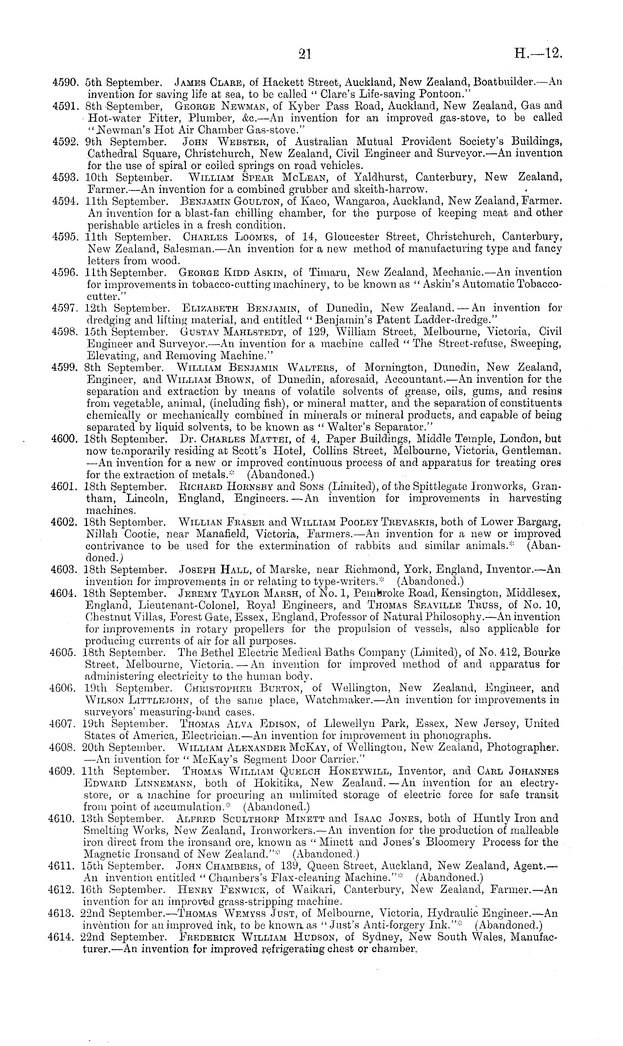 4590. sth September. Jambs Clare, of Hackett Street, Auckland, New Zealand, Boatbuilder. —An invention for saving life at sea, to be called " Clare's Life-saving Pontoon." 4591. Bth September, Geoege Newman, of Kyber Pass Eoad, Auckland, New Zealand, Gas and - Hot-water Fitter, Plumber, &c. —An invention for an improved gas-stove, to be called ".Newman's Hot Air Chamber Gas-stove." 4592. 9th September. John Webster, of Australian Mutual Provident Society's Buildings, Cathedral Square, Christclrurch, New Zealand, Civil Engineer and Surveyor.—An invention for the use of spiral or coiled springs on road vehicles. 4593. 10th September. William Speae McLean, of Yaldhurst, Canterbury, New Zealand, Farmer.—An invention for a combined grubber and skeith-harrow. 4594. 11th September. Benjamin Goulton, of Kaeo, Wangaroa, Auckland, New Zealand, Farmer. An invention for a blast-fan chilling chamber, for the purpose of keeping meat and other perishable articles in a fresh condition. 4595. 11th September. Charles Loomes, of 14, Gloucester Street, Christchurch, Canterbury, New Zealand, Salesman.—An invention for a new method of manufacturing type and fancy letters from wood. 4596. 11th September. Geoege Kidd Askin, of Timaru, New Zealand, Mechanic.—An invention for improvements in tobacco-cutting machinery, to be known as " Askin's Automatic Tobaccocutter." 4597. 12th September. Elizabeth Benjamin, of Dunedin, New Zealand. —An invention for dredging and lifting material, and entitled " Benjamin's Patent Ladder-dredge." 4598. 15th September. Gustav Mahlstedt, of 129, William Street, Melbourne, Victoria, Civil Engineer and Surveyor.—An invention for a machine called "The Street-refuse, Sweeping, Elevating, and Removing Machine." 4599. Bth September. William Benjamin Waltees, of Mornington, Dunedin, New Zealand, Engineer, and William Brown, of Dunedin, aforesaid, Accountant.—An invention for the separation and extraction by means of volatile solvents of grease, oils, gums, and resins from vegetable, animal, (including fish), or mineral matter, and the separation of constituents chemically or mechanically combined in minerals or mineral products, and capable of being separated by liquid solvents, to be known as " Walter's Separator." 4600. 18th September. Dr. Charles Mattei, of 4, Paper Buildings, Middle Temple, London, but now temporarily residing at Scott's Hotel, Collins Street, Melbourne, Victoria, Gentleman. —An invention for a new or improved continuous process of and apparatus for treating ores for the extraction of metals.* (Abandoned.) 4601. 18th September. Eichard Hornsby and Sons (Limited), of the Spittlegate Ironworks, Grantham, Lincoln, England, Engineers.—An invention for improvements in harvesting machines. 4602. 18th September. Willian Feasee and William Pooley Teevaskis, both of Lower Bargarg, Nillah Cootie, near Manafield, Victoria, Farmers. —An invention for a new or improved contrivance to be used for the extermination of rabbits and similar animals.* (Abandoned. ) 4603. 18th September. Joseph Hall, of Marske, near Eichmond, York, England, Inventor. —An invention for improvements in or relating to type-writers.* (Abandoned.) 4604. 18th September. Jeeemy Taylor Marsh, of No. 1, Pembroke Eoad, Kensington, Middlesex, England, Lieutenant-Colonel, Eoyal Engineers, and Thomas Seaville Truss, of No. 10, Chestnut Villas, Forest Gate, Essex, England, Professor of Natural Philosophy.—An invention for improvements in rotary propellers for the projnilsion of vessels, also applicable for producing currents of air for all purposes. 4605. 18th September. The Bethel Electric Medical Baths Company (Limited), of No. 412, Bourke Street, Melbourne, Victoria. —An invention for improved method of and apparatus for administering electricity to the human body. 4606. 19th September. Chkistophee Burton, of Wellington, New Zealand, Engineer, and Wilson Littlejohn, of the same place, Watchmaker.—An invention for improvements in surveyors' measuring-band cases. 4607. 19th September. Thomas Alva Edison, of Llewellyn Park, Essex, New Jersey, United States of America, Electrician.—An invention for improvement in phonographs. 4608. 20th September. William Alexander McKay, of Wellington, New Zealand, Photographer. —An invention for " McKay's Segment Door Carrier." 4609. 11th September. Thomas' William Quelch Honeywill, Inventor, and Carl Johannes Edward Linnemann, both of Hokitika, New Zealand.—An invention for an electrystore, or a machine for procuring an unlimited storage of electric force for safe transit from point of accumulation.* (Abandoned.) 4610. 13th September. Alfred Scdlthoep Minett and Isaac Jones, both of Huntly Iron and Smelting Works, New Zealand, Ironworkers. —An invention for the production of malleable iron direct from the ironsand ore, known as " Minett and Jones's Bloomery Process for the Magnetic Ironsand of New Zealand."* (Abandoned.) 4611. 15th September. John Chambees, of 139, Queen Street, Auckland, New Zealand, Agent.—An invention entitled " Chambers's Flax-cleaning Machine."* (Abandoned.) 4612. 16th September. Henry Fenwick, of Waikari, Canterbury, New Zealand, Farmer.—^An invention for an improved grass-stripping machine. 4613. 22nd September.—Thomas Wemyss Jdst, of Melbourne, Victoria, Hydraulic Engineer.—An invention for an improved ink, to be known, as " Just's Anti-forgery Ink."* (Abandoned.) 4614. 22nd September. Frederick William Hudson, of Sydney, New South Wales, Manufacturer. —An invention for improved refrigerating chest or chamber.