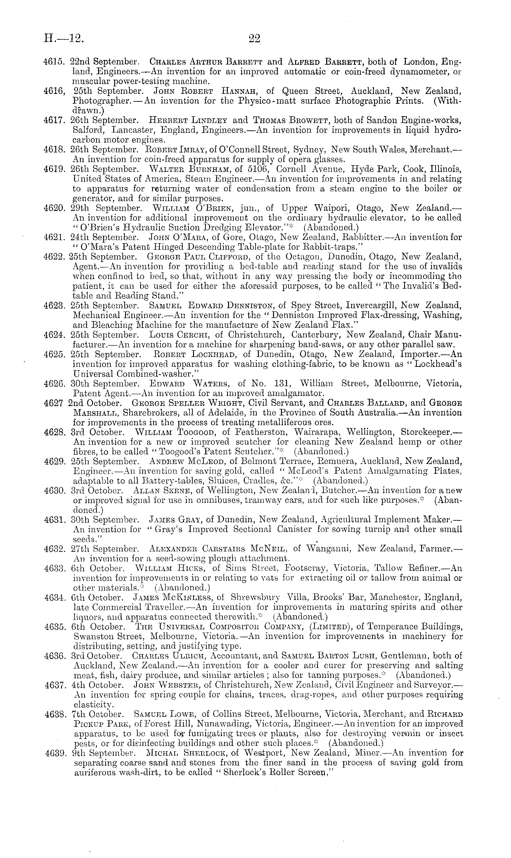 4615. 22nd September. Charles Arthur Barrett and Alfred Barrett, both of London, England, Engineers.—An invention for an improved automatic or coin-freed dynamometer, or muscular power-testing machine. 4616. 25th September. John Eobert Hannah, of Queen Street, Auckland, New Zealand, Photographer. —An invention for the Physioo-matt surface Photographic Prints. (Withdrawn .) 4617. 26th September. Herbert Lindley and Thomas Browett, both of Sandon Engine-works, Salford, Lancaster, England, Engineers.—An invention for improvements in liquid hydrocarbon motor engines. 4618. 26th September. Eobert Imeay, of O'Connell Street, Sydney, New South Wales, Merchant. — An invention for coin-freed apparatus for supply of opera glasses. 4619. 26th September. Walter Burnham, of 5106, Cornell Avenue, Hyde Park, Cook, Illinois, United States of America, Steam Engineer.—An invention for improvements in and relating to apparatus for returning water of condensation from a steam engine to the boiler or generator, and for similar purposes. 4620. 29th September. William O'Brien, jun., of Upper Waipori, Otago, New Zealand.— An invention for additional improvement on the ordinary hydraulic elevator, to be called " O'Brien's Hydraulic Suction Dredging Elevator."* (Abandoned.) 4621. 24th September. John O'Maba, of Gore, Otago, New Zealand, Babbitter.—An invention for " O'Mara's Patent Hinged Descending Table-plate for Eabbit-traps." 4622. 25th September. George Paul Clifford, of the Octagon, Dunedin, Otago, New Zealand, Agent.—An invention for providing a bed-table and reading stand for the use of invalids when confined to bed, so that, without in any way pressing the body or incommoding the patient, it can be used for either the aforesaid purposes, to be called "The Invalid's Bedtable and Beading Stand." 4623. 25th September. Samuel Edward Denniston, of Spey Street, Invercargill, New Zealand, Mechanical Engineer. —An invention for the " Denniston Improved Flax-dressing, Washing, and Bleaching Machine for the manufacture of New Zealand Flax." 4624. 25th September. Louis Cerchi, of Christchurch, Canterbury, New Zealand, Chair Manufacturer. —An invention for a machine for sharpening band-saws, or any other parallel saw. 4625. 25th September. Eobert Lookhead, of Dunedin, Otago, New Zealand, Importer.—An invention for improved apparatus for washing clothing-fabric, to be known as " Lockhead's Universal Combined-washer." 4626. 30th September. Edward Waters, of No. 131, William Street, Melbourne, Victoria, Patent Agent.—An invention for an improved amalgamator. 4627 2nd October. George Speller Wright, Civil Servant, and Charles Ballard, and Geoege Makshall, Sharebrokers, all of Adelaide, in the Province of South Australia. —An invention for improvements in the process of treating metalliferous ores. 4628. 3rd October. William Toogood, of Featherston, Wairarapa, Wellington, Storekeeper.— An invention for a new or improved scutcher for cleaning New Zealand hemp or other fibres, to be called " Toogood's Patent Scutcher."* (Abandoned.) 4629. 25th September. Andrew McLeod, of Belmont Terrace, Eemuera, Auckland, New Zealand, Engineer. —An invention for saving gold, called " McLeod's Patent Amalgamating Plates, adaptable to all Battery-tables, Sluices, Cradles, &c."* (Abandoned.) 4630. 3rd October. Allan Skene, of Wellington, New Zealani, Butcher.—An invention for anew or improved signal for use in omnibuses, tramway cars, and for such like purposes.* (Abandoned.) 4631. 30th September. James Gray, of Dunedin, New Zealand, Agricultural Implement Maker.— An invention for " Gray's Improved Sectional Canister for sowing turnip and other small seeds." 4632. 27th September. Alexander Carstaies McNeil, of Wanganui, New Zealand, Farmer.— An invention for a seed-sowing plough attachment. 4633. 6th October. William Hicks, of Sims Street, Footscray, Victoria, Tallow Eefiner.—An invention for improvements in or relating to vats for extracting oil or tallow from animal or other materials.* (Abandoned.) 4634. 6th October. James McKinless, of Shrewsbury Villa, Brooks' Bar, Manchester, England, late Commercial Traveller.—An invention for improvements in maturing spirits and other liquors, and apparatus connected therewith. * (Abandoned.) 4635. 6th October. The Universal Compositor Company, (Limited), of Temperance Buildings, Swanston Street, Melbourne, Victoria.—An invention for improvements in machinery for distributing, setting, and justifying type. 4636. 3rd October. Charles Ulrich, Accountant, and Samuel Barton Lush, Gentleman, both of Auckland, New Zealand.—An invention for a cooler and curer for preserving and salting meat, fish, dairy produce, and similar articles ; also for tanning purposes.* (Abandoned.) 4637. 4th October. John Webster, of Christchurch, New Zealand, Civil Engineer and Surveyor.— An invention for spring couple for chains, traces, drag-ropes, and other purposes requiring elasticity. 4638. 7th October. Samuel Lowe, of Collins Street, Melbourne, Victoria, Merchant, and Eichard Pickup Park, of Forest Hill, Nunawading, Victoria, Engineer.—An invention for an improved apparatus, to be used for fumigating trees or plants, also for destroying vermin or insect pests, or for disinfecting buildings and other such places.* (Abandoned.) 4639. 9th September. Michal Sherlock, of Westport, New. Zealand, Miner.—An invention for separating coarse sand and stones from the finer sand in the process of saving gold from auriferous wash-dirt, to be called " Sherlock's Boiler Screen,"