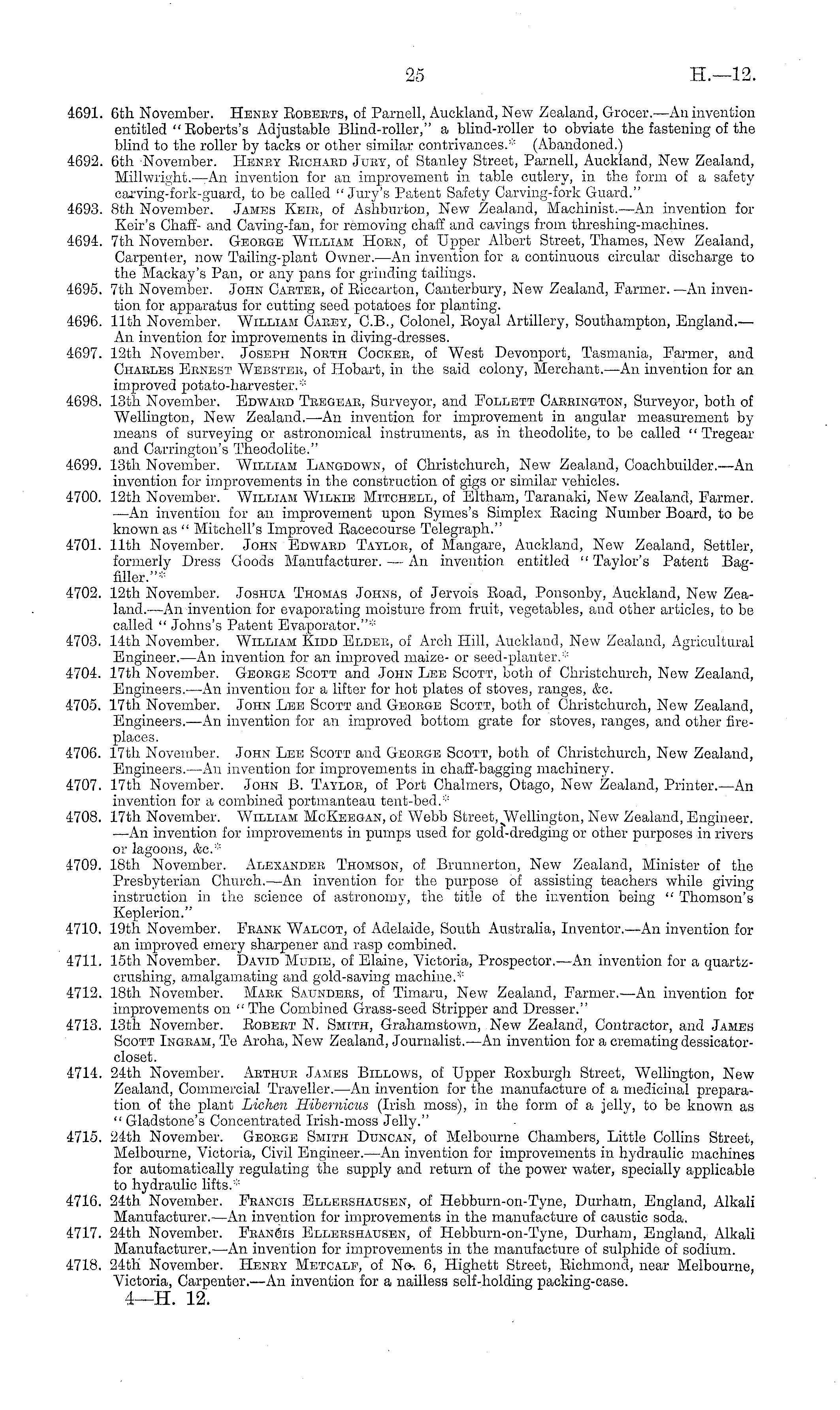 4691. 6fch November. Heney Eobebts, of Parnell, Auckland, New Zealand, Grocer.'—An invention entitled " Eoberts's Adjustable Blind-roller," a blind-roller to obviate the fastening of the blind to the roller by tacks or other similar contrivances.* (Abandoned.) 4692. 6th November. Henby Eichaed Juey, of Stanley Street, Parnell, Auckland, New Zealand, Millwright.-—An invention for an improvement in table cutlery, in the form of a safety carving-fork-guard, to be called "Jury's Patent Safety Carving-fork Guard." 4693. Bth November. James Keie, of Ashburton, New Zealand, Machinist.—An invention for Keir's Chaff- and Caving-fan, for removing chaff and cavings from threshing-machines. 4694. 7th November. Geobge William Hoen, of Upper Albert Street, Thames, New Zealand, Carpenter, now Tailing-plant Owner.—An invention for a continuous circular discharge to the Mackay's Pan, or any pans for grinding tailings. 4695. 7th November, John Caetee, of Eiccarton, Canterbury, New Zealand, Farmer. —An invention for apparatus for cutting seed potatoes for planting. 4696. 11th November. William Cabey, C.8., Colonel, Eoyal Artillery, Southampton, England.— An invention for improvements in diving-dresses. 4697. 12th November. Joseph Noeth Cockee, of West Devonport, Tasmania, Farmer, and Chaeles Eenest Webstee, of Hobarfc, in the said colony, Merchant.—An invention for an improved potato-harvester.* 4698. 13tli November. Edwabd Teegeae, Surveyor, and Follett Caeeington, Surveyor, both of Wellington, New Zealand.—An invention for improvement in angular measurement by means of surveying or astronomical instruments, as in theodolite, to be called " Tregear and Carrington's Theodolite." 4699. 13th November. William Langdown, of Christchurch, New Zealand, Coachbuilder.—An invention for improvements in the construction of gigs or similar vehicles. 4700. 12th November. William Wilkie Mitchell, of Eltham, Taranaki, New Zealand, Farmer. —An invention for an improvement upon Symes's Simplex Eacing Number Board, to be known as " Mitchell's Improved Eacecourse Telegraph." 4701. 11th November. John Edwaed Taylor, of Mangare, Auckland, New Zealand, Settler, formerly Dress Goods Manufacturer. —An invention entitled " Taylor's Patent Bagfiller."* 4702. 12th November. Joshua Thomas Johns, of Jervois Eoad, Ponsonby, Auckland, New Zealand.—An invention for evaporating moisture from fruit, vegetables, and other articles, to be called " Johns's Patent Evaporator."* 4703. 14th November. William Kidd Eldeb, of Arch Hill, Auckland, New Zealand, Agricultural Engineer.—An invention for an improved maize- or seed-planter.* 4704. 17th November. George Scott and John Lee Scott, both of Christchurch, New Zealand, Engineers.—An invention for a lifter for hot plates of stoves, ranges, &c. 4705. 17th November. John Lee Scott and Geoege Scott, both of Christchurch, New Zealand, Engineers.—An invention for an improved bottom grate for stoves, ranges, and other fireplaces. 4706. 17th November. John Lee Scott and Geoege Scott, both of Christchurch, New Zealand, Engineers.—An invention for improvements in chaff-bagging machinery. 4707. 17th November. John B. Taylob, of Port Chalmers, Otago, New Zealand, Printer.—An invention for a combined portmanteau tent-bed.* 4708. 17th November. William McKeegan, of Webb Street, Wellington, New Zealand, Engineer. —An invention for improvements in pumps used for gold-dredging or other purposes in rivers or lagoons, &c* 4709. 18th November. Albxandee Thomson, of Brunnertou, New Zealand, Minister of the Presbyterian Church.—An invention for the purpose of assisting teachers while giving instruction in jfcne science of astronomy, the title of the invention being " Thomson's Keplerion." 4710. 19th November. Feank Walcot, of Adelaide, South Australia, Inventor.'—An invention for an improved emery sharpener and rasp combined. 4711. 15th November. David Mudie, of Elaine, Victoria, Prospector. —An invention for a quartzcrushing, amalgamating and gold-saving machine.* 4712. 18th November. Mack Saundebs, of Timaru, New Zealand, Farmer.—An invention for improvements on "The Combined Grass-seed Stripper and Dresser." 4713. 13th November. Eobeet N. Smith, Grahamstown, New Zealand, Contractor, and James Scott Ingeam, Te Aroha, New Zealand, Journalist.—An invention for a cremating dessicatorcloset. 4714. 24th November. Aethuk James Billows, of Upper Eoxburgh Street, Wellington, New Zealand, Commercial Traveller.—An invention for the manufacture of a medicinal preparation of the plant Lichen Hibernicus (Irish moss), in the form of a jelly, to be known as " Gladstone's Concentrated Irish-moss Jelly." 4715. 24th November. Geoege Smith Duncan, of Melbourne Chambers, Little Collins Street, Melbourne, Victoria, Civil Engineer.—An invention for improvements in hydraulic machines for automatically regulating the supply and return of the power water, specially applicable to hydraulic lifts.* 4716. 24th November. Feancis Elleeshausen, of Hebburn-on-Tyne, Durham, England, Alkali Manufacturer.—An invention for improvements in the manufacture of caustic soda. 4717. 24th November. Feanois Elleeshausen, of Hebburn-on-Tyne, Durham, England, Alkali Manufacturer.—An invention for improvements in the manufacture of sulphide of sodium. 4718. 24th November. Heney Metcalp, of No-. 6, Highett Street, Richmond, near Melbourne, Victoria, Carpenter.—An invention for a nailless self-holding packing-case. 4—H. 12.