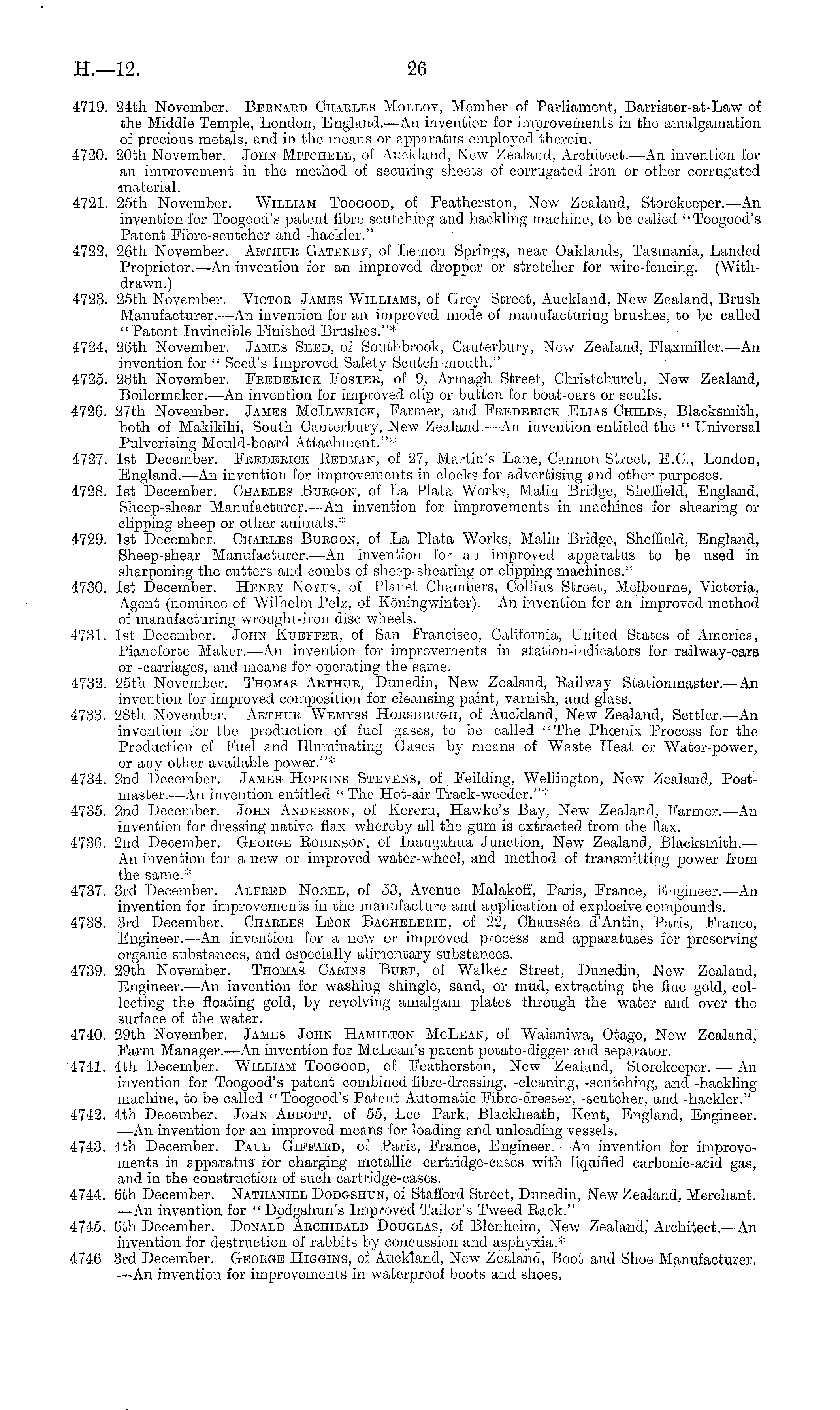 4719. 24th November. Bernard Charles Molloy, Member of Parliament, Barrister-at-Law of the Middle Temple, London, England.—An invention for improvements in the amalgamation of precious metals, and in the means or apparatus employed therein. 4720. 20th November. John Mitchell, of Auckland, New Zealand, Architect.—An invention for an improvement in the method of securing sheets of corrugated iron or other corrugated ■material. 4721. 25th November. William Toogood, of Featherston, New Zealand, Storekeeper.—An invention for Toogood's patent fibre scutching and hackling machine, to be called "Toogood's Patent Fibre-scutcher and -hackler." 4722. 26th November. Arthur Gatenby, of Lemon Springs, near Oaklancls, Tasmania, Landed Proprietor.—An invention for an improved dropper or stretcher for wire-fencing. (Withdrawn.) 4723. 25th November. Victor James Williams, of Grey Street, Auckland, New Zealand, Brush Manufacturer. —An invention for an improved mode of manufacturing brushes, to be called " Patent Invincible Finished Brushes."* 4724. 26th November. James Seed, of Southbrook, Canterbury, New Zealand, Flaxmiller.—An invention for " Seed's Improved Safety Scutch-mouth." 4725. 28th November. Frederick Foster, of 9, Armagh Street, Christchurch, New Zealand, Boilermaker. —An invention for improved clip or button for boat-oars or sculls. 4726. 27th November. James Mcllwrick, Farmer, and Frederick Elias Childs, Blacksmith, both of Makikihi, South Canterbury, New Zealand. —An invention entitled the " Universal Pulverising Mould-board Attachment."* 4727. Ist December. Frederick Eedman, of 27, Martin's Lane, Cannon Street, E.C., London, England. —An invention for improvements in clocks for advertising and other purposes. 4728. Ist December. Charles Burgon, of La Plata Works, Malm Bridge, Sheffield, England, Sheep-shear Manufacturer. —An invention for improvements in machines for shearing or clipping sheep or other animals.* 4729. Ist December. Charles Burgon, of La Plata Works, Malm Bridge, Sheffield, England, Sheep-shear Manufacturer.—An invention for an improved apparatus to be used in sharpening the cutters and combs of sheep-shearing or clipping machines. * 4730. Ist December. Henry Noyes, of Planet Chambers, Collins Street, Melbourne, Victoria, Agent (nominee of Wilhelm Pelz, of Koningwinter). —An invention for an improved method of manufacturing wrought-iron disc wheels. 4731. Ist December. John Kueffer, of San Francisco, California, United States of America, Pianoforte Maker. —An invention for improvements in station-indicators for railway-cars or -carriages, and means for operating the same. 4732. 25th November. Thomas Arthur, Dunedin, New Zealand, Eailway Stationmaster.— An invention for improved composition for cleansing paint, varnish, and glass. 4733. 28th November. Arthur Wemyss Horsbrugh, of Auckland, New Zealand, Settler. —An invention for the production of fuel gases, to be called " The Phoenix Process for the Production of Fuel and Illuminating Gases by means of Waste Heat or Water-power, or any other available power."* 4734. 2nd December. James Hopkins Stevens, of Feilding, Wellington, New Zealand, Postmaster.—An invention entitled "The Hot-air Track-weeder."* 4735. 2nd December. John Anderson, of Kereru, Hawke's Bay, New Zealand, Farmer.—An invention for dressing native flax whereby all the gum is extracted from the flax. 4736. 2nd December. George Eobinson, of Inangahua Junction, New Zealand, Blacksmith.— An invention for a new or improved water-wheel, and method of transmitting power from the same.* 4737. 3rd December. Alfred Nobel, of 53, Avenue Malakoff, Paris, France, Engineer.—An invention for improvements in the manufacture and application of explosive compounds. 4738. 3rd December. Charles LtioN Bachelerie, of 22, Chaussee d'Antin, Paris, France, Engineer.—An invention for a new or improved process and apparatuses for preserving organic substances, and especially alimentary substances. 4739. 29th November. Thomas Carins Burt, of Walker Street, Dunedin, New Zealand, Engineer.—An invention for washing shingle, sand, or mud, extracting the fine gold, collecting the floating gold, by revolving amalgam plates through the water and over the surface of the water. 4740. 29th November. James John Hamilton McLean, of Waianiwa, Otago, New Zealand, Farm Manager.—An invention for McLean's patent potato-digger and separator. 4741. 4th December. W tilliam Toogood, of Featherston, New Zealand, Storekeeper. —An invention for Toogood's patent combined fibre-dressing, -cleaning, -scutching, and -hackling machine, to be called "Toogood's Patent Automatic Fibre-dresser, -scutcher, and -hackler." 4742. 4th December. John Abbott, of 55, Lee Park, Blackheath, Kent, England, Engineer. —An invention for an improved means for loading and unloading vessels. 4743. 4th December. Paul Giffard, of Paris, France, Engineer.—An invention for improvements in apparatus for charging metallic cartridge-cases with liquified carbonic-acid gas, and in the construction of such cartridge-cases. 4744. 6th December. Nathaniel Dodgshun, of Stafford Street, Dunedin, New Zealand, Merchant. —An invention for " Dpdgshun's Improved Tailor's Tweed Back." 4745. 6th December. Donald Archibald Douglas, of Blenheim, New Zealand," Architect.—An invention for destruction of rabbits by concussion and asphyxia.* 4746 3rd December. George Higgins, of Auckland, New Zealand, Boot and Shoe Manufacturer. —An invention for improvements in waterproof boots and shoes,