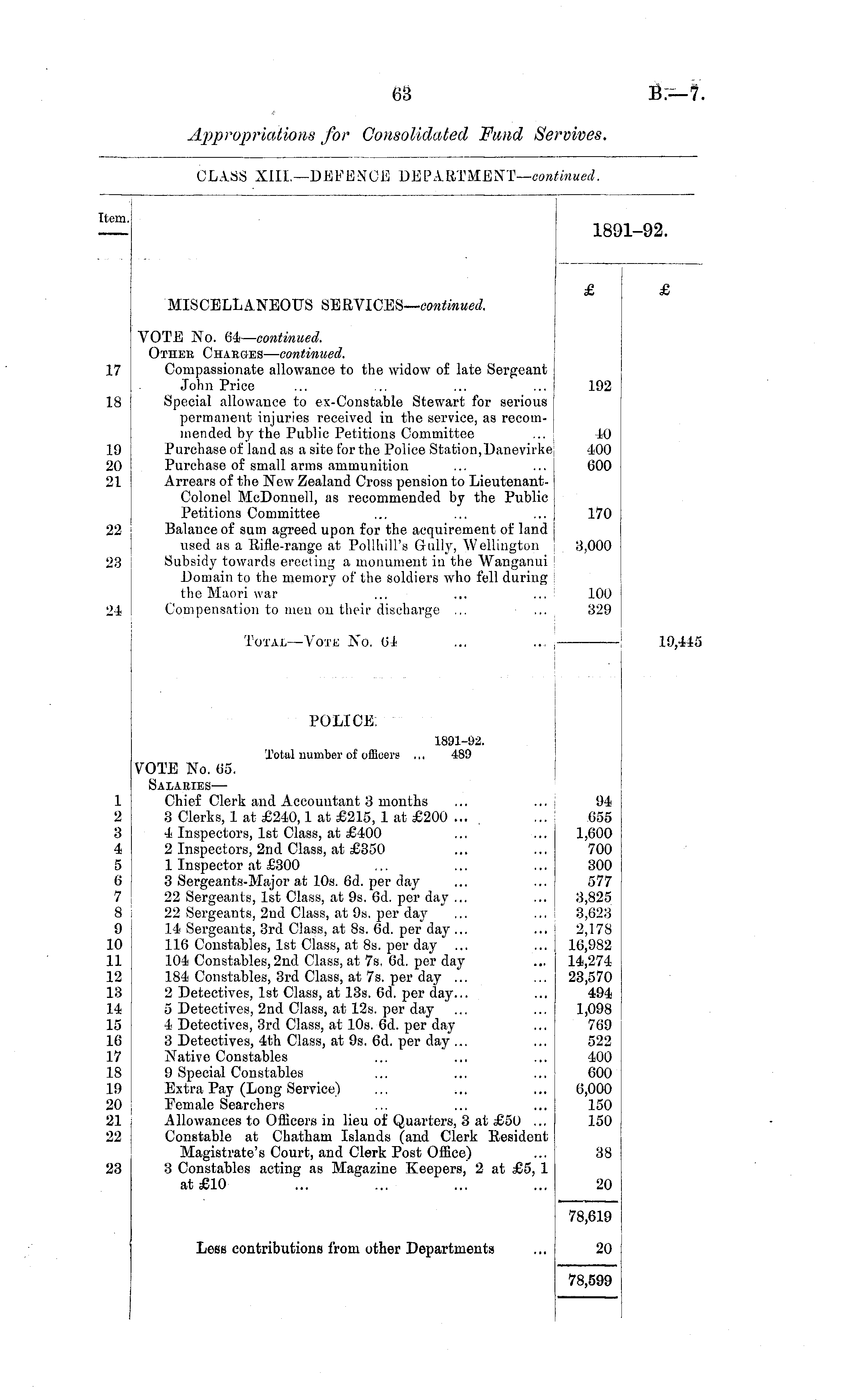item. 1891-92. MISCELLANEOUS SERVICES— continued. 17 IS 19 20 21 VOTE No. 64— continued. Other Chabqbs— continued. Compassionate allowance to the widow of late Sergeant John Price ... ... ... ... Special allowance to ex-Constable Stewart for serious I permanent injuries received in the service, as recom- j mended by the Public Petitions Committee Purchase of land as a site for the Police Station,Danevirke, Purchase of small arms ammunition ... ... Arrears of the New Zealand Cross pension to LieutenantColonel McDonnell, as recommended by the Public Petitions Committee ... ... ... Balance of sum agreed upon for the acquirement of land used as a Rifle-range at Pollhill's Gully, Wellington Subsidy towards erecting a monument in the Wanganui Domain to the memory of the soldiers who fell during the Maori war Compensation to men on their discharge ... 192 40 400 600 170 22 3,000 28 100 829 24 Total —Vote No, 64 19,44 POLICE. 1891-92. Total number of officers ... 489 1 2 3 4 5 6 7 8 9 10 11 12 13 14 15 16 17 18 1!) 20 21 22 VOTE No. 65. Salaries — Chief Clerk and Accountant 3 months 3 Clerks, 1 at £240,1 at £215, 1 at £200 ... 4 Inspectors, 1st Class, at £400 2 Inspectors, 2nd Class, at £350 1 Inspector at £300 3 Sergeants-Major at 10s. 6d. per day 22 Sergeants, 1st Class, at 9s. 6d. per day ... 22 Sergeants, 2nd Class, at 9s. per day 14 Sergeants, 3rd Class, at 8s. 6d. per day ... 116 Constables, 1st Class, at 8s. per day ... 104 Constables, 2nd Class, at 7s, 6d. per day 184 Constables, 3rd Class, at 7s. per day ... 2 Detectives, 1st Class, at 13s. 6d. per day... 5 Detectives, 2nd Class, at 12s. per day 4 Detectives, 3rd Class, at 10s. 6d. per day 3 Detectives, 4th Class, at 9s. 6d. per day ... Native Constables 9 Special Constables Extra Pay (Long Service) Female Searchers Allowances to Officers in lieu of Quarters, 3 at £50 ... Constable at Chatham Islands (and Clerk Resident Magistrate's Court, and Clerk Post Office) 3 Constables acting as Magazine Keepers, 2 at £5, 1 at £10 94 655 1,600 700 300 577 8,825 3,623 2,178 16,982 14,274 23,570 494 1,098 769 522 400 600 6,000 150 150 38 23 20 78,619 Less contributions from other Departments 20 78,599
