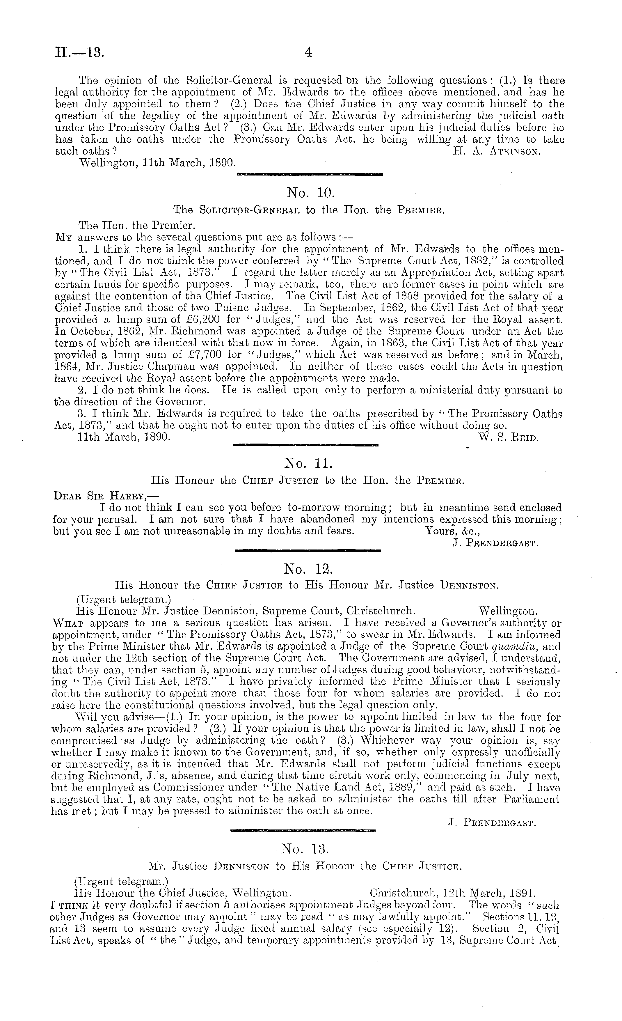 The opinion of the Solicitor-General is requested on the following questions : (1.) Is there legal authority for the appointment of Mr. Edwards to the offices above mentioned, and has he been duly appointed to them ? (2.) Does the Chief Justice in any way commit himself to the question of the legality of the appointment of Mr. Edwards by administering the judicial oath under the Promissory Oaths Act ? (3.) Can Mr. Edwards enter upon his judicial duties before he has taken the oaths under the Promissory Oaths Act, he being willing at any time to take such oaths ? PI. A. Atkinson. Wellington, 11th March, 1890.