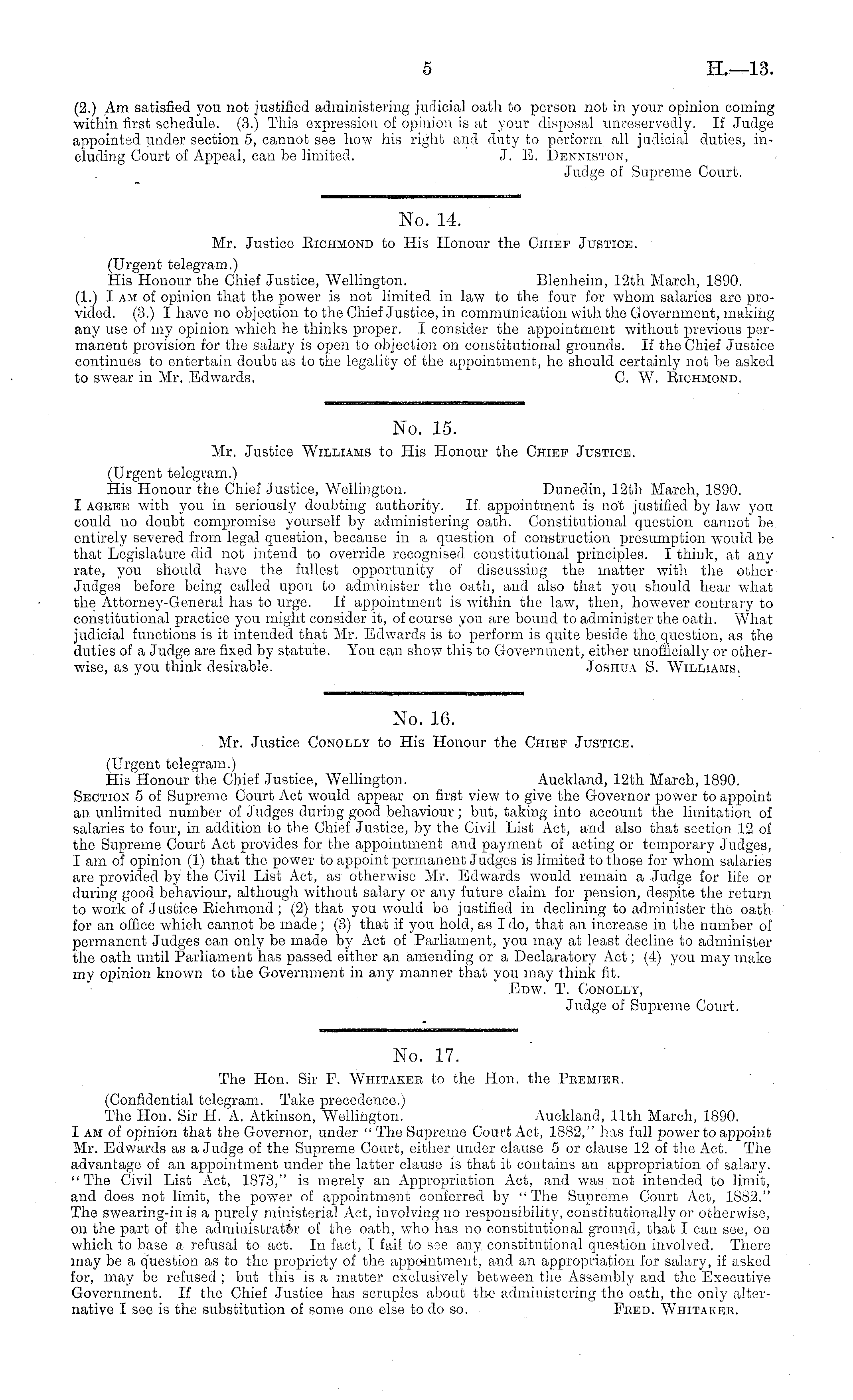 No. 14. Mr. Justice Richmond to His Honour the Chief Justice. (Urgent telegram.) His Honour the Chief Justice, Wellington. Blenheim, 12th March, 1890. (1.) I am of opinion that the power is not limited in law to the four for whom salaries are provided. (3.) I have no objection to the Chief Justice, in communication with the Government, making any use of my opinion which he thinks proper. I consider the appointment without previous permanent provision for the salary is open to objection on constitutional grounds. If the Chief Justice continues to entertain doubt as to the legality of the appointment, he should certainly not bo asked to swear in Mr. Edwards. C. W. Richmond.
