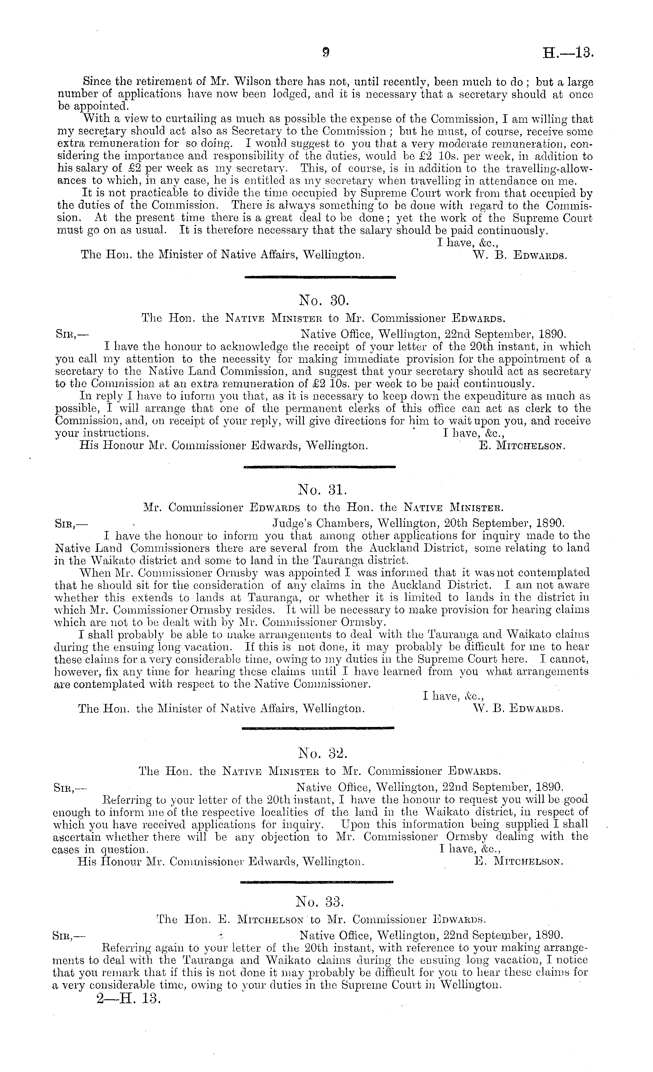 No. 33. The Hon. B. Mitchelson "to Mr. Commissioner Edwards. Sir, — Native Office, Wellington, 22nd September, 1890. Referring again to your letter of the 20th instant, with reference to your making arrangements to deal with the Tauranga and Waikato claims during the ensuing long vacation, I notice that you remark that if this is not done it may probably be difficult for you to hear these claims for a very considerable time, owing to your duties in the Supreme Court in Wellington. 2—H. 13.