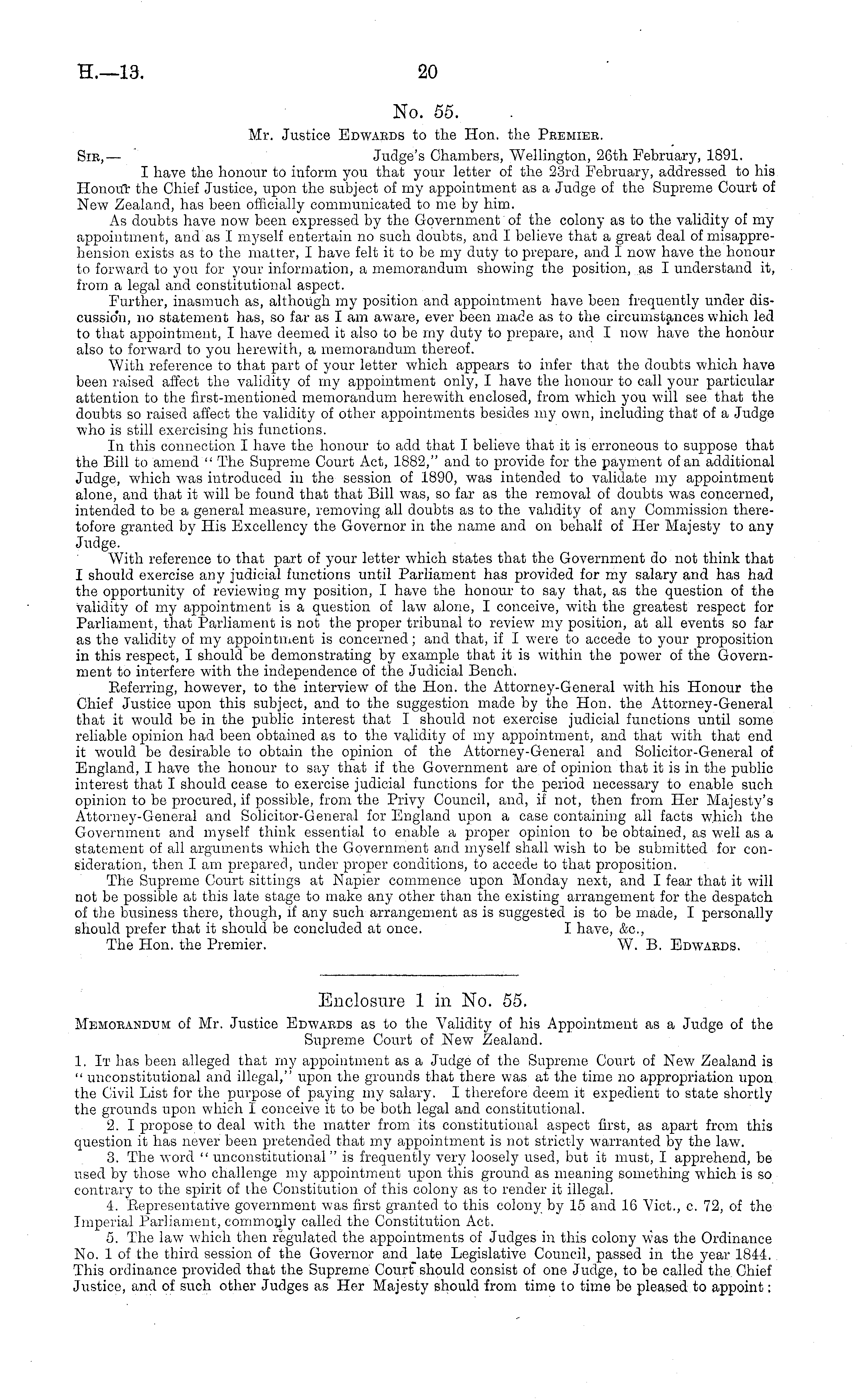 No. 55. Mr. Justice Edwaeds to the Hon. the Premier. Sir, — Judge's Chambers, Wellington, 26th February, 1891. I have the honour to inform you that your letter of the 23rd February, addressed to his Honouj the Chief Justice, upon the subject of my appointment as a Judge of the Supreme Court of New Zealand, has been officially communicated to me by him. As doubts have now been expressed by the Government of the colony as to the validity of my appointment, and as I myself entertain no such doubts, and 1 believe that a great deal of misapprehension exists as to the matter, I have felt it to be my duty to prepare, and I now have the honour to forward to you for your information, a memorandum showing the position, as I understand it, from a legal and constitutional aspect. Further, inasmuch as, although my position and appointment have been frequently under discussion, no statement has, so far as I am aware, ever been made as to the circumstances which led to that appointment, I have deemed it also to be my duty to prepare, and I now have the honour also to forward to you herewith, a memorandum thereof. With reference to that part of your letter which appears to infer that the doubts which have been raised affect the validity of my appointment only, I have the honour to call your particular attention to the first-mentioned memorandum herewith enclosed, from which you will see that the doubts so raised affect the validity of other appointments besides my own, including that of a Judge who is still exercising his functions. In this connection I have the honour to add that I believe that it is erroneous to suppose that the Bill to amend " The Supreme Court Act, 1882," and to provide for the payment of an additional Judge, which was introduced in the session of 1890, was intended to validate my appointment alone, and that it will be found that that Bill was, so far as the removal of doubts was concerned, intended to be a general measure, removing all doubts as to the validity of any Commission theretofore granted by His Excellency the Governor in the name and on behalf of Her Majesty to any Judge. With reference to that part of your letter which states that the Government do not think that I should exercise any judicial functions until Parliament has provided for my salary and has had the opportunity of reviewing my position, I have the honour to say that, as the question of the validity of my appointment is a question of law alone, I conceive, with the greatest respect for Parliament, that Parliament is not the proper tribunal to review my position, at all events so far as the validity of my appointment is concerned; and that, if I were to accede to your proposition in this respect, I should be demonstrating by example that it is within the power of the Government to interfere with the independence of the Judicial Bench. Referring, however, to the interview of the Hon. the Attorney-General with his Honour the Chief Justice upon this subject, and to the suggestion made by the Hon. the Attorney-General that it would be in the public interest that I should not exercise judicial functions until some reliable opinion had been obtained as to the validity of my appointment, and that with that end it would be desirable to obtain the opinion of the Attorney-General and Solicitor-General of England, I have the honour to say that if the Government are of opinion that it is in the public interest that I should cease to exercise judicial functions for the period necessary to enable such opinion to be procured, if possible, from the Privy Council, and, if not, then from Her Majesty's Attorney-General and Solicitor-General for England upon a case containing all facts which the Government and myself think essential to enable a proper opinion to be obtained, as well as a statement of all arguments which the Government and myself shall wish to be submitted for consideration, then I am prepared, under proper conditions, to accede to that proposition. The Supreme Court sittings at Napier commence upon Monday next, and I fear that it will not be possible at this late stage to make any other than the existing arrangement for the despatch of the business there, though, if any such arrangement as is suggested is to be made, I personally should prefer that it should be concluded at once. I have, &c, The Hon. the Premier. W. B. Edwards.